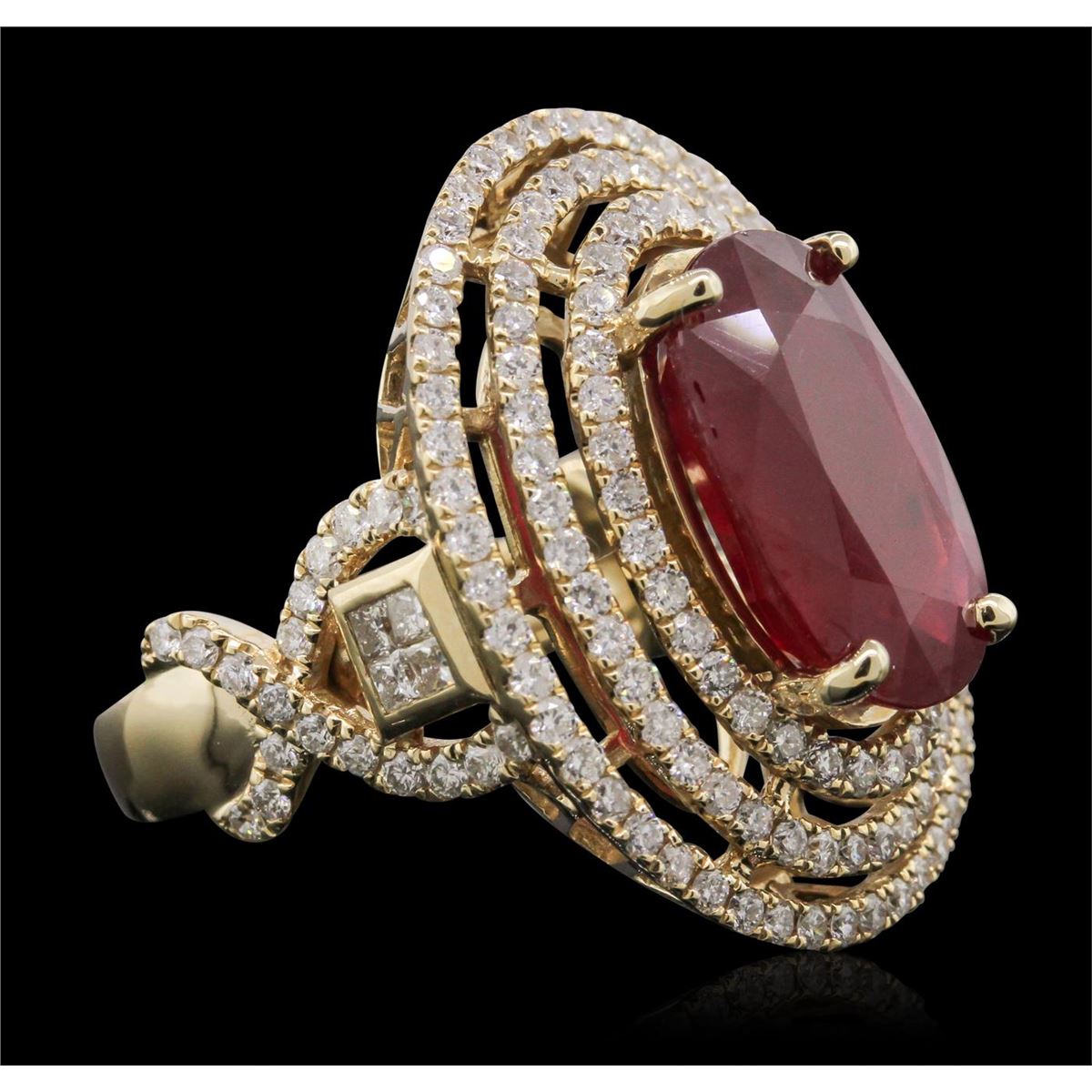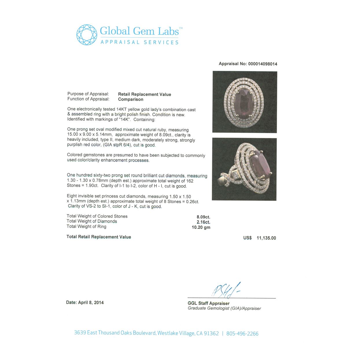 One electronically tested 14KT yellow gold Ladies combination cast & assembled ring with a bright polish finish. Condition is new. Identified with markings of "14K". Containing: One prong set oval modified mixed cut natural ruby, measuring 15.00 x 9.00 x 5.14mm, approximate weight of 8.09ct., clarity is heavily included, type II, medium dark, moderately strong, strongly purplish red color, (GIA stpR 6/4), cut is good. Colored gemstones are presumed to have been subjected to commonly used color/clarity enhancement processes. One Hundred Sixty-Two prong set round brilliant cut diamonds, measuring 1.30 - 1.30 x 0.78mm (depth est.) approximate. Total Weight of 162 Stones = 1.90ct. Clarity: I-1 to I-2. Color: H - I, Cut is Good. Eight invisible set princess cut diamonds, measuring 1.50 x 1.50 x 1.13mm (depth est.) approximate. Total Weight of 8 Stones = 0.26ct. Clarity: VS-2 to SI-1. Color: J - K, Cut is Good. Total Weight of Colored Stones 8.09ct. Total Weight of Diamonds 2.16ct. Total Weight of Ring 10.20 grams. GGL Appraised at $11,135.00.