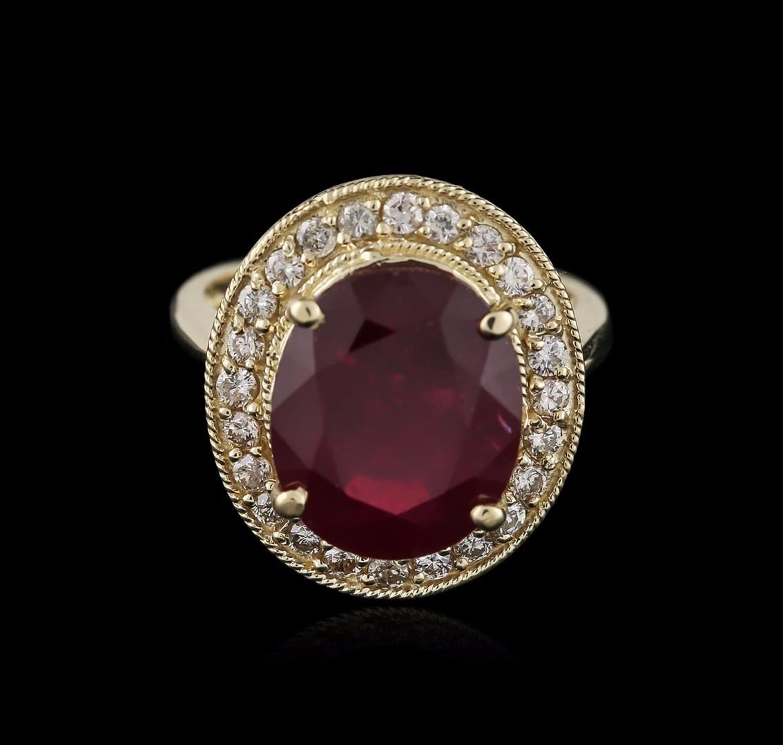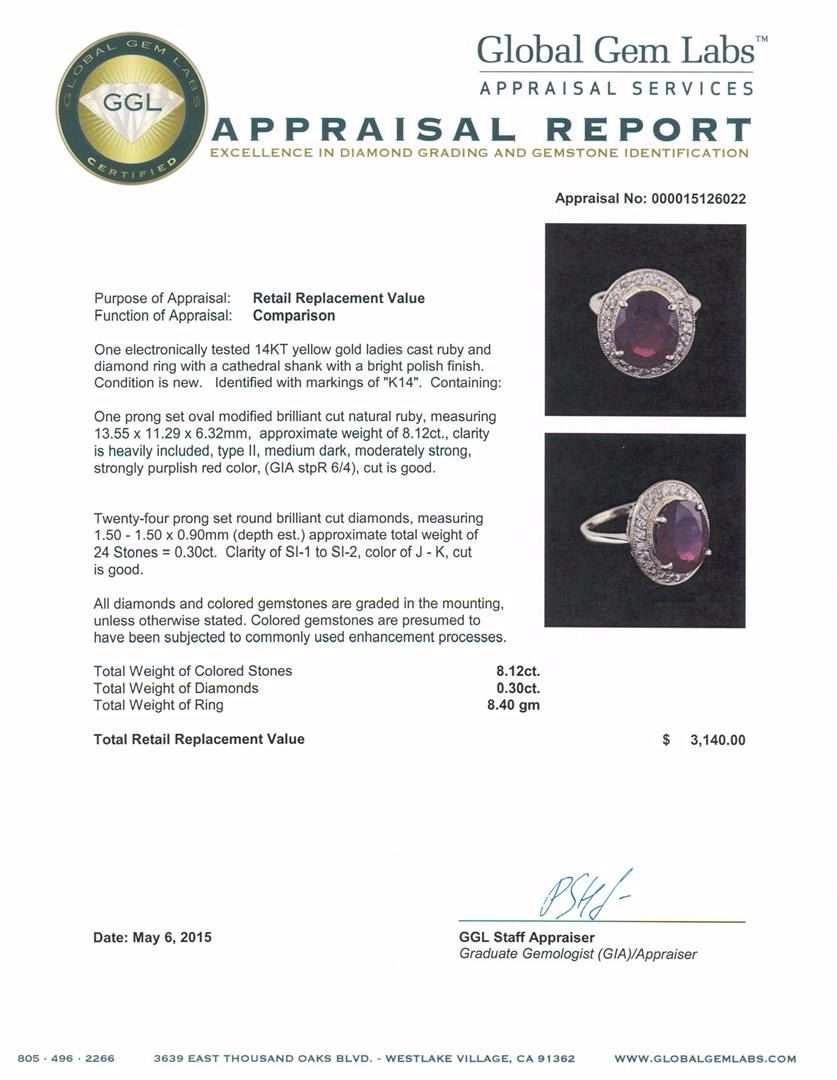One electronically tested 14KT yellow gold ladies cast ruby and diamond ring with a cathedral shank with a bright polish finish. Identified with markings of "K14". Condition is new. Containing: One prong set oval modified brilliant cut natural ruby, measuring 13.55 x 11.29 x 6.32mm, approximate weight of 8.12ct., clarity is heavily included, type II, medium dark, moderately strong, strongly purplish red color, (GIA stpR 6/4), cut is good. Twenty-Four prong set round brilliant cut diamonds, measuring 1.50 - 1.50 x 0.90mm (depth est.) approximate total weight of 24 Stones = 0.30ct. Clarity: SI-1 to SI-2. Color: J - K, Cut is Good. All diamonds and colored gemstones are graded in the mounting, unless otherwise stated. Colored gemstones are presumed to have been subjected to commonly used enhancement processes. Total Weight of Colored Stones 8.12ct. Total Weight of Diamonds 0.30ct. Total Weight of Ring 8.40 grams. GGL Appraised at $3,140.00.