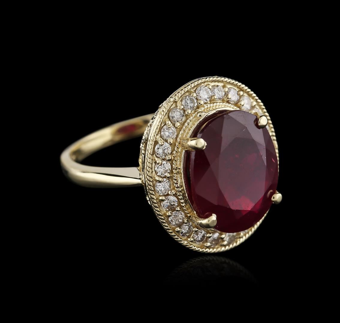 One electronically tested 14KT yellow gold ladies cast ruby and diamond ring with a cathedral shank with a bright polish finish. Identified with markings of "K14". Condition is new. Containing: One prong set oval modified brilliant cut natural ruby, measuring 13.55 x 11.29 x 6.32mm, approximate weight of 8.12ct., clarity is heavily included, type II, medium dark, moderately strong, strongly purplish red color, (GIA stpR 6/4), cut is good. Twenty-Four prong set round brilliant cut diamonds, measuring 1.50 - 1.50 x 0.90mm (depth est.) approximate total weight of 24 Stones = 0.30ct. Clarity: SI-1 to SI-2. Color: J - K, Cut is Good. All diamonds and colored gemstones are graded in the mounting, unless otherwise stated. Colored gemstones are presumed to have been subjected to commonly used enhancement processes. Total Weight of Colored Stones 8.12ct. Total Weight of Diamonds 0.30ct. Total Weight of Ring 8.40 grams. GGL Appraised at $3,140.00.