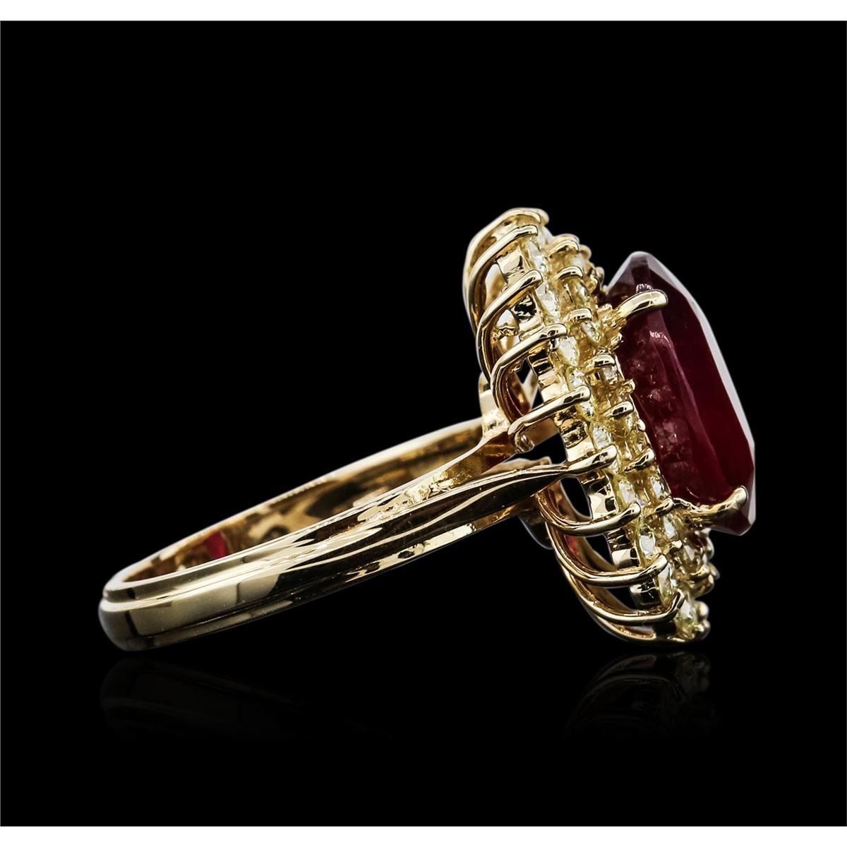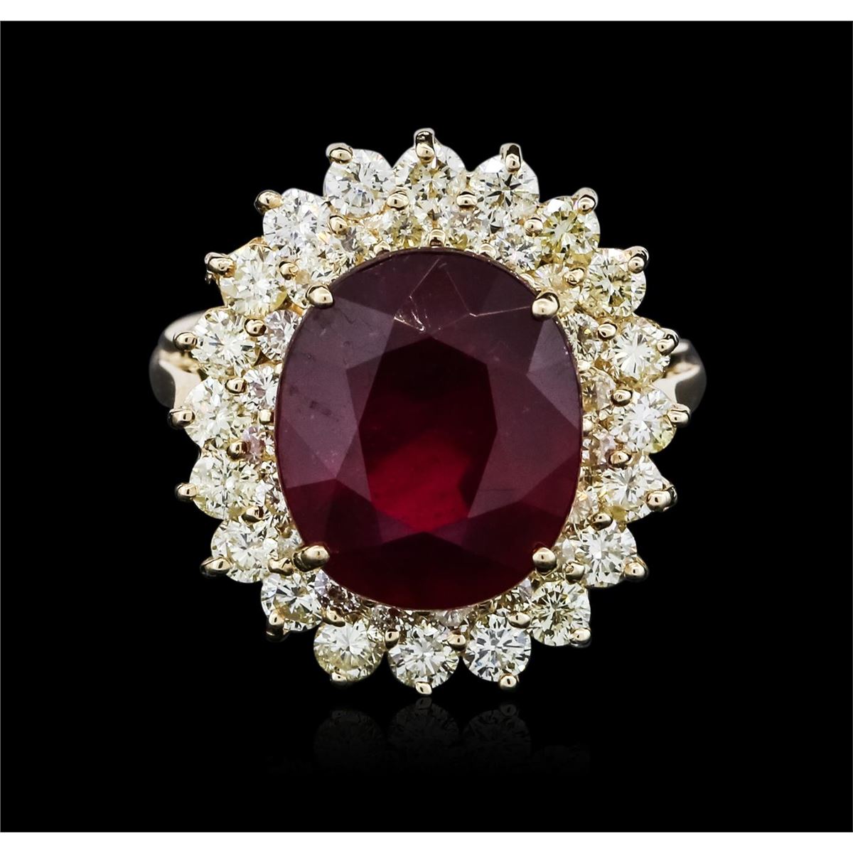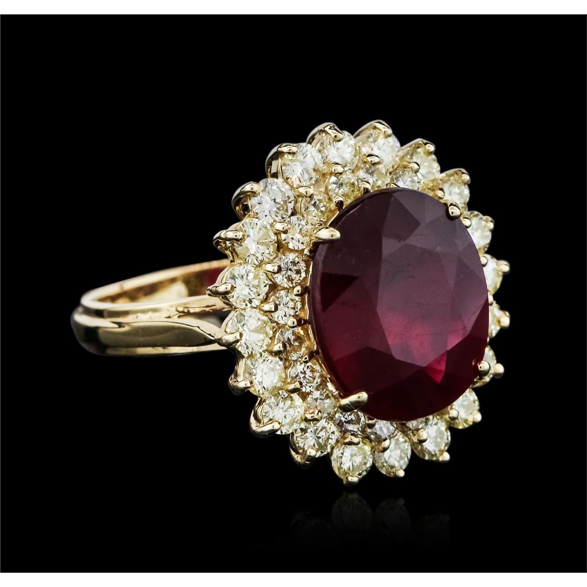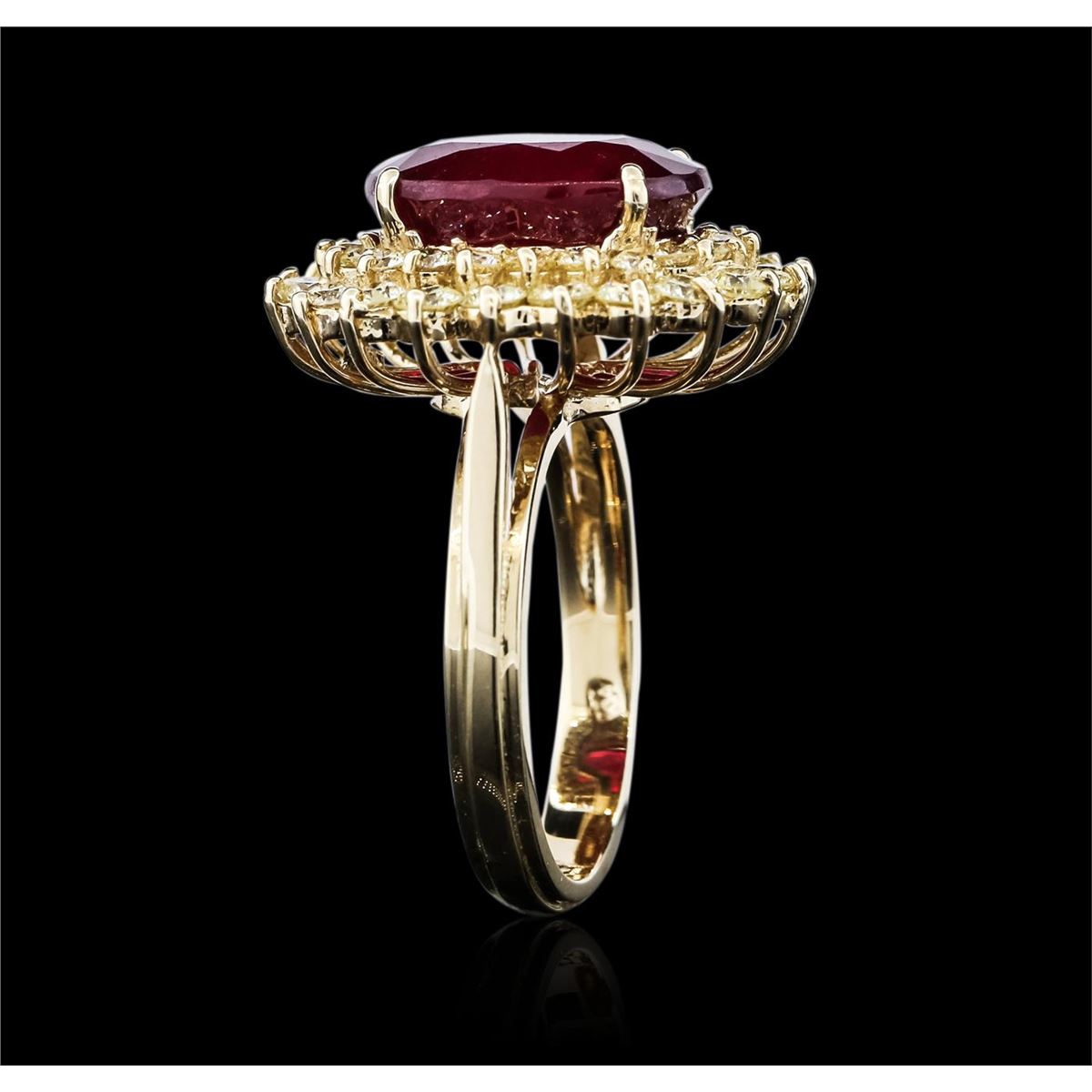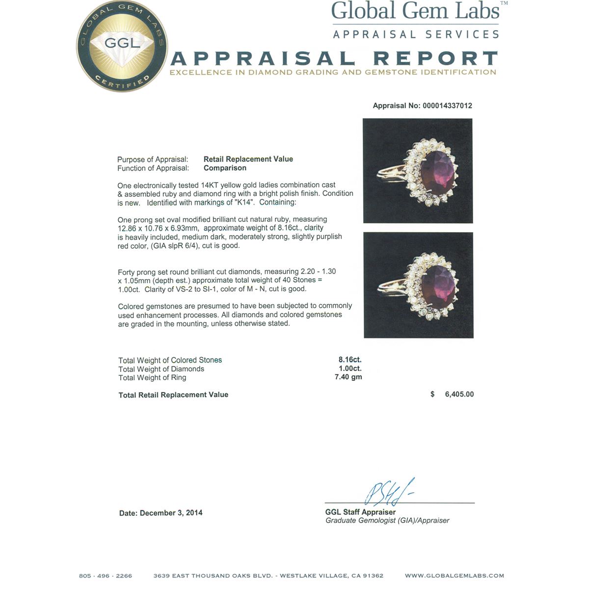 One electronically tested 14KT yellow gold ladies combination cast & assembled ruby and diamond ring with a bright polish finish. Identified with markings of "K14". Condition is new. Containing: One prong set oval modified brilliant cut natural ruby, measuring 12.86 x 10.76 x 6.93mm, approximate weight of 8.16ct., clarity is heavily included, medium dark, moderately strong, slightly purplish red color, (GIA slpR 6/4), cut is good. Forty prong set round brilliant cut diamonds, measuring 2.20 - 1.30 x 1.05mm (depth est.) approximate total weight of 40 Stones = 1.00ct. Clarity: VS-2 to SI-1. Color: M - N, Cut is Good. Colored gemstones are presumed to have been subjected to commonly used enhancement processes. All diamonds and colored gemstones are graded in the mounting, unless otherwise stated. Total Weight of Colored Stones 8.16ct. Total Weight of Diamonds 1.00ct. Total Weight of Ring 7.40 grams. GGL Appraised at $6,405.00.