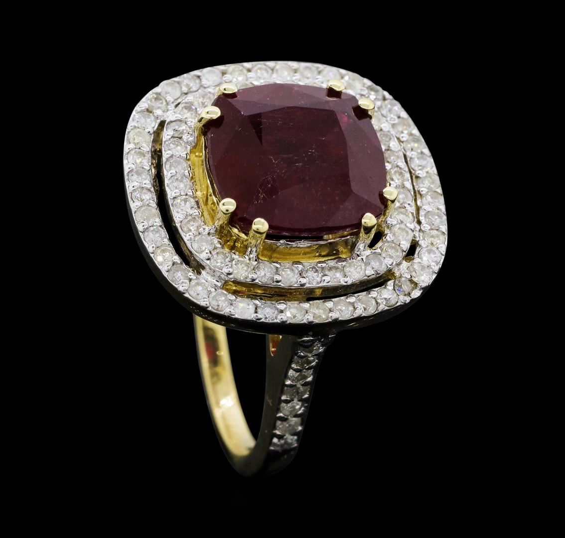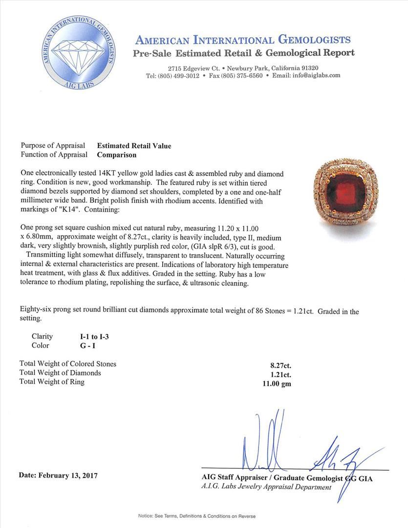 One electronically tested 14KT yellow gold ladies cast & assembled ruby and diamond ring. The featured ruby is set within tiered diamond bezels supported by diamond set shoulders, completed by a one and one-half millimeter wide band. Bright polish finish with rhodium accents. Identified with markings of "K14". Condition is new, good workmanship. Containing: One prong set square cushion mixed cut natural ruby, measuring 11.20 x 11.00 x 6.80mm, approximate weight of 8.27ct., clarity is heavily included, type II, medium dark, very slightly brownish, slightly purplish red color, (GIA slpR 6/3), cut is good. Transmitting light somewhat diffusely, transparent to translucent. Naturally occurring internal & external characteristics are present. Indications of laboratory high temperature heat treatment, with glass & flux additives. Graded in the setting. Ruby has a low tolerance to rhodium plating, repolishing the surface, & ultrasonic cleaning. Eighty-Six prong set round brilliant cut diamonds approximate total weight of 86 Stones = 1.21ct. Graded in the setting. Clarity: I-1 to I-3. Color: G - I. Total Weight of Colored Stones 8.27ct. Total Weight of Diamonds 1.21ct. Total Weight of Ring 11.00gm. AIG Appraised.