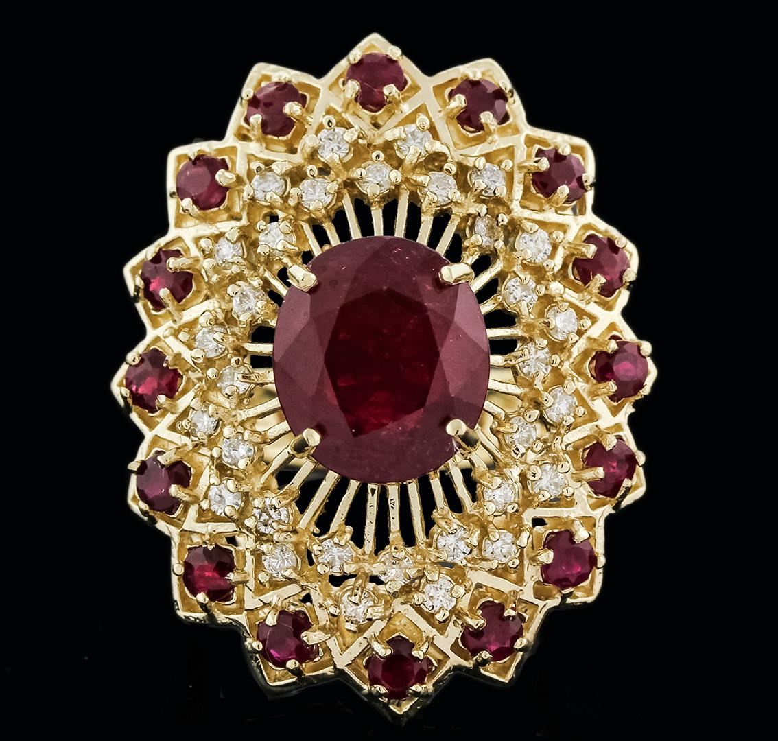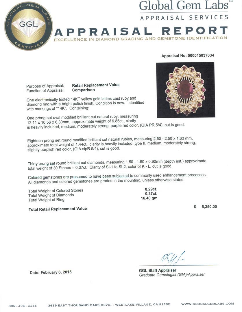 One electronically tested 14KT yellow gold ladies cast ruby and diamond ring with a bright polish finish. Identified with markings of "14K". Condition is new. Containing: One prong set oval modified brilliant cut natural ruby, measuring 12.11 x 10.56 x 6.30mm, approximate weight of 6.85ct., clarity is heavily included, medium, moderately strong, purple red color, (GIA PR 5/4), cut is good. Eighteen prong set round modified brilliant cut natural rubies, measuring 2.50 - 2.50 x 1.63 mm, approximate. Total Weight of 1.44ct., clarity is heavily included, type II, medium, moderately strong, slightly purplish red color, (GIA slpR 5/4), cut is good. Thirty prong set round brilliant cut diamonds, measuring 1.50 - 1.50 x 0.90mm (depth est.) approximate. Total Weight of 30 Stones = 0.37ct. Clarity: SI-1 to SI-2. Color: K - L, Cut is Good. Colored gemstones are presumed to have been subjected to commonly used enhancement processes. All diamonds and colored gemstones are graded in the mounting, unless otherwise stated. Total Weight of Colored Stones 8.29ct. Total Weight of Diamonds 0.37ct. Total Weight of Ring 16.40 grams. GGL Appraised at $5,350.00.