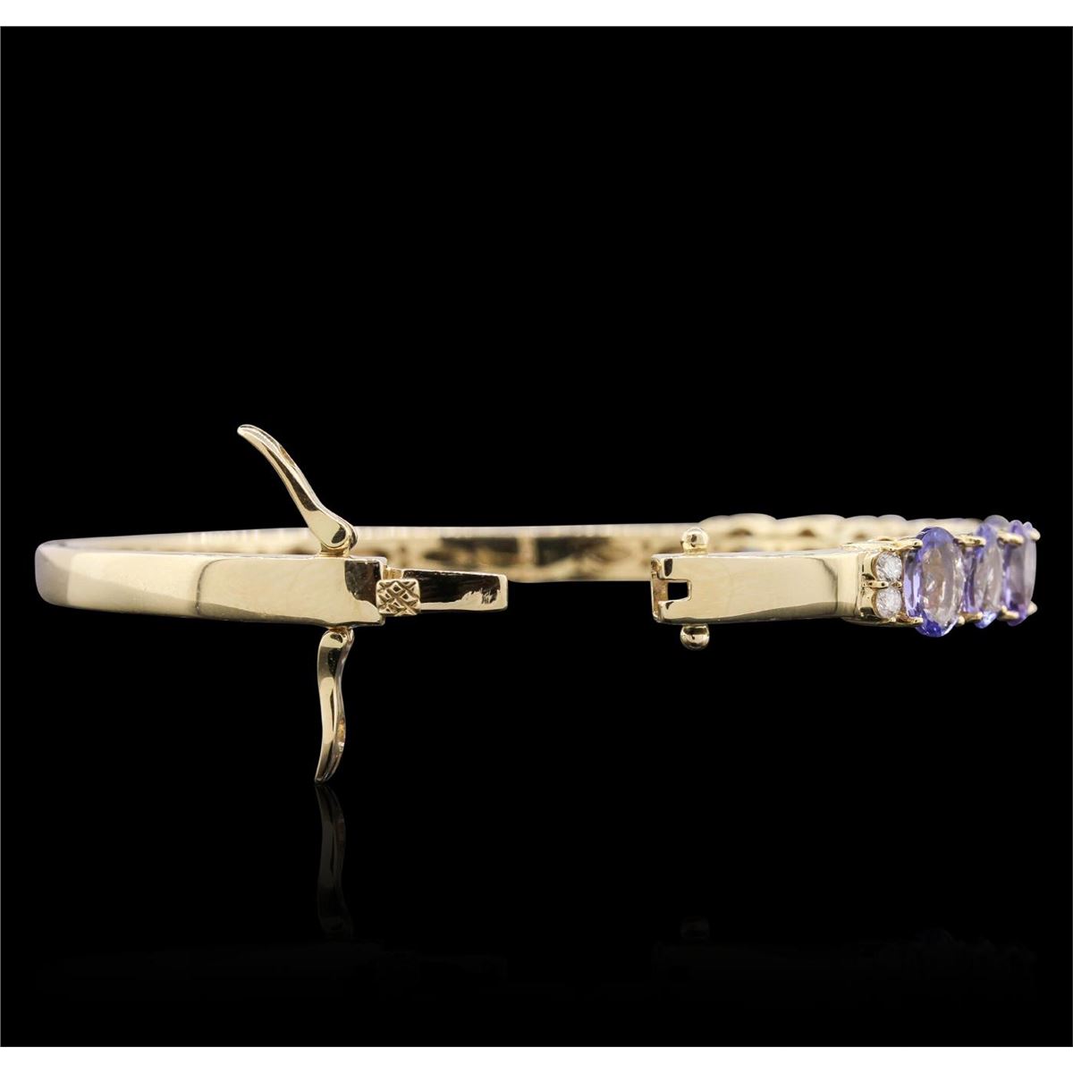 One electronically tested 14KT yellow gold ladies cast tanzanite and diamond bangle bracelet with a bright polish finish. Condition is new, good workmanship. Six and one-half inch length hinged bangle bracelet terminating in a concealed clasp with twin safeties. Identified with markings of "14K". Containing: Ten prong set oval mixed cut natural tanzanites, measuring 7.00 x 5.00 x 3.25mm, 6%. bulge factor, approximate. Total Weight of 8.30ct., clarity is eye clean, type I, medium, very slightly grayish, violet color, (GIA V 5/3), cut is good. Transmitting light with a minimum of distortion, transparent. Measurements & the color grade are an average for the group. Graded in the setting. Tanzanite is a very rare gemstone that is only found in the country of Tanzania. Originally discovered in 1967. Tiffany & Company, named the stone Tanzanite. It is found in the Usumburu Mountains that border the Umba Valley of northern Tanzania. Tanzanite occurs in gray, brown, violet, blue, reddish-purple, & green. The gem is interesting because of its exceptional pleochroism. Rotated in different directions a tanzanite will exhibit multiple changes of color. Tanzanite has a low tolerance to ultrasonic cleaning, and should not be cleaned using this method. Twenty prong set round brilliant cut diamonds, measuring 2.30 - 2.10 x 1.32mm (depth est.) approximate. Total Weight of 20 Stones = 0.87ct. Graded in the setting. Clarity: I-1 to I-2. Color: G - I. Total Weight of Colored Stones 8.30ct. Total Weight of Diamonds 0.87ct. Total Weight of Bangle Bracelet 19.90 grams. AIG Appraised at $9,630.00.
