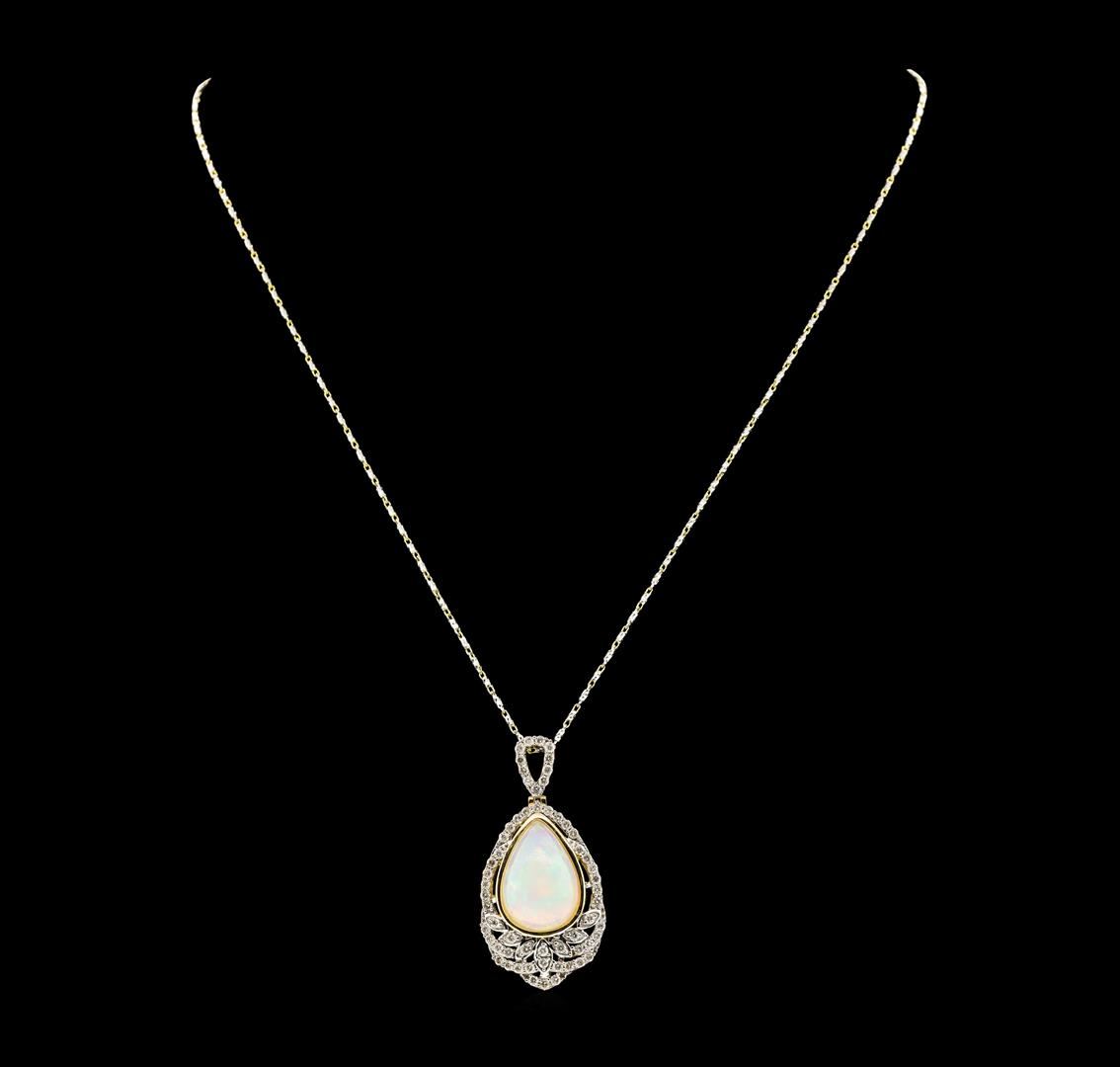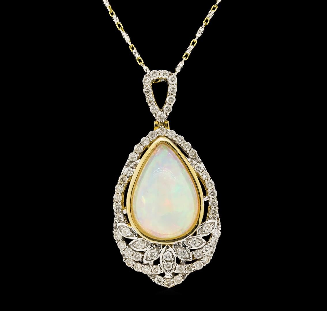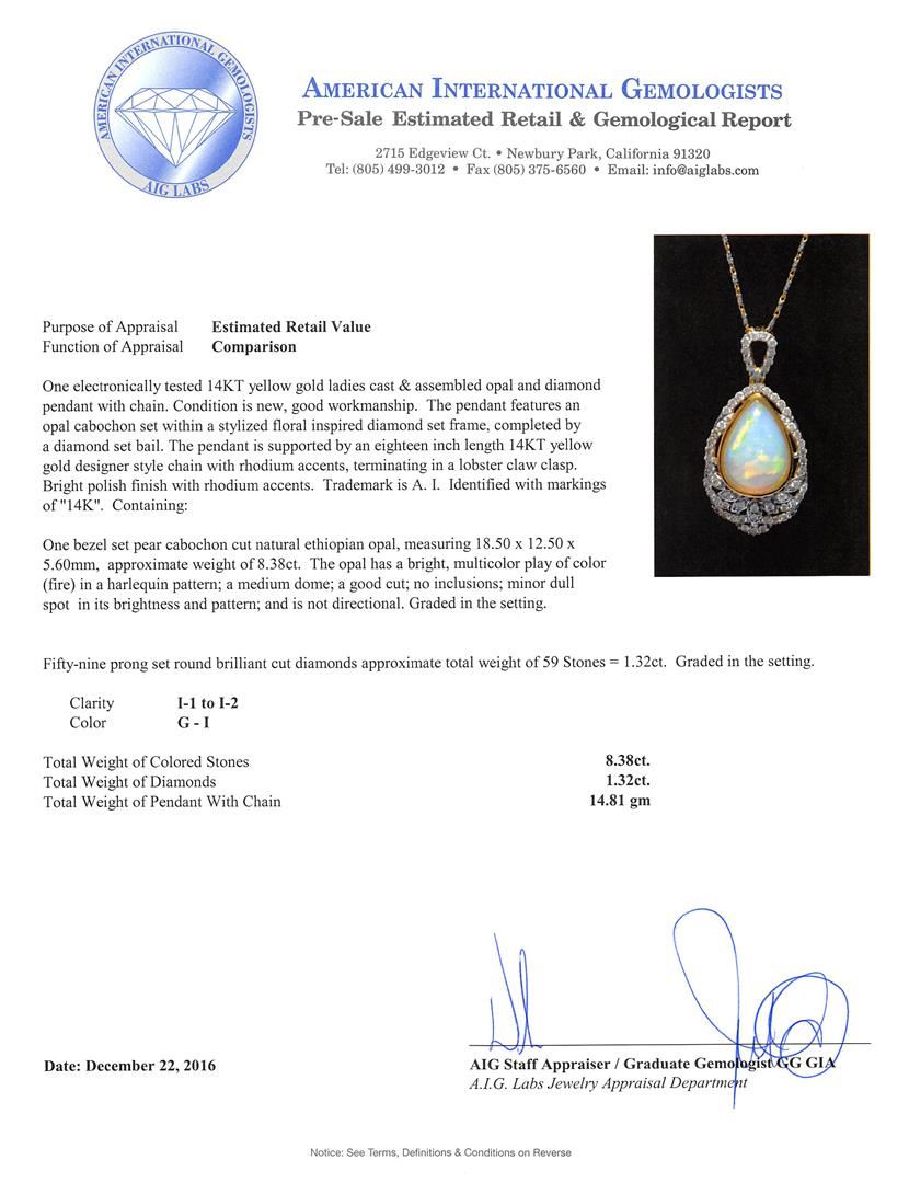 One electronically tested 14KT yellow gold ladies cast & assembled opal and diamond pendant with chain. The pendant features an opal cabochon set within a stylized floral inspired diamond set frame, completed by a diamond set bail. The pendant is supported by an eighteen inch length 14KT yellow gold designer style chain with rhodium accents, terminating in a lobster claw clasp. Bright polish finish with rhodium accents. Trademark is A. I. Identified with markings of "14K". Condition is new, good workmanship. Containing: One bezel set pear cabochon cut natural ethiopian opal, measuring 18.50 x 12.50 x 5.60mm, approximate weight of 8.38ct. The opal has a bright, multicolor play of color (fire) in a harlequin pattern; a medium dome; a good cut; no inclusions; minor dull spot in its brightness and pattern; and is not directional. Graded in the setting. Fifty-Nine prong set round brilliant cut diamonds approximate total weight of 59 Stones = 1.32ct. Graded in the setting. Clarity: I-1 to I-2. Color: G - I. Total Weight of Colored Stones 8.38ct. Total Weight of Diamonds 1.32ct. Total Weight of Pendant With Chain 14.81gm. AIG Appraised.
