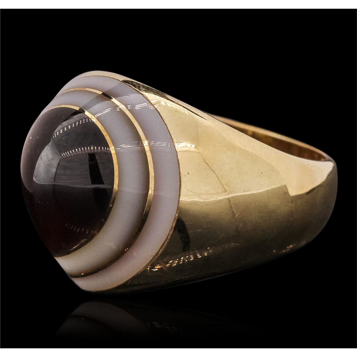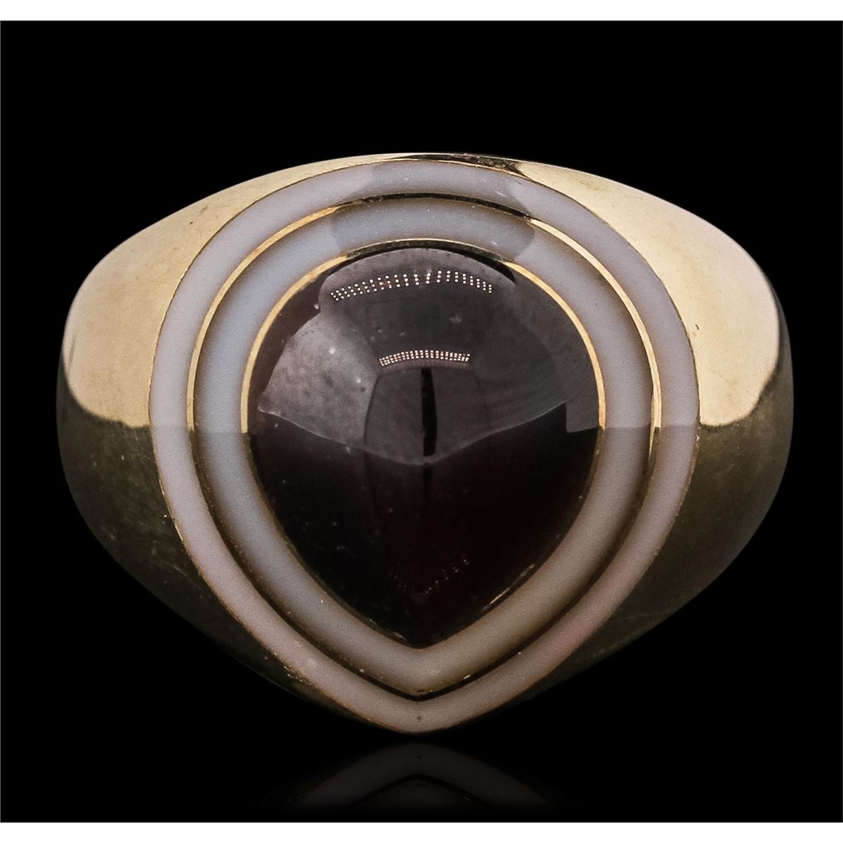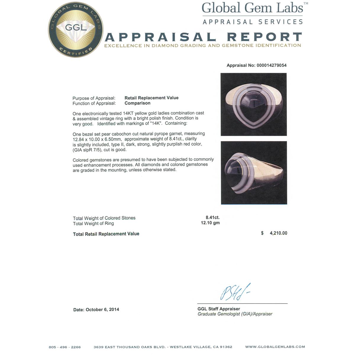 One electronically tested 14KT yellow gold ladies combination cast & assembled vintage ring with a bright polish finish. Identified with markings of "14K". Condition is very good. Containing: One bezel set pear cabochon cut natural pyrope garnet, measuring 12.84 x 10.00 x 6.50mm, approximate weight of 8.41ct., clarity is slightly included, type II, dark, strong, slightly purplish red color, (GIA slpR 7/5), cut is good. Colored gemstones are presumed to have been subjected to commonly used enhancement processes. All diamonds and colored gemstones are graded in the mounting, unless otherwise stated. Total Weight of Colored Stones 8.41ct. Total Weight of Ring 12.10 grams. GGL Appraised at $4,210.00.
