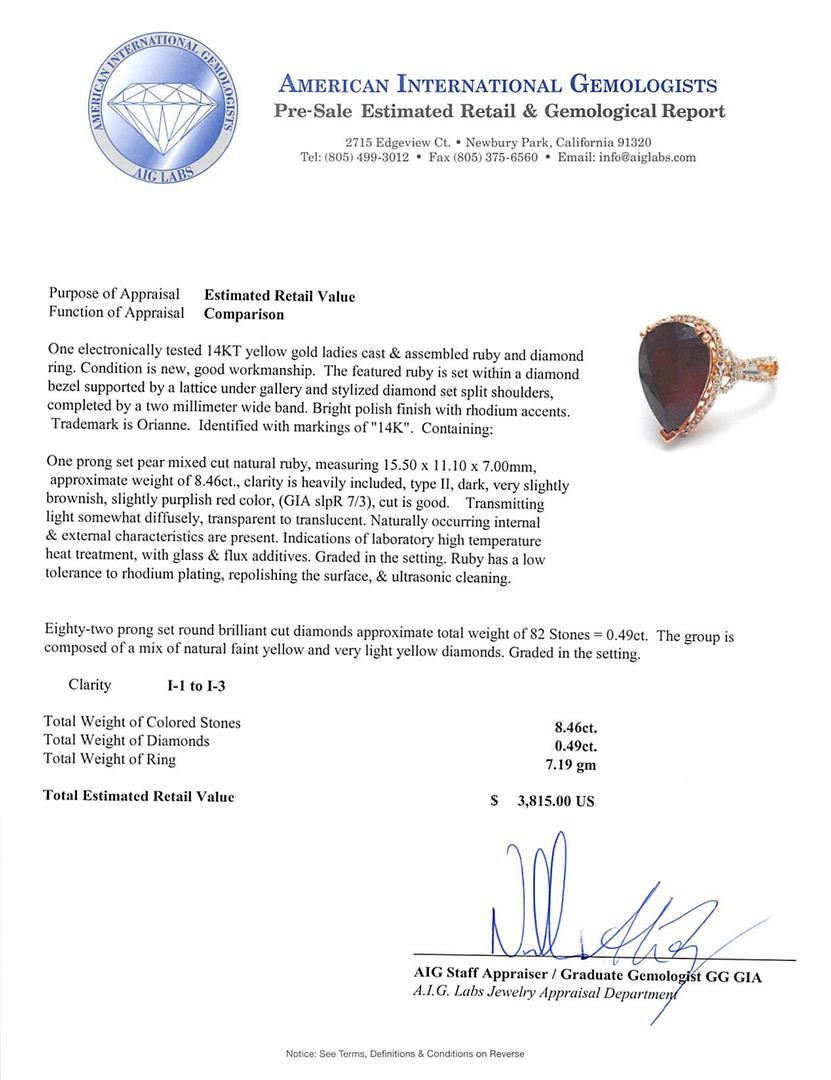 One electronically tested 14KT yellow gold ladies cast ruby and diamond ring. The featured ruby is supported by five diamond ribbons on either side and tapering shoulders, completed by a three millimeter wide band. Bright polish finish with rhodium accents. Trademark is Orianne. Identified with markings of "14K". Condition is new, good workmanship. Containing: One prong set oval mixed cut natural ruby, measuring 16.80 x 13.50 x 8.20mm, approximate weight of 16.99ct., clarity is heavily included, type II, dark, very slightly brownish, slightly purplish red color, (GIA slpR 7/3), cut is good. Transmitting light somewhat diffusely, transparent to translucent. Naturally occurring internal & external characteristics are present. Indications of laboratory high temperature heat treatment, with glass & flux additives. Graded in the setting. Ruby has a low tolerance to rhodium plating, repolishing the surface, & ultrasonic cleaning. One Hundred Fourteen prong set round brilliant cut diamonds approximate total weight of 114 Stones = 0.79ct. The color grade reflects the range of color for this group. Graded in the setting. Clarity: I-1 to I-3. Color: I - M. Total Weight of Colored Stones 16.99ct. Total Weight of Diamonds 0.79ct. Total Weight of Ring 9.25gm. AIG Appraised at $3,815.00.