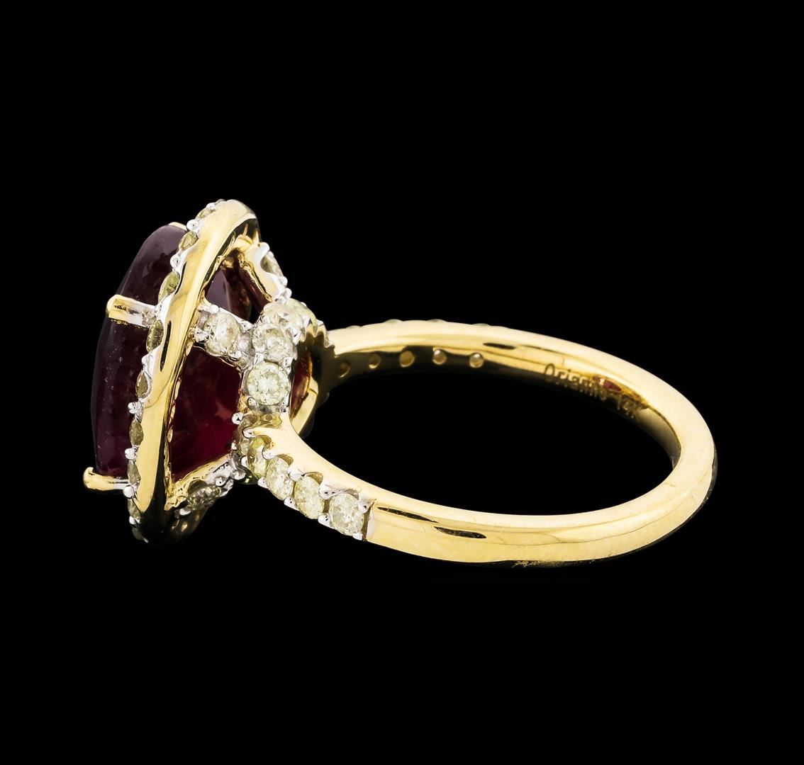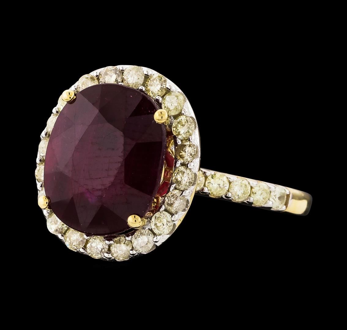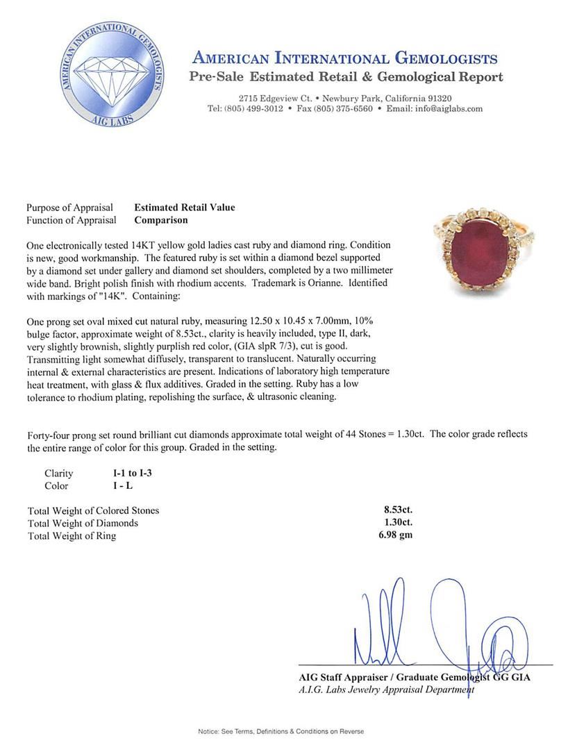 One electronically tested 14KT yellow gold ladies cast ruby and diamond ring. The featured ruby is set within a diamond bezel supported by a diamond set under gallery and diamond set shoulders, completed by a two millimeter wide band. Bright polish finish with rhodium accents. Trademark is Orianne. Identified with markings of "14K". Condition is new, good workmanship. Containing: One prong set oval mixed cut natural ruby, measuring 12.50 x 10.45 x 7.00mm, 10%. bulge factor, approximate weight of 8.53ct., clarity is heavily included, type II, dark, very slightly brownish, slightly purplish red color, (GIA slpR 7/3), cut is good. Transmitting light somewhat diffusely, transparent to translucent. Naturally occurring internal & external characteristics are present. Indications of laboratory high temperature heat treatment, with glass & flux additives. Graded in the setting. Ruby has a low tolerance to rhodium plating, repolishing the surface, & ultrasonic cleaning. Forty-Four prong set round brilliant cut diamonds approximate total weight of 44 Stones = 1.30ct. The color grade reflects the entire range of color for this group. Graded in the setting. Clarity: I-1 to I-3. Color: I - L. Total Weight of Colored Stones 8.53ct. Total Weight of Diamonds 1.30ct. Total Weight of Ring 6.98gm. AIG Appraised.