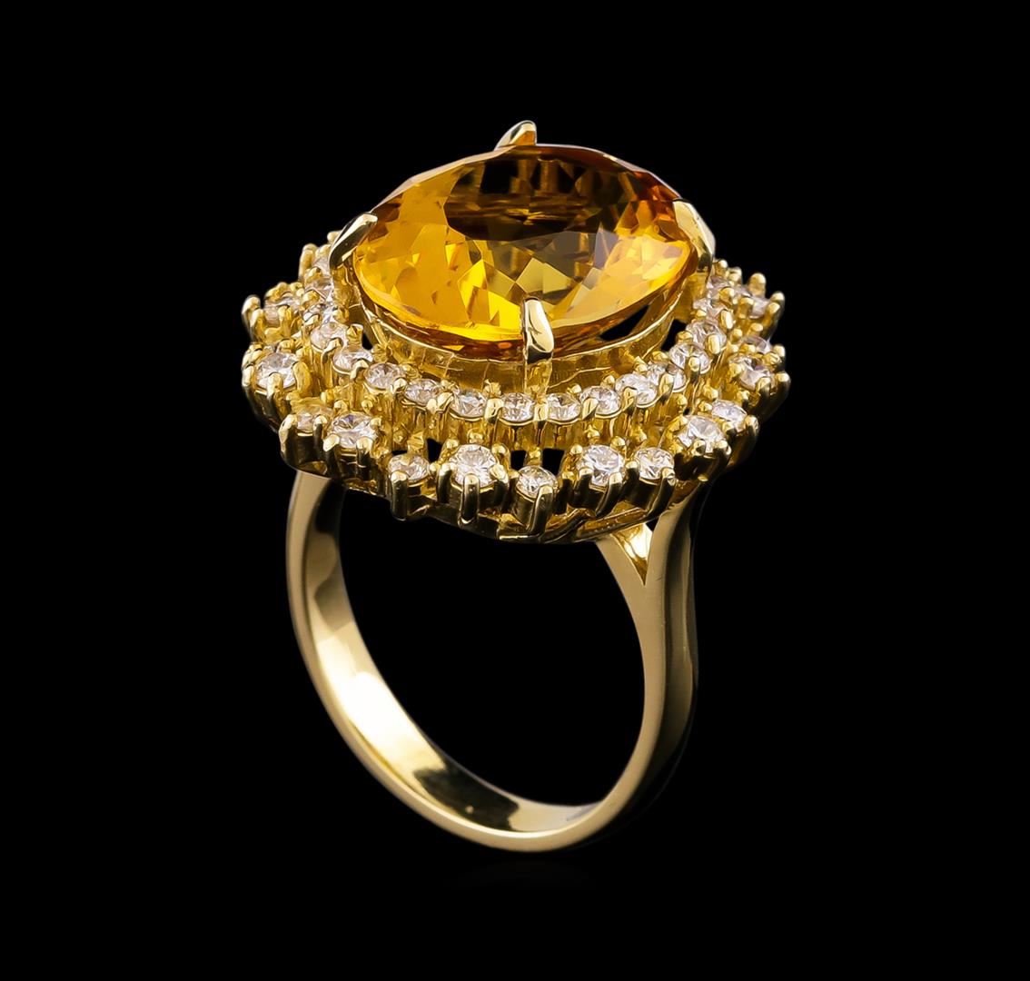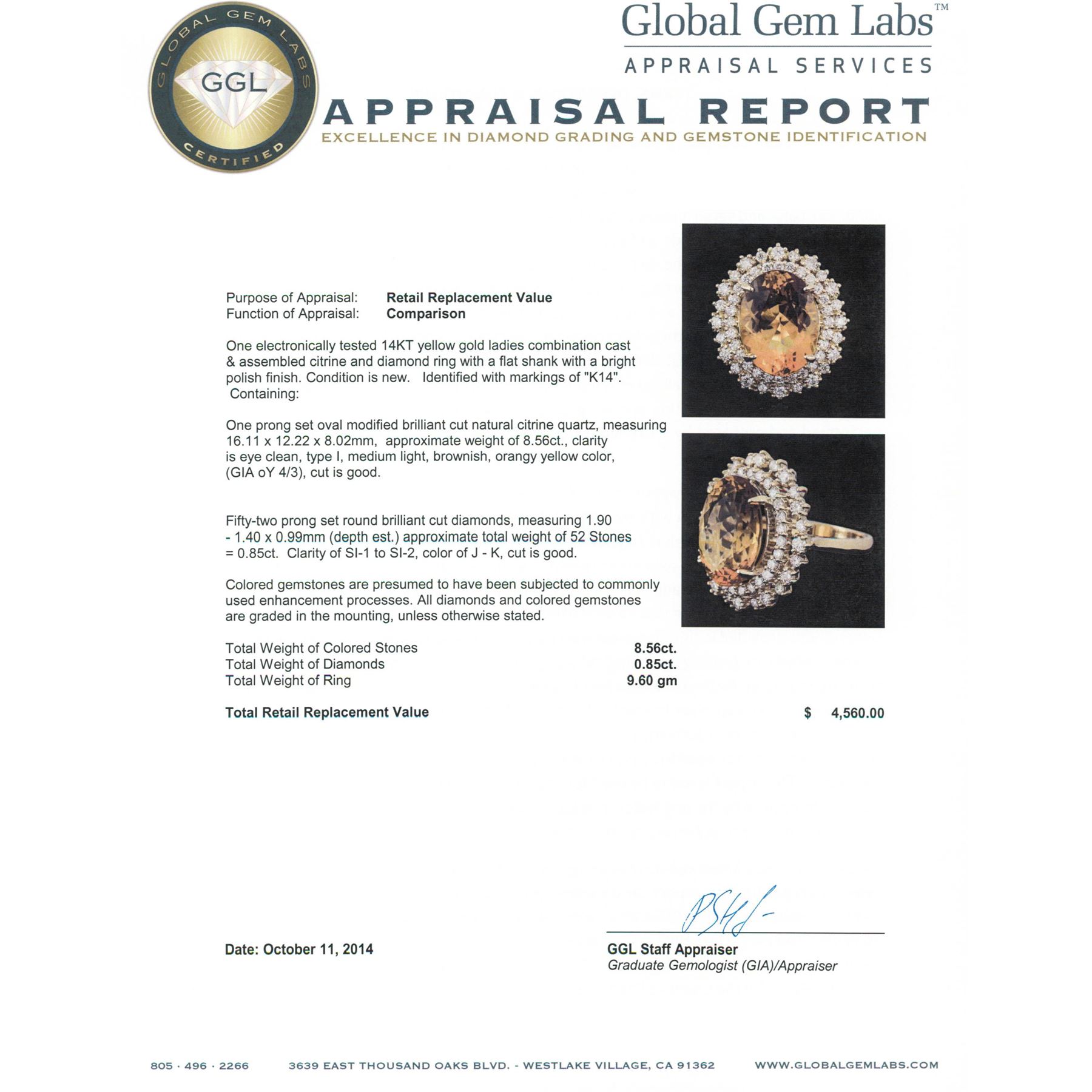One electronically tested 14KT yellow gold ladies combination cast & assembled citrine and diamond ring with a flat shank with a bright polish finish. Identified with markings of "K14". Condition is new. Containing: One prong set oval modified brilliant cut natural citrine quartz, measuring 16.11 x 12.22 x 8.02mm, approximate weight of 8.56ct., clarity is eye clean, type I, medium light, brownish, orangy yellow color, (GIA oY 4/3), cut is good. Fifty-Two prong set round brilliant cut diamonds, measuring 1.90 - 1.40 x 0.99mm (depth est.) approximate total weight of 52 Stones = 0.85ct. Clarity: SI-1 to SI-2. Color: J - K, Cut is Good. Colored gemstones are presumed to have been subjected to commonly used enhancement processes. All diamonds and colored gemstones are graded in the mounting, unless otherwise stated. Total Weight of Colored Stones 8.56ct. Total Weight of Diamonds 0.85ct. Total Weight of Ring 9.60 grams. GGL Appraised at $4,560.00.