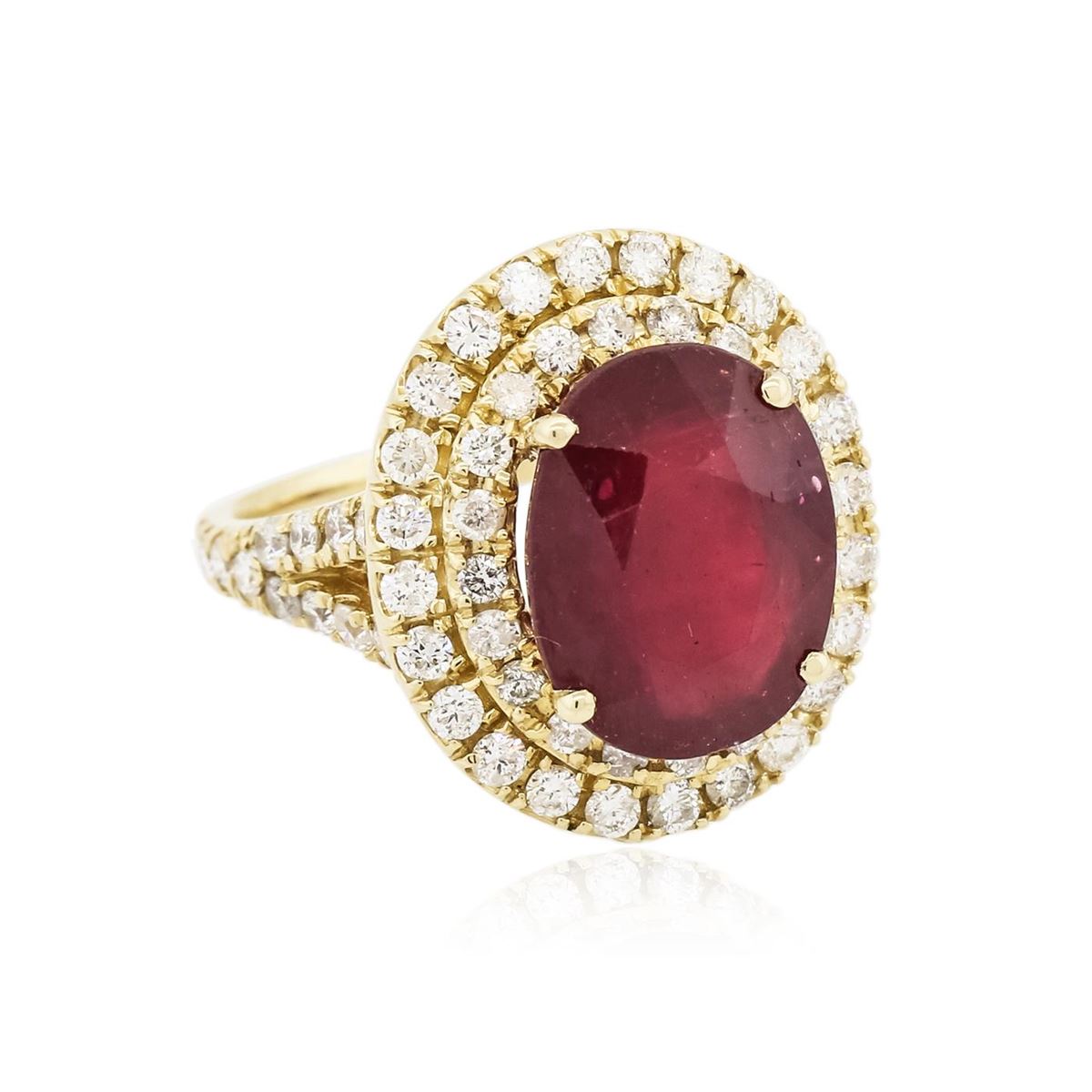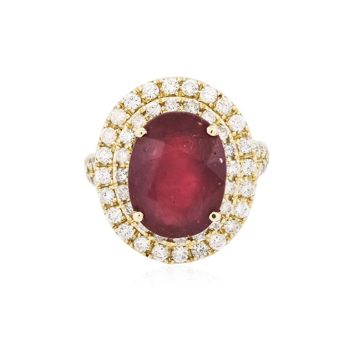 One electronically tested 14KT yellow gold Ladies combination cast & assembled ring with a bright polish finish. Condition is new. Identified with markings of "K14". Containing: One prong set oval modified brilliant cut natural ruby, measuring 13.50 x 10.50 x 7.43mm, approximate weight of 8.56ct., clarity is heavily included, type II, medium, moderately strong, strongly purplish red color, (GIA stpR 5/4), cut is good. Colored gemstones are presumed to have been subjected to commonly used color/clarity enhancement processes. Sixty-Nine prong set round brilliant cut diamonds, measuring 1.70 - 1.70 x 1.02mm (depth est.) approximate. Total Weight of 69 Stones = 1.24ct. Clarity: I-1 to I-2. Color: H - I, Cut is Good. Total Weight of Colored Stones 8.56ct. Total Weight of Diamonds 1.24ct. Total Weight of Ring 8.60 grams. GGL Appraised at $8,360.00.