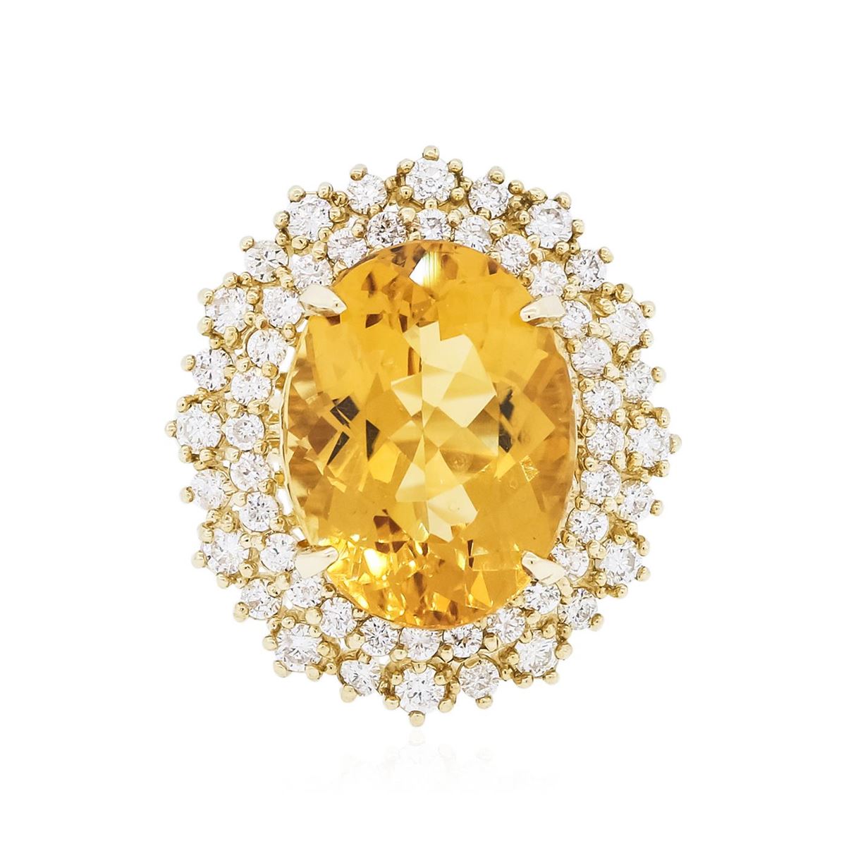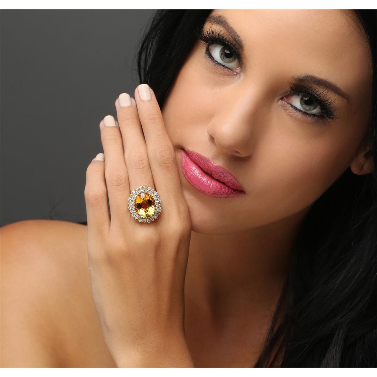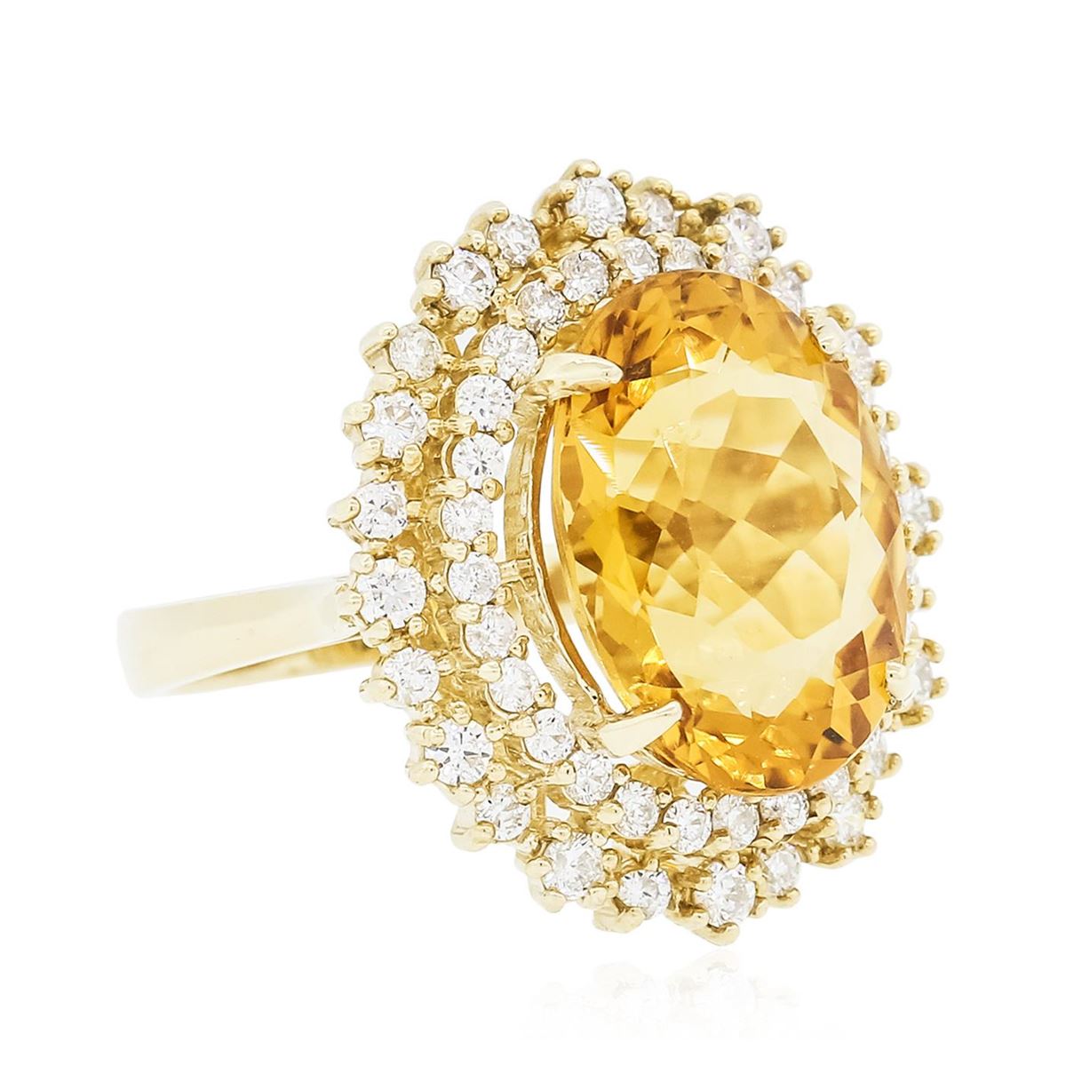 One electronically tested 14KT yellow gold ladies combination cast & assembled citrine and diamond ring with a flat shank with a bright polish finish. Identified with markings of "K14". Condition is new. Containing: One prong set oval modified brilliant cut natural citrine quartz, measuring 16.11 x 12.22 x 8.02mm, approximate weight of 8.56ct., clarity is eye clean, type I, medium light, brownish, orangy yellow color, (GIA oY 4/3), cut is good. Fifty-Two prong set round brilliant cut diamonds, measuring 1.90 - 1.40 x 0.99mm (depth est.) approximate total weight of 52 Stones = 0.85ct. Clarity: SI-1 to SI-2. Color: J - K, Cut is Good. Colored gemstones are presumed to have been subjected to commonly used enhancement processes. All diamonds and colored gemstones are graded in the mounting, unless otherwise stated. Total Weight of Colored Stones 8.56ct. Total Weight of Diamonds 0.85ct. Total Weight of Ring 9.60 grams. GGL Appraised at $4,560.00.