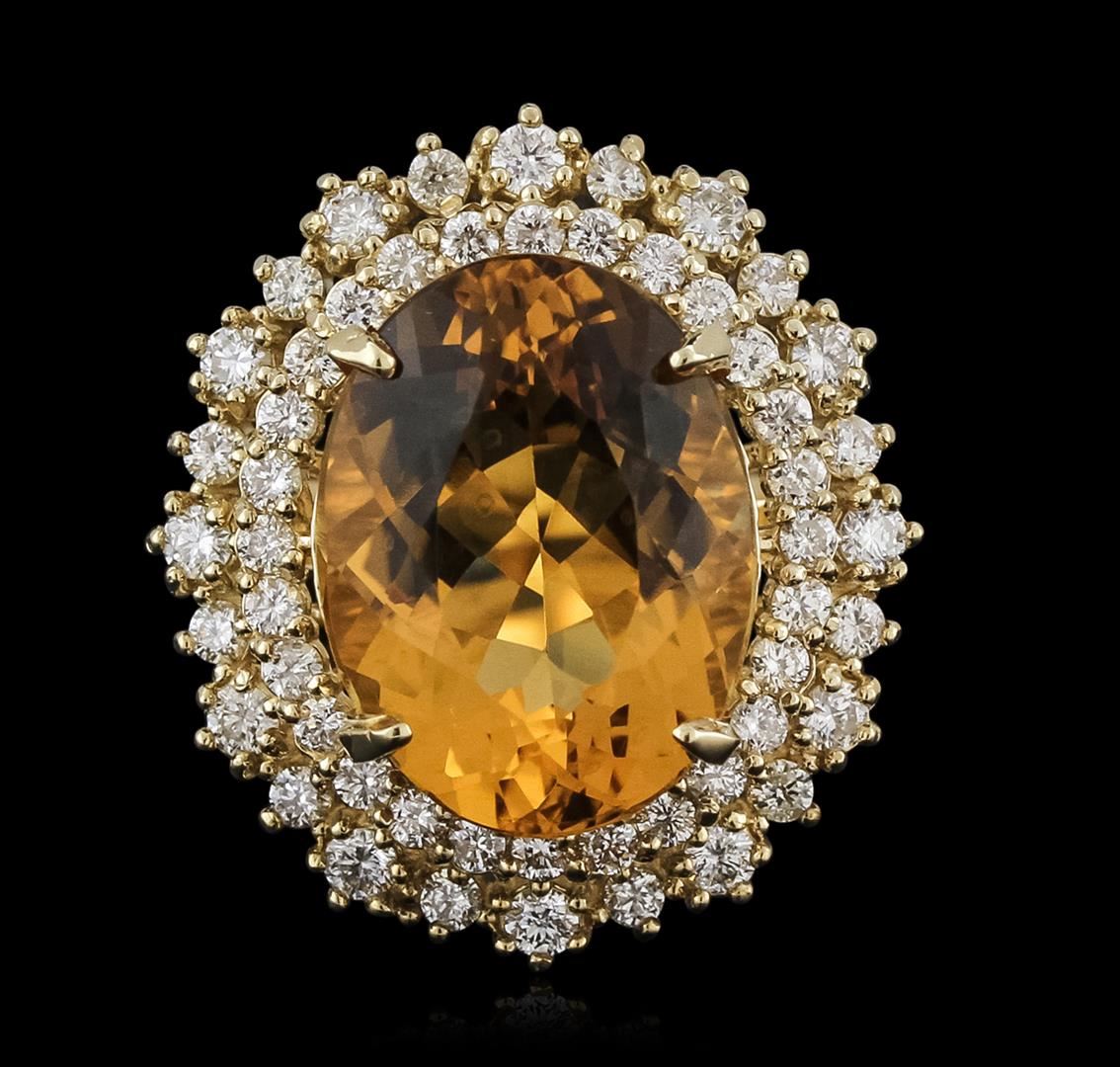 One electronically tested 14KT yellow gold ladies combination cast & assembled citrine and diamond ring with a flat shank with a bright polish finish. Identified with markings of "K14". Condition is new. Containing: One prong set oval modified brilliant cut natural citrine quartz, measuring 16.11 x 12.22 x 8.02mm, approximate weight of 8.56ct., clarity is eye clean, type I, medium light, brownish, orangy yellow color, (GIA oY 4/3), cut is good. Fifty-Two prong set round brilliant cut diamonds, measuring 1.90 - 1.40 x 0.99mm (depth est.) approximate total weight of 52 Stones = 0.85ct. Clarity: SI-1 to SI-2. Color: J - K, Cut is Good. Colored gemstones are presumed to have been subjected to commonly used enhancement processes. All diamonds and colored gemstones are graded in the mounting, unless otherwise stated. Total Weight of Colored Stones 8.56ct. Total Weight of Diamonds 0.85ct. Total Weight of Ring 9.60 grams. GGL Appraised at $4,560.00.