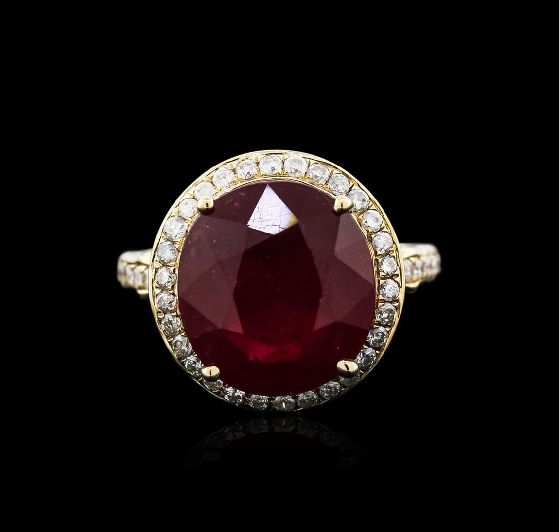 One electronically tested 14KT yellow gold ladies cast ruby and diamond ring with a cathedral shank with a bright polish finish. Trademark is Orianne. Identified with markings of "14K". Condition is new. Containing: One prong set oval modified brilliant cut natural ruby, measuring 13.38 x 12.17 x 6.28mm, approximate weight of 8.59ct., clarity is heavily included, type II, medium dark, very slightly brownish, strongly purplish red color, (GIA stpR 6/3), cut is good. One Hundred Twelve prong set round brilliant cut diamonds, measuring 1.50 - 1.50 x 0.90mm (depth est.) approximate total weight of 112 Stones = 1.38ct. Clarity: SI-2 to I-2. Color: I - J. Four bezel set round brilliant cut diamonds, measuring 1.30 - 1.30 x 0.78mm (depth est.) approximate total weight of 4 Stones = 0.03ct. Clarity: I-1 to I-2. Color: I - J. All diamonds and colored gemstones are graded in the mounting, unless otherwise stated. Colored gemstones are presumed to have been subjected to commonly used enhancement processes.. Total Weight of Colored Stones 8.59ct. Total Weight of Diamonds 1.41ct. Total Weight of Ring 7.20 grams. GGL Appraised at $4,555.00.