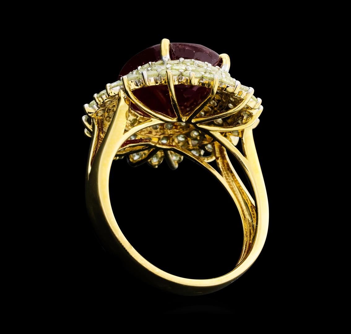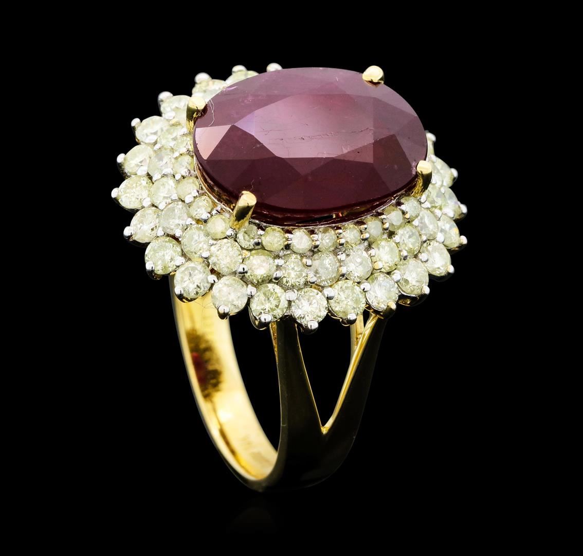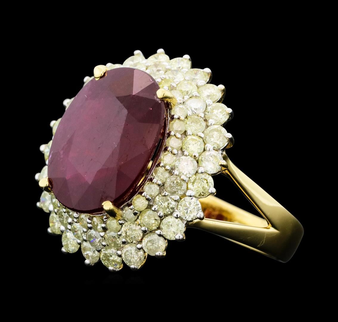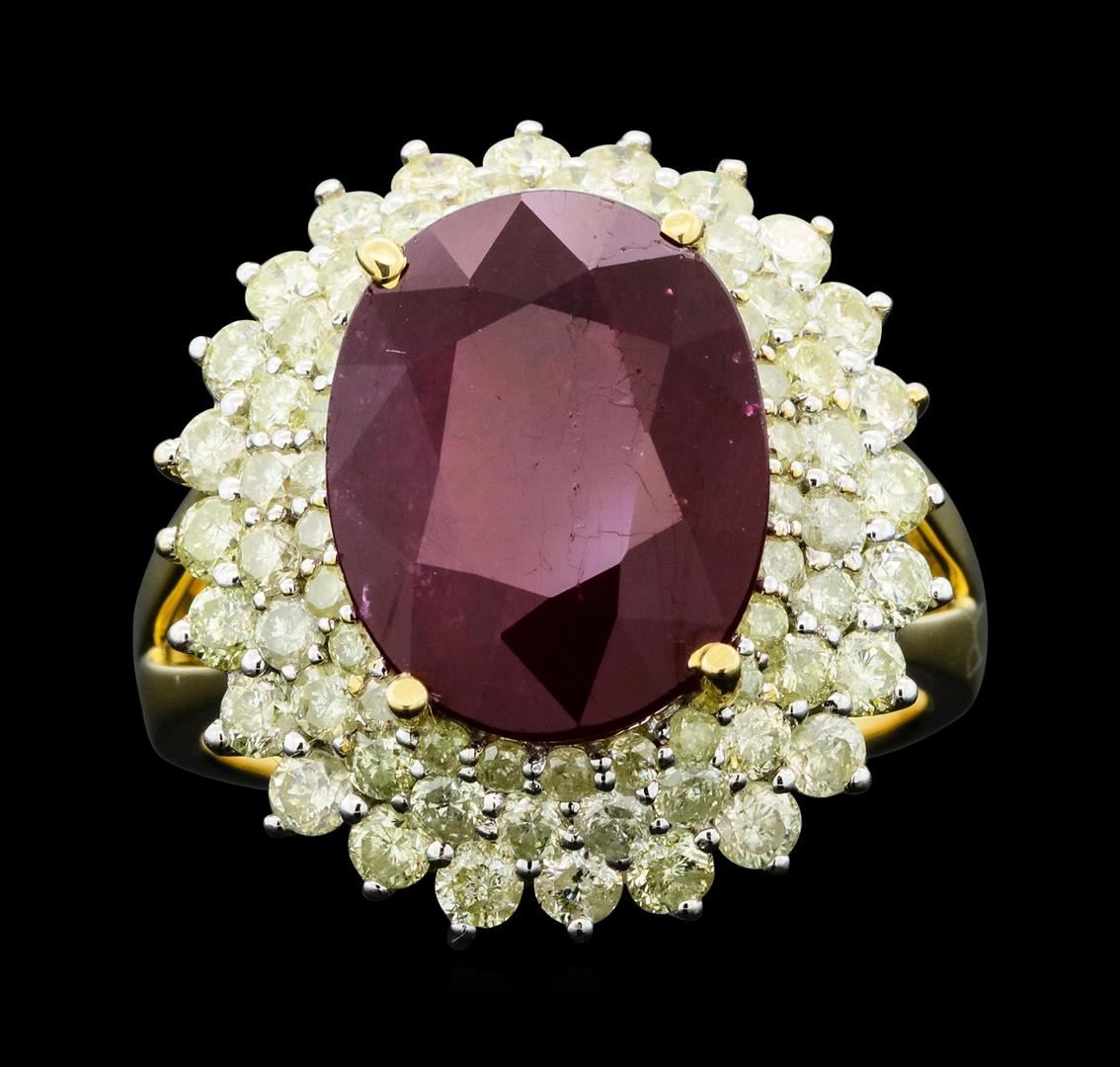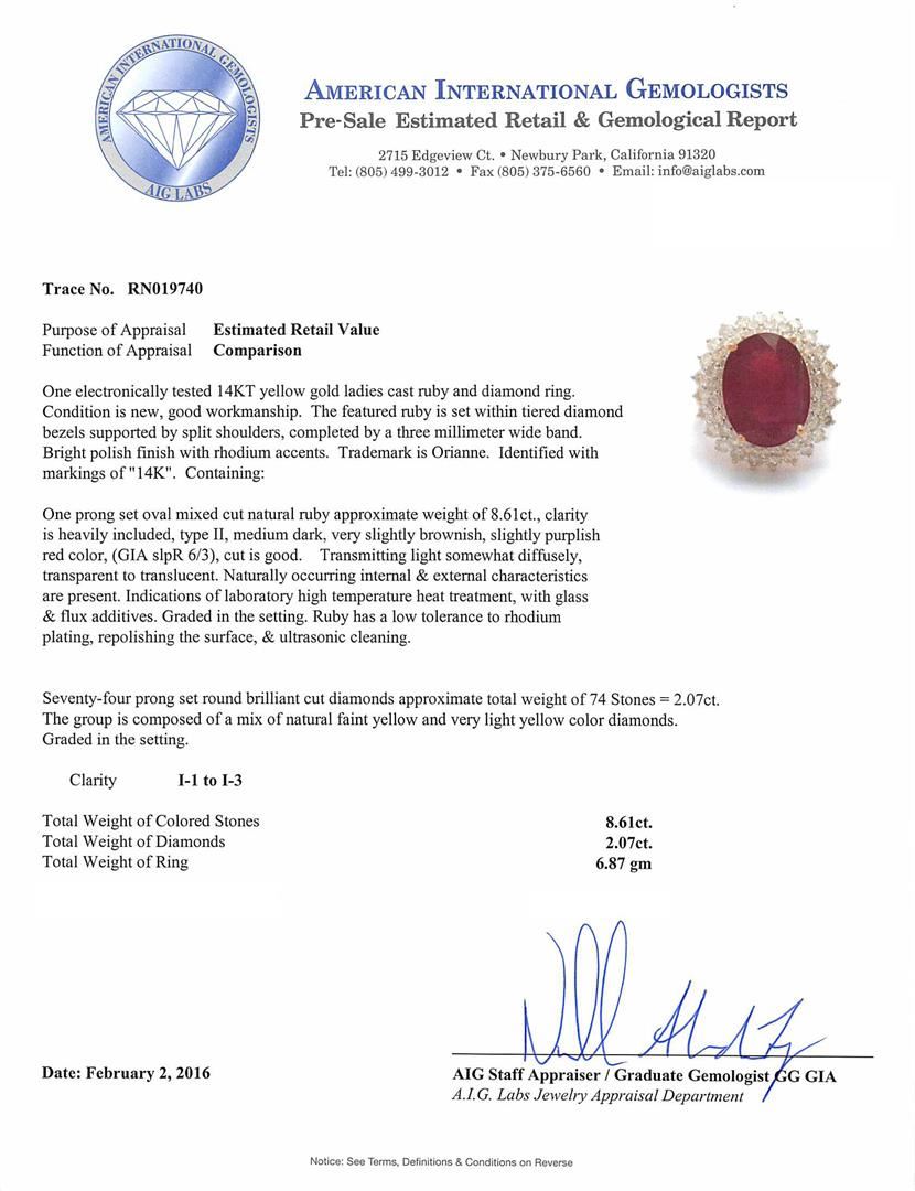 One electronically tested 14KT yellow gold ladies cast ruby and diamond ring. The featured ruby is set within tiered diamond bezels supported by split shoulders, completed by a three millimeter wide band. Bright polish finish with rhodium accents. Trademark is Orianne. Identified with markings of "14K". Condition is new, good workmanship. Containing: One prong set oval mixed cut natural ruby approximate weight of 8.61ct., clarity is heavily included, type II, medium dark, very slightly brownish, slightly purplish red color, (GIA slpR 6/3), cut is good. Transmitting light somewhat diffusely, transparent to translucent. Naturally occurring internal & external characteristics are present. Indications of laboratory high temperature heat treatment, with glass & flux additives. Graded in the setting. Ruby has a low tolerance to rhodium plating, repolishing the surface, & ultrasonic cleaning.Seventy-Four prong set round brilliant cut diamonds approximate total weight of 74 Stones = 2.07ct. The group is composed of a mix of natural faint yellow and very light yellow color diamonds. Graded in the setting. Clarity: I-1 to I-3. Total Weight of Colored Stones 8.61ct. Total Weight of Diamonds 2.07ct. Total Weight of Ring 6.87gm. AIG Appraised.
