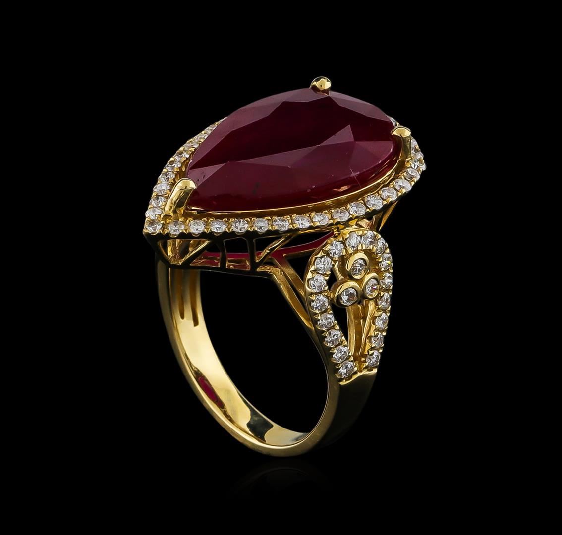 One electronically tested 14KT yellow gold ladies combination cast & assembled ruby and diamond ring with a split shoulder shank with a bright polish finish. Identified with markings of "14K". Condition is new. Containing: One prong set pear modified brilliant cut natural ruby, measuring 18.00 x 12.00 x 5.02mm, approximate weight of 8.67ct., clarity is heavily included, type II, medium dark, moderately strong, strongly purplish red color, (GIA stpR 6/4), cut is good. Sixty-Eight prong set round brilliant cut diamonds, measuring 1.30 - 1.30 x 0.78mm (depth est.) approximate total weight of 68 Stones = 0.54ct. Clarity: I-1 to I-2. Color: J - K, Cut is Good. Colored gemstones are presumed to have been subjected to commonly used enhancement processes. All diamonds and colored gemstones are graded in the mounting, unless otherwise stated. Total Weight of Colored Stones 8.67ct. Total Weight of Diamonds 0.54ct. Total Weight of Ring 7.60 grams. GGL Appraised at $6,745.00.