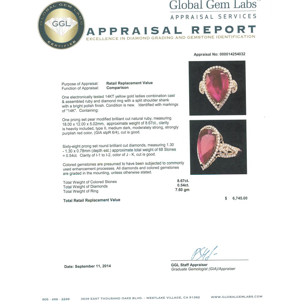 One electronically tested 14KT yellow gold ladies combination cast & assembled ruby and diamond ring with a split shoulder shank with a bright polish finish. Identified with markings of "14K". Condition is new. Containing: One prong set pear modified brilliant cut natural ruby, measuring 18.00 x 12.00 x 5.02mm, approximate weight of 8.67ct., clarity is heavily included, type II, medium dark, moderately strong, strongly purplish red color, (GIA stpR 6/4), cut is good. Sixty-Eight prong set round brilliant cut diamonds, measuring 1.30 - 1.30 x 0.78mm (depth est.) approximate total weight of 68 Stones = 0.54ct. Clarity: I-1 to I-2. Color: J - K, Cut is Good. Colored gemstones are presumed to have been subjected to commonly used enhancement processes. All diamonds and colored gemstones are graded in the mounting, unless otherwise stated. Total Weight of Colored Stones 8.67ct. Total Weight of Diamonds 0.54ct. Total Weight of Ring 7.60 grams. GGL Appraised at $6,745.00.