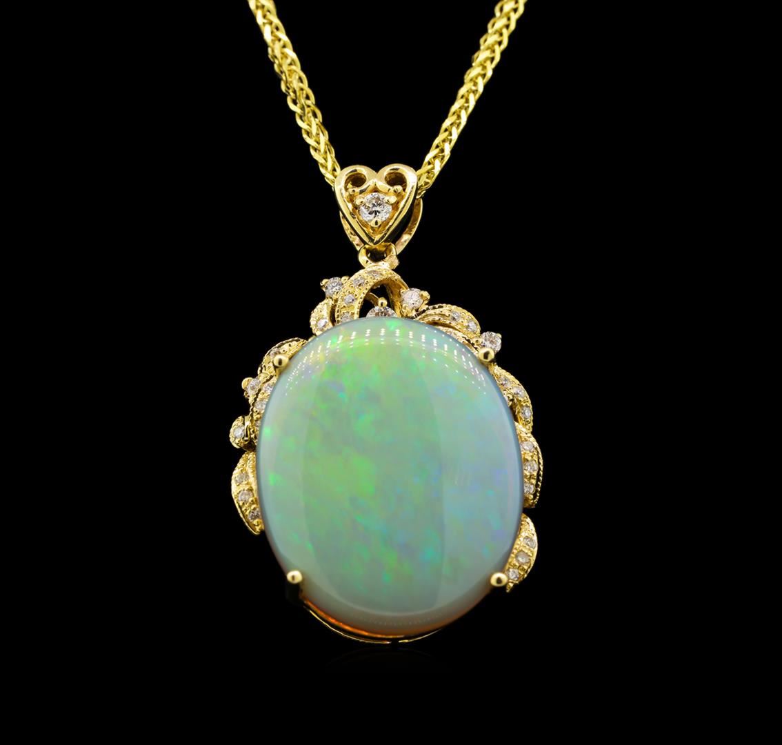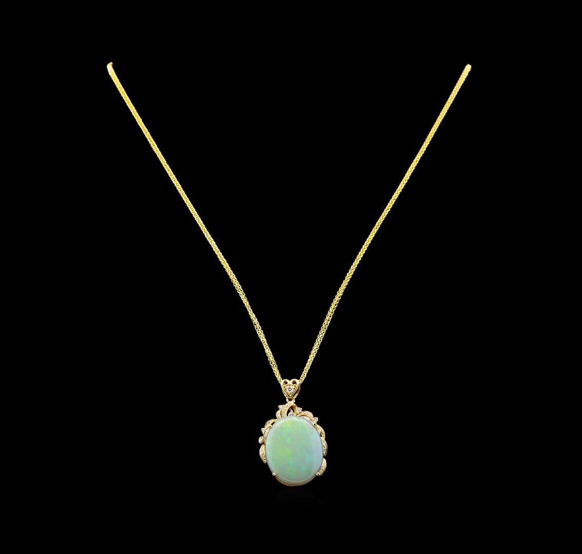 One electronically tested 14KT yellow gold ladies cast opal and diamond pendant & chain 20.0" long, with a lobster claw clasp with a bright polish finish. Identified with markings of "14K". Condition is new. Containing: One white opal that is cut in a oval shape and is prong set, measuring 23.00 mm long x 19.44 mm wide, and 4.50 mm thick and the approximate weight is 8.71 carats. The opal has a somewhat bright, green only play of color (fire) in a flashfire pattern; a low dome; a good cut; no inclusions; consistent in its brightness and pattern; and is somewhat directional. Thirty-Two prong set round brilliant cut diamonds, measuring 2.30 - 1.30 x 1.08mm (depth est.) approximate total weight of 32 Stones = 0.40ct. Clarity: SI-1 to I-1. Color: I - J, Cut is Good. Colored gemstones are presumed to have been subjected to commonly used enhancement processes. All diamonds and colored gemstones are graded in the mounting, unless otherwise stated. Total Weight of Diamonds 0.40ct. Total Weight of Opals 8.71ct. Total Weight of Pendant & Chain 11.40 grams. GGL Appraised at $4,650.00.