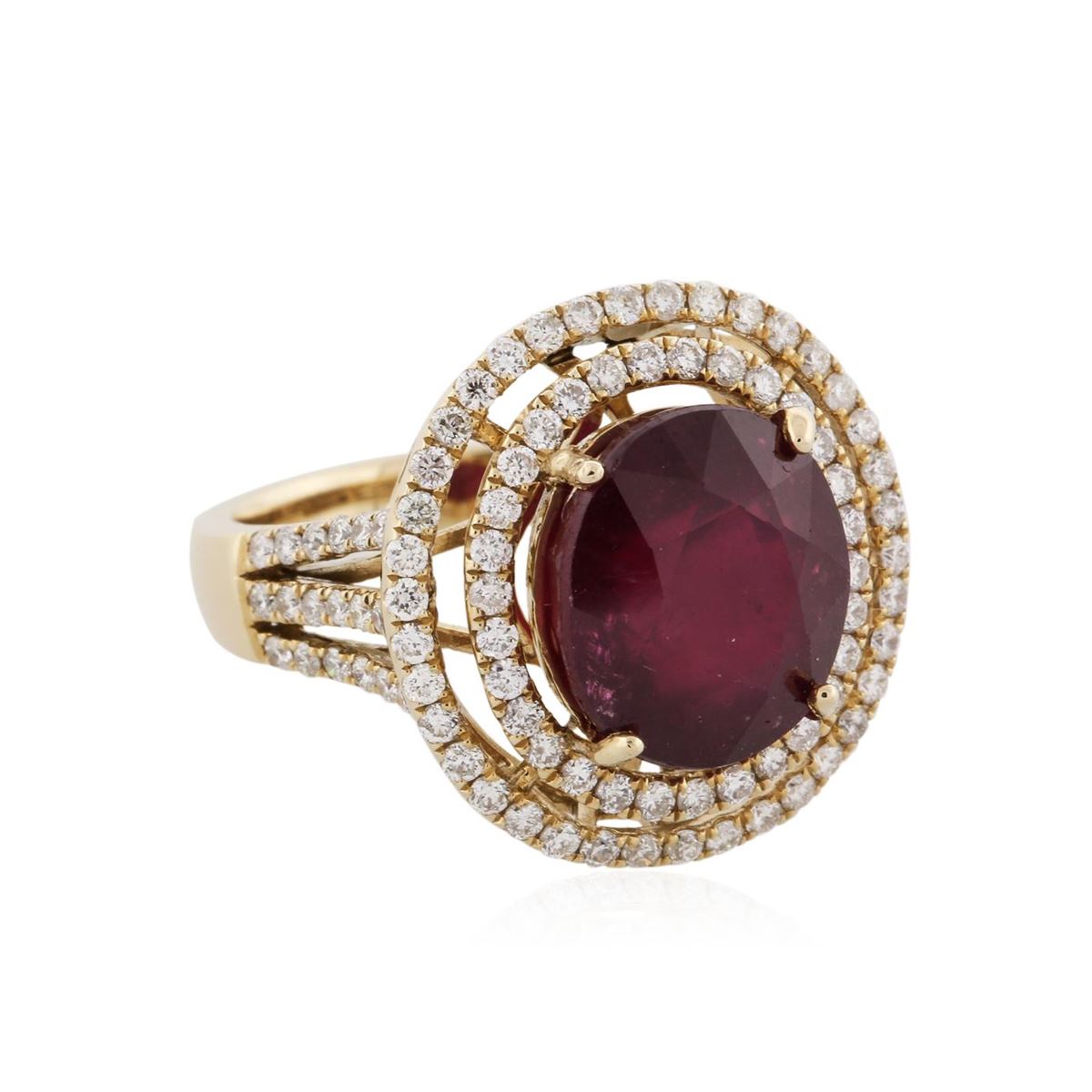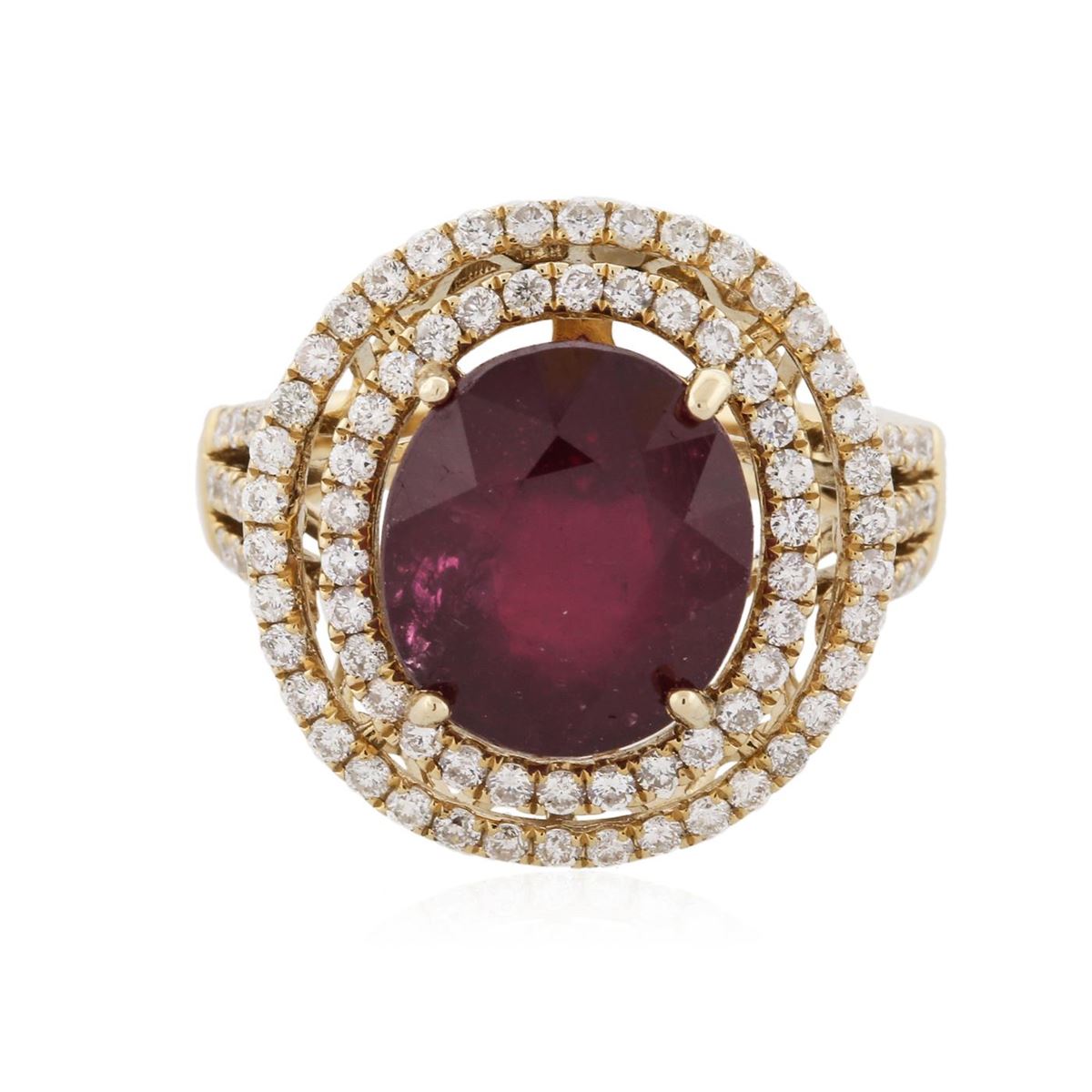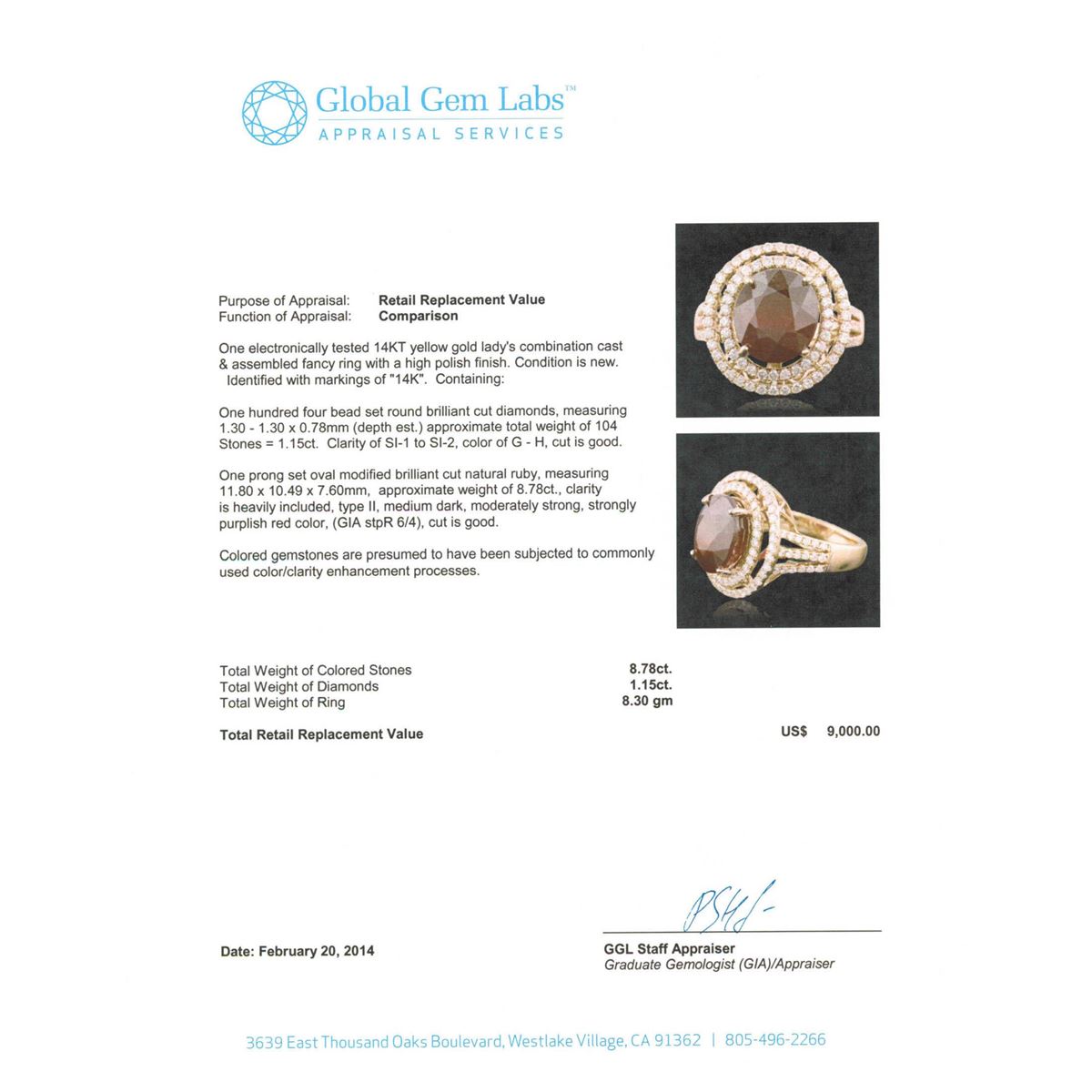 One electronically tested 14KT yellow gold Ladies combination cast & assembled fancy ring with a high polish finish. Condition is new. Identified with markings of "14K". Containing: One Hundred Four bead set round brilliant cut diamonds, measuring 1.30 - 1.30 x 0.78mm (depth est.) approximate. Total Weight of 104 Stones = 1.15ct. Clarity: SI-1 to SI-2. Color: G - H, Cut is Good. One prong set oval modified brilliant cut natural ruby, measuring 11.80 x 10.49 x 7.60mm, approximate weight of 8.78ct., clarity is heavily included, type II, medium dark, moderately strong, strongly purplish red color, (GIA stpR 6/4), cut is good. Colored gemstones are presumed to have been subjected to commonly used color/clarity enhancement processes. Total Weight of Colored Stones 8.78ct. Total Weight of Diamonds 1.15ct. Total Weight of Ring 8.30 grams. GGL Appraised at $9,000.00.