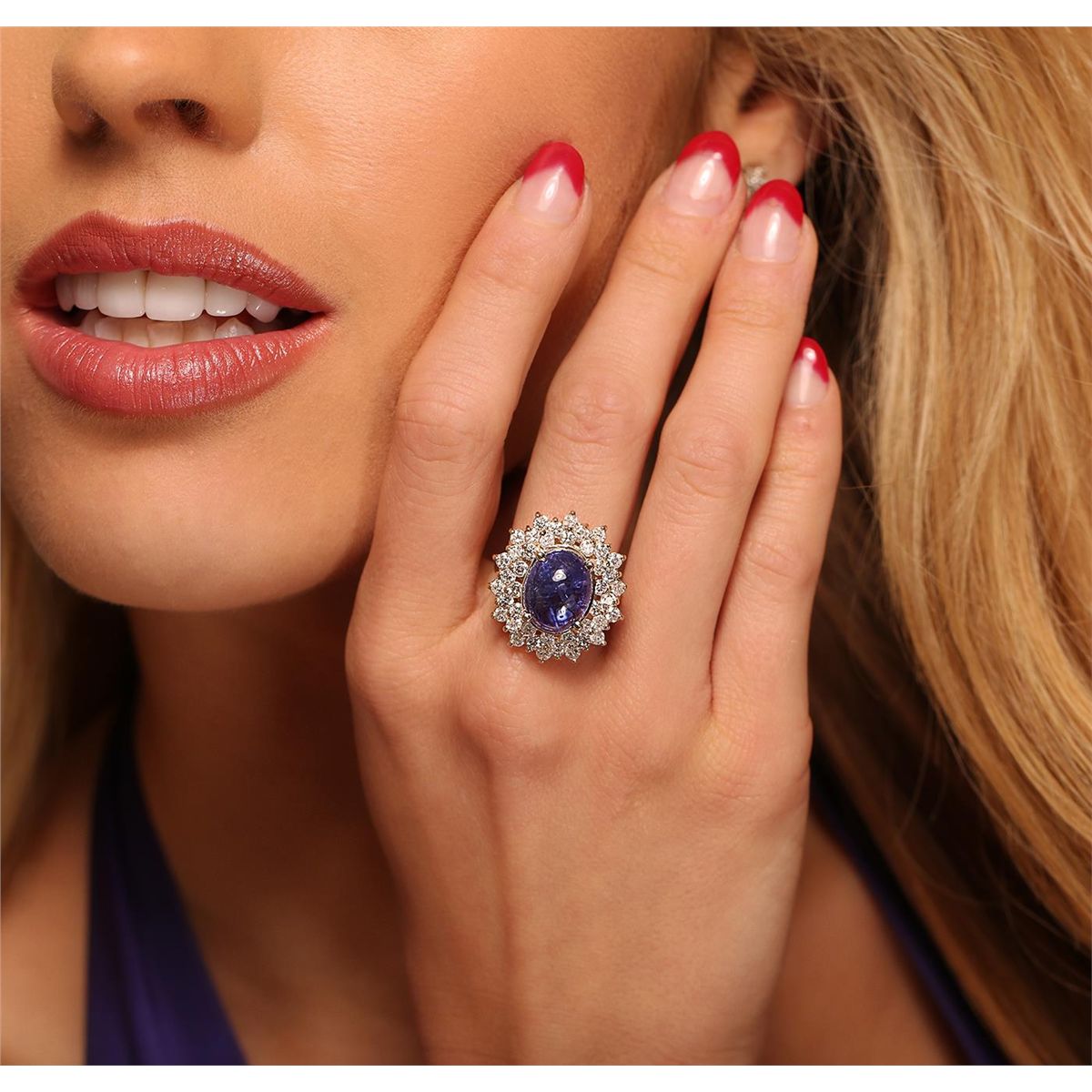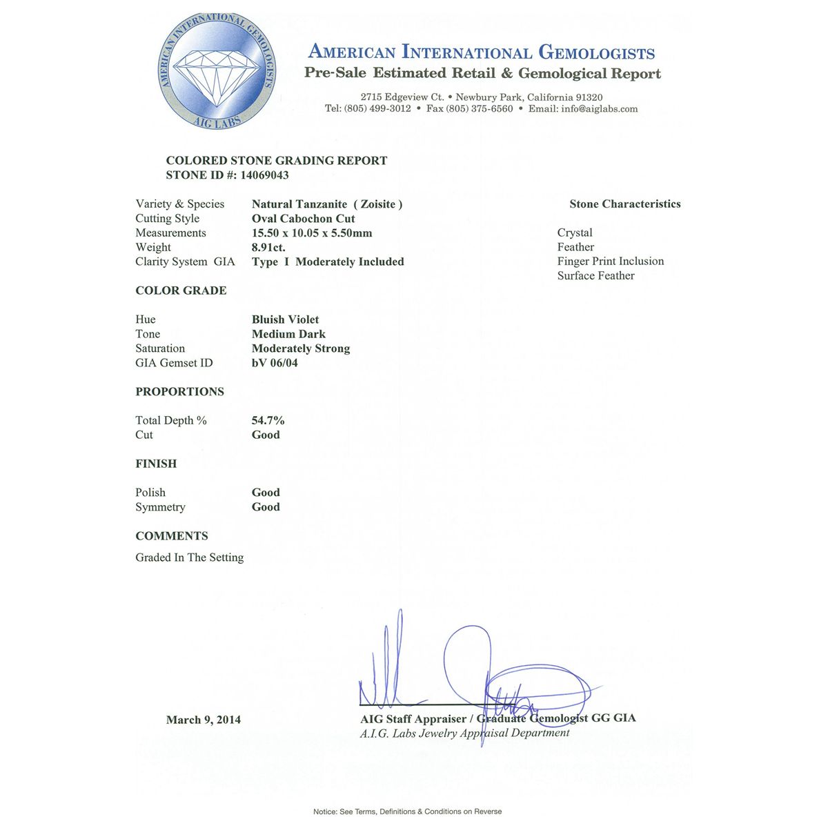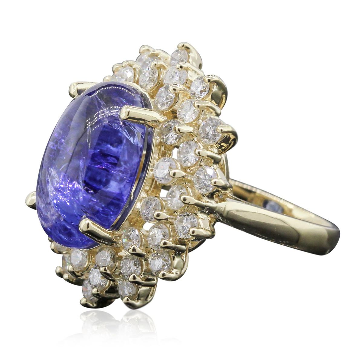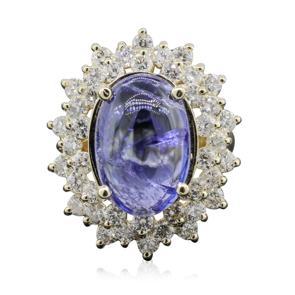 One electronically tested 14KT yellow ladies cast tanzanite and diamond ring with a bright polish finish. The featured tanzanite is set within tiered diamond bezels supported by tapering shoulders, completed by a two and one-half millimeter wide band. Identified with markings of "K14". Condition is new, good workmanship. Containing: One prong set oval cabochon cut natural tanzanite, measuring 15.50 x 10.05 x 5.50mm, 15%. bulge factor, approximate weight of 8.91ct., clarity is moderately included, type I, medium dark, moderately strong, bluish violet color, (GIA bV 6/4), cut is good. Transmitting light somewhat diffusely, transparent to translucent. Naturally occurring internal & external characteristics are present. Colored Stone Grading Report attached. Graded in the setting. Tanzanite is a very rare gemstone that is only found in the country of Tanzania. Originally discovered in 1967. Tiffany & Company, named the stone Tanzanite. It is found in the Usumburu Mountains that border the Umba Valley of northern Tanzania. Tanzanite occurs in gray, brown, violet, blue, reddish-purple, & green. The gem is interesting because of its exceptional pleochroism. Rotated in different directions a tanzanite will exhibit multiple changes of color. Tanzanite has a low tolerance to ultrasonic cleaning, and should not be cleaned using this method. Forty-Two prong set round brilliant cut diamonds, measuring 2.50 - 2.40 x 1.47mm (depth est.) approximate. Total Weight of 42 Stones = 2.36ct. Graded in the setting. Clarity: SI-1 to I-1. Color: H - J. Total Weight of Colored Stones 8.91ct. Total Weight of Diamonds 2.36ct. AIG Appraised at $14,730.00.