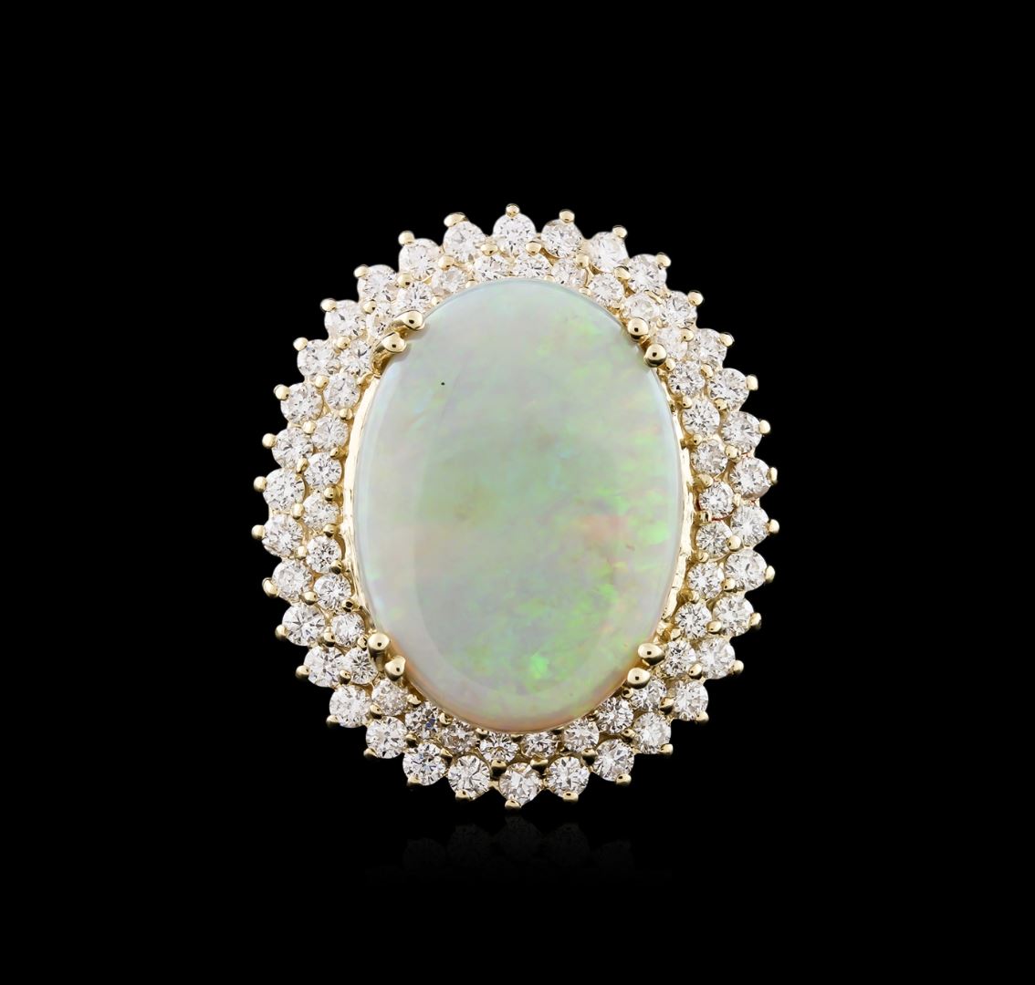 One electronically tested 14KT yellow gold ladies cast opal and diamond ring with a flat shank with a bright polish finish. Identified with markings of "K14". Condition is new. Containing: Thirty-Four prong set round brilliant cut diamonds, measuring 2.30 - 2.30 x 1.38mm (depth est.) approximate total weight of 34 Stones = 1.51ct. Clarity of SI-1 to I-1, Color of I - J, Cut is Good. Thirty-Five prong set round brilliant cut diamonds, measuring 1.90 - 1.90 x 1.14mm (depth est.) approximate total weight of 35 Stones = 0.88ct. Clarity of SI-1 to I-1, Color of I - J, Cut is Good. One white opal that is cut in a oval shape and is prong set, measuring 24.64 mm long x 17.90 mm wide, and 4.60 mm thick and the approximate weight is 8.95 carats. The opal has a somewhat bright, green only play of color (fire) in a flashfire pattern; a medium dome; a good cut; no inclusions; consistent in its brightness and pattern; and is slightly directional. All diamonds and colored gemstones are graded in the mounting, unless otherwise stated. Colored gemstones are presumed to have been subjected to commonly used enhancement processes. Total Weight of Diamonds 2.39ct. Total Weight of Opals 8.95ct. Total Weight of Ring 17.70 grams. GGL Appraised at $9,950.00.