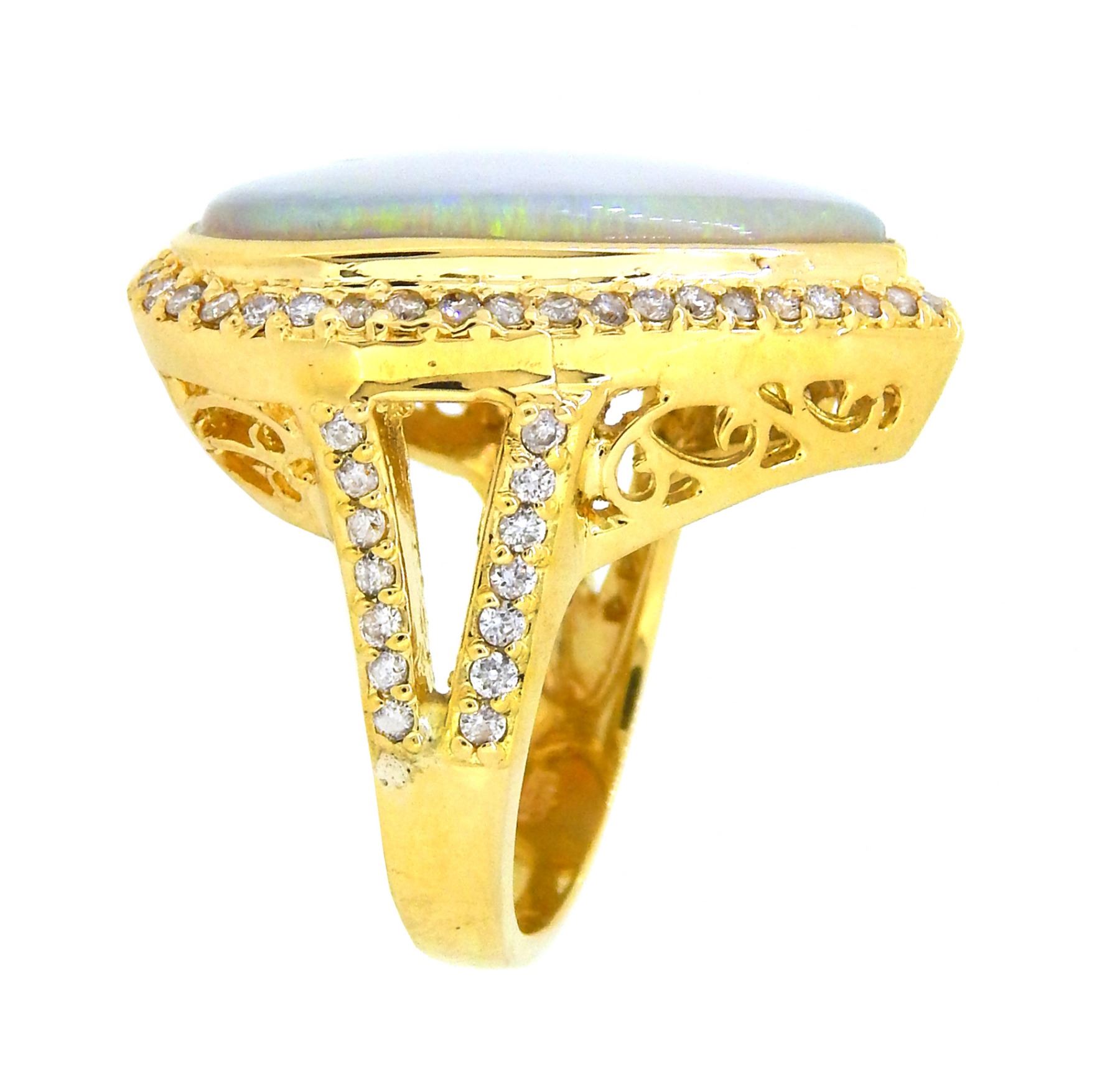 One 14KT Yellow Gold 9.00ct Heart Shaped Opal and Diamond Ring. (1) Heart shaped opal with a total weight of 9.00cts. (77) Diamonds with a total weight of 1.02cts. Total weight of this ring is 16.4 grams.