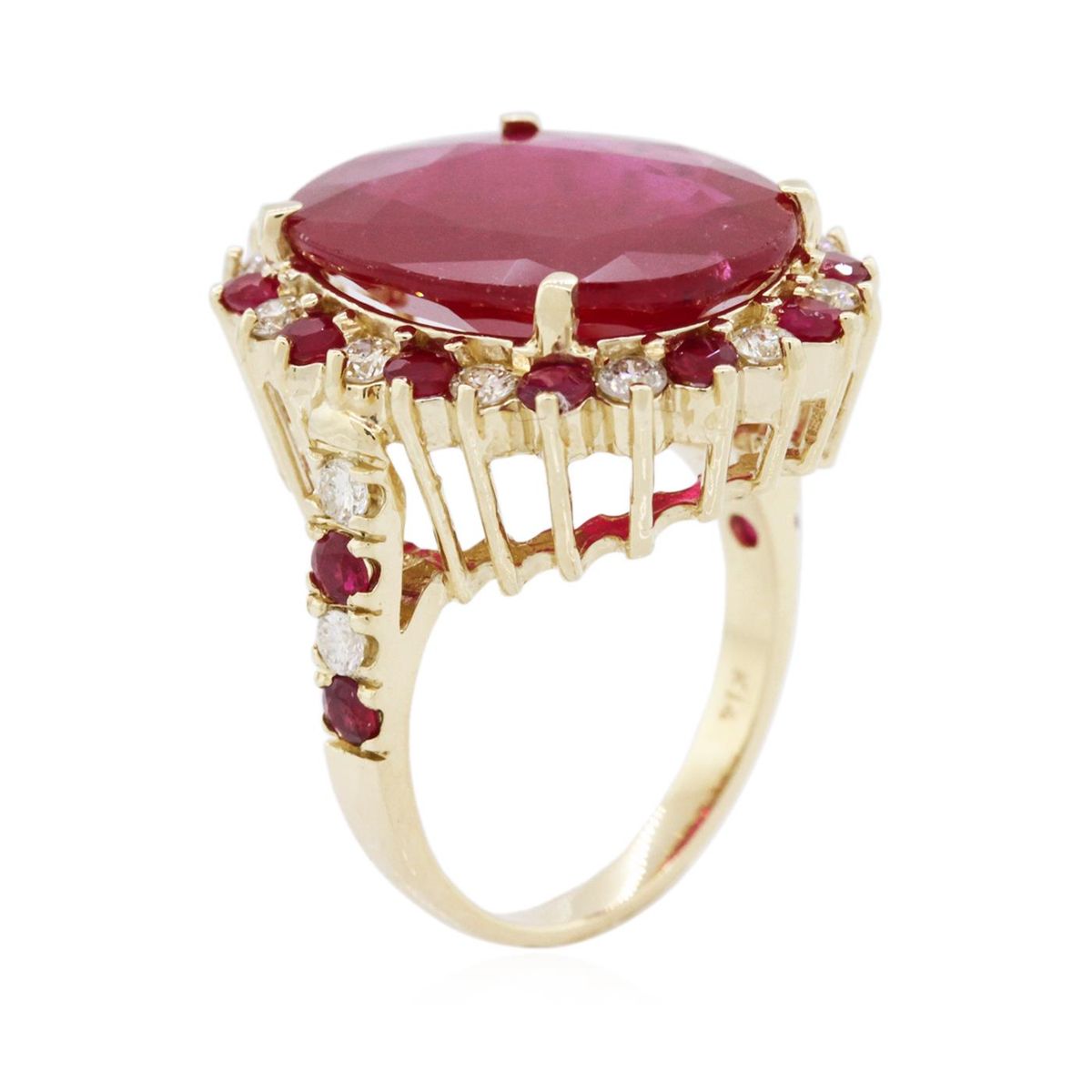 One electronically tested 14KT yellow gold ladies cast ruby & diamond ring with a bright finish. The featured ruby is set within a diamond and ruby bezel, supported by a ribbed under gallery and ruby & diamond set shoulders, completed by a two millimeter wide band. Identified with markings of "K14". Condition is new, good workmanship. Containing: One prong set oval mixed cut natural ruby, measuring 18.00 x 14.00 x 3.88mm, approximate weight of 7.95ct., clarity is heavily included, type II, dark, very slightly brownish, slightly purplish red color, (GIA slpR 7/3), cut is good. Transmitting light somewhat diffusely, transparent to translucent. Naturally occurring internal & external characteristics are present. Indications of laboratory high temperature heat treatment, with glass & flux additives. Graded in the setting. Ruby has a low tolerance to rhodium plating, repolishing the surface, & ultrasonic cleaning. Sixteen prong set round mixed cut natural rubies, measuring 2.40 - 2.30 x 1.53 mm, approximate total weight of 1.12ct., clarity is moderately included, type II, dark, slightly brownish, red color, (GIA R 7/2), cut is good. Transmitting light somewhat diffusely, transparent. Naturally occurring internal & external characteristics are present. Indications of laboratory high temperature heat treatment. Graded in the setting. Ruby has a low tolerance to rhodium plating, repolishing the surface, & ultrasonic cleaning. Sixteen prong set round brilliant cut diamonds, measuring 2.35 - 2.20 x 1.36mm (depth est.) approximate total weight of 16 Stones = 0.68ct. Graded in the setting. Clarity: SI-1 to I-1. Color: G - H. Total Weight of Colored Stones 9.07ct. Total Weight of Diamonds 0.68ct. Total Weight of Ring 9.26 grams. AIG Appraised at $4,750.00.