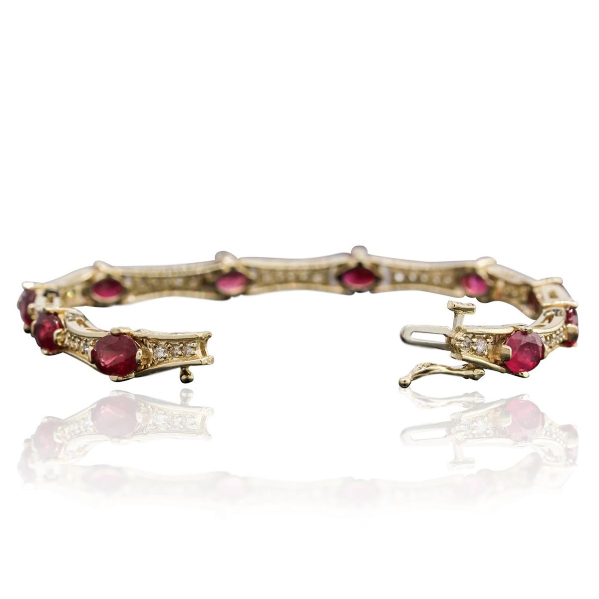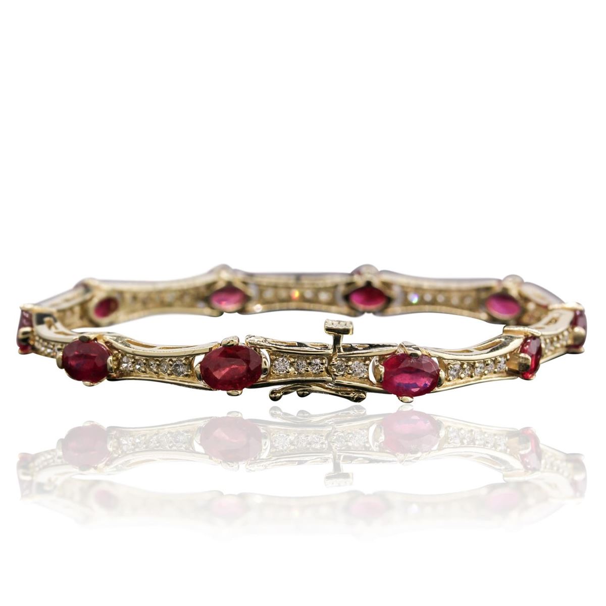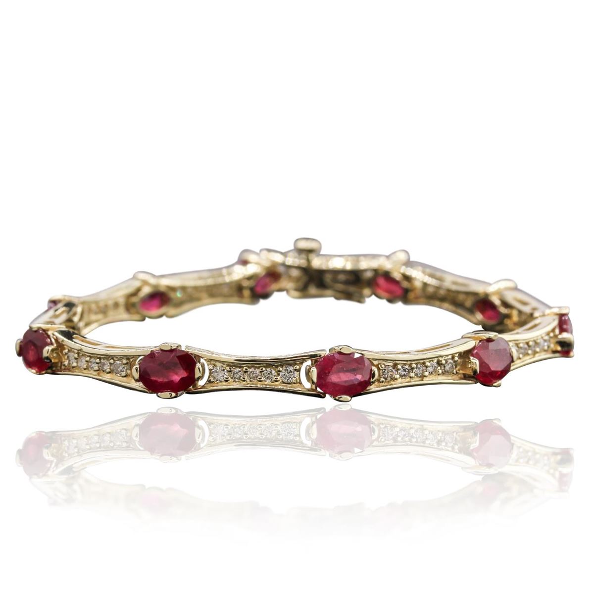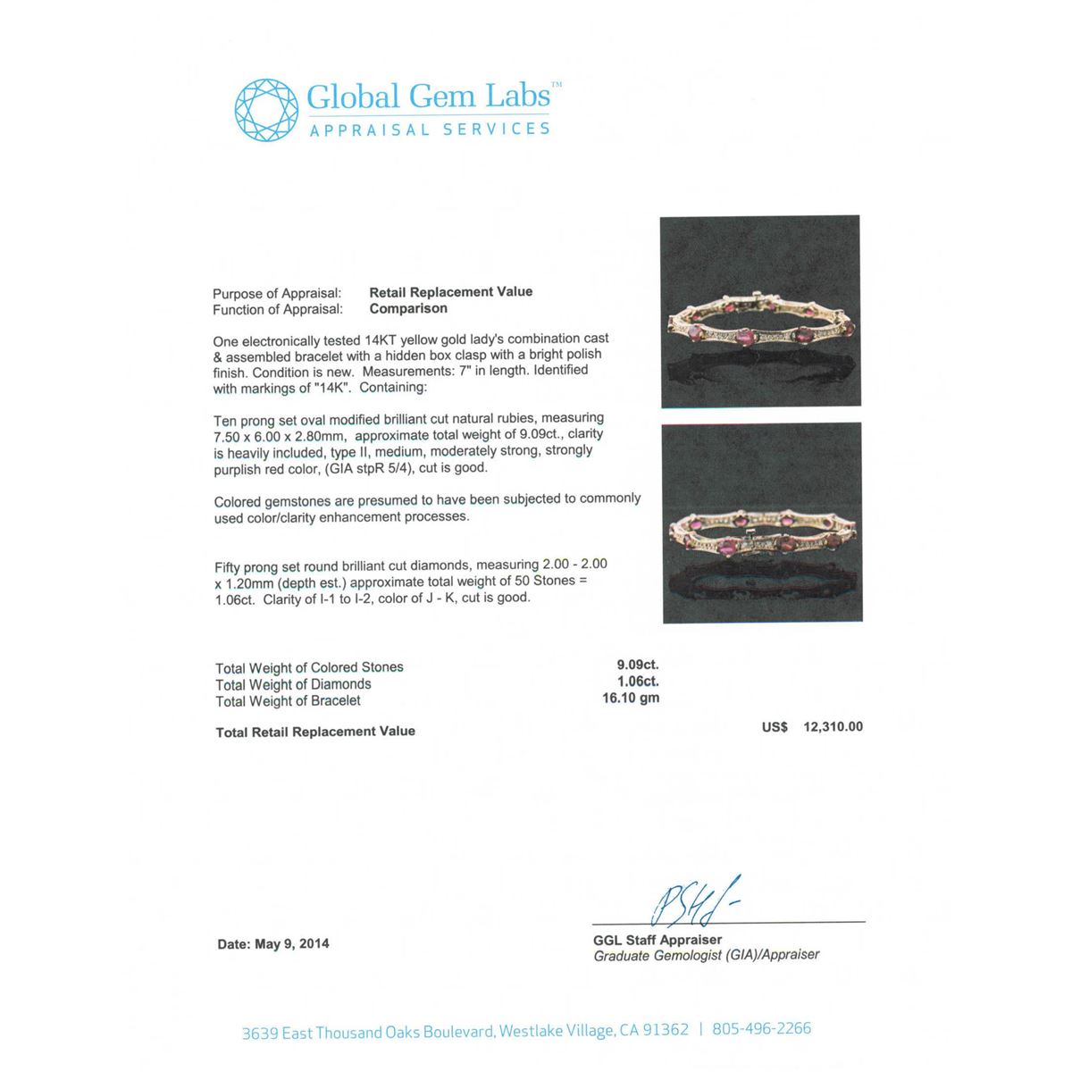 One electronically tested 14KT yellow gold Ladies combination cast & assembled bracelet with a hidden box clasp with a bright polish finish. Condition is new. Measurements: 7" in length. Identified with markings of "14K". Containing: Ten prong set oval modified brilliant cut natural rubies, measuring 7.50 x 6.00 x 2.80mm, approximate. Total Weight of 9.09ct., clarity is heavily included, type II, medium, moderately strong, strongly purplish red color, (GIA stpR 5/4), cut is good. Colored gemstones are presumed to have been subjected to commonly used color/clarity enhancement processes. Fifty prong set round brilliant cut diamonds, measuring 2.00 - 2.00 x 1.20mm (depth est.) approximate. Total Weight of 50 Stones = 1.06ct. Clarity: I-1 to I-2. Color: J - K, Cut is Good. Total Weight of Colored Stones 9.09ct. Total Weight of Diamonds 1.06ct. Total Weight of Bracelet 16.10 grams. GGL Appraised at $12,310.00.