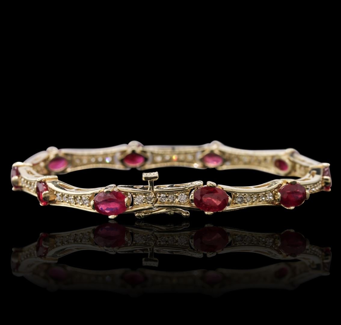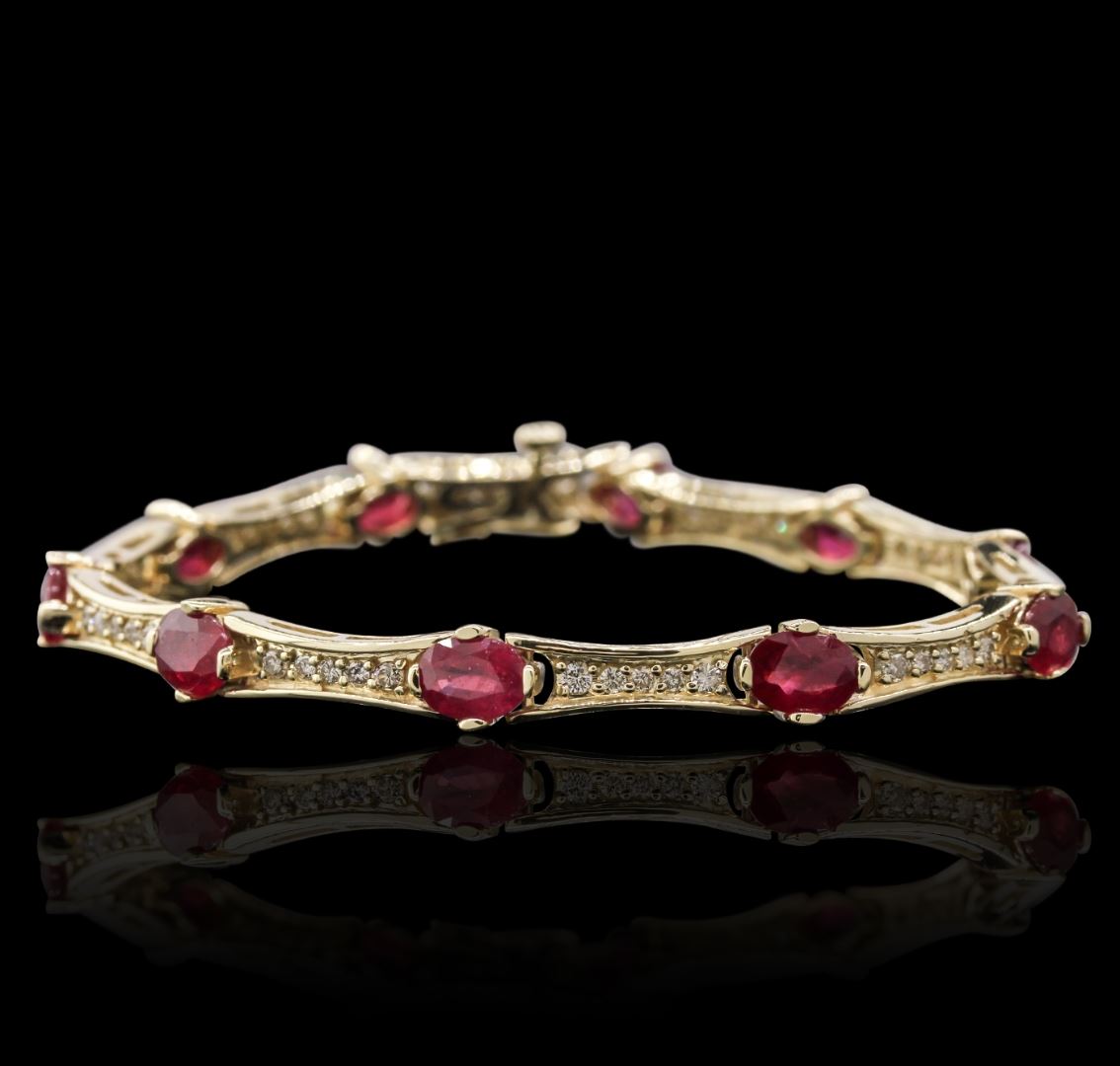 One electronically tested 14KT yellow gold Ladies combination cast & assembled bracelet with a hidden box clasp with a bright polish finish. Condition is new. Measurements: 7" in length. Identified with markings of "14K". Containing: Ten prong set oval modified brilliant cut natural rubies, measuring 7.50 x 6.00 x 2.80mm, approximate. Total Weight of 9.09ct., clarity is heavily included, type II, medium, moderately strong, strongly purplish red color, (GIA stpR 5/4), cut is good. Colored gemstones are presumed to have been subjected to commonly used color/clarity enhancement processes. Fifty prong set round brilliant cut diamonds, measuring 2.00 - 2.00 x 1.20mm (depth est.) approximate. Total Weight of 50 Stones = 1.06ct. Clarity: I-1 to I-2. Color: J - K, Cut is Good. Total Weight of Colored Stones 9.09ct. Total Weight of Diamonds 1.06ct. Total Weight of Bracelet 16.10 grams. GGL Appraised at $12,310.00.
