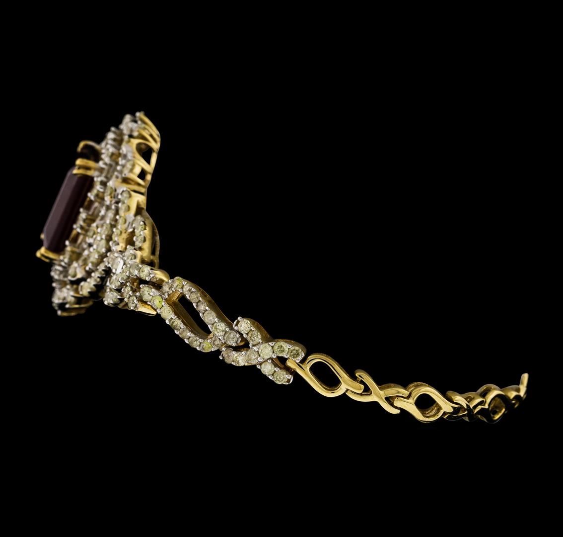 One electronically tested 14KT yellow gold ladies cast & assembled ruby and diamond bracelet. Seven and three-quarter inch length bracelet features a center consisting of a ruby set within a stylized diamond floret bezel supported by flexible floral diamond set ribbon transitioning into matching yellow gold links, terminating in a concealed clasp with safety. Bright polish finish with rhodium accents. Trademark is Orianne. Identified with markings of "925". Condition is new, good workmanship. Containing: One prong set rectangular step cut natural ruby approximate weight of 9.14ct., clarity is heavily included, type II, dark, slightly brownish, slightly purplish red color, (GIA slpR 7/2), cut is good. Transmitting light somewhat diffusely, transparent to translucent. Naturally occurring internal & external characteristics are present. Indications of laboratory high temperature heat treatment, with glass & flux additives. Graded in the setting. Rubyhas a low tolerance to rhodium plating, repolishing the surface, & ultrasonic cleaning. Two Hundred Fourteen prong set round brilliant & baguette cut diamonds approximate total weight of 214 Stones = 3.64ct. The clarity grade reflects the entire range of clarity for this group. Graded in the setting. Clarity: SI-2 to I-3. Color: I - K. Total Weight of Colored Stones 9.14ct. Total Weight of Diamonds 3.64ct. Total Weight of Bracelet 19.52gm. AIG Appraised at $11,950.00.
