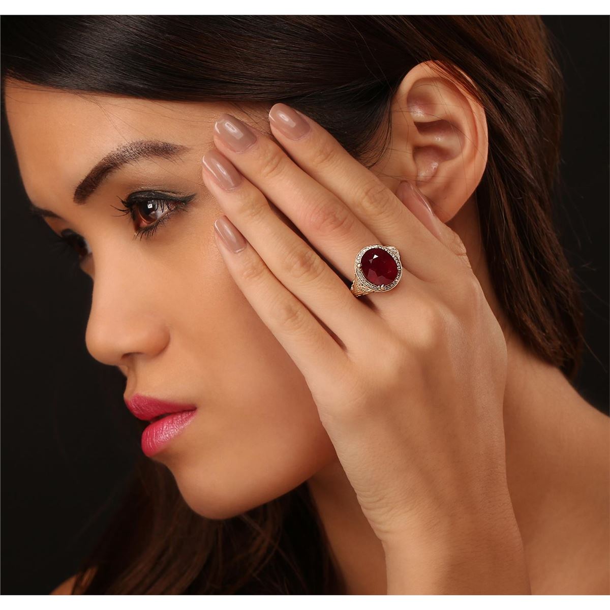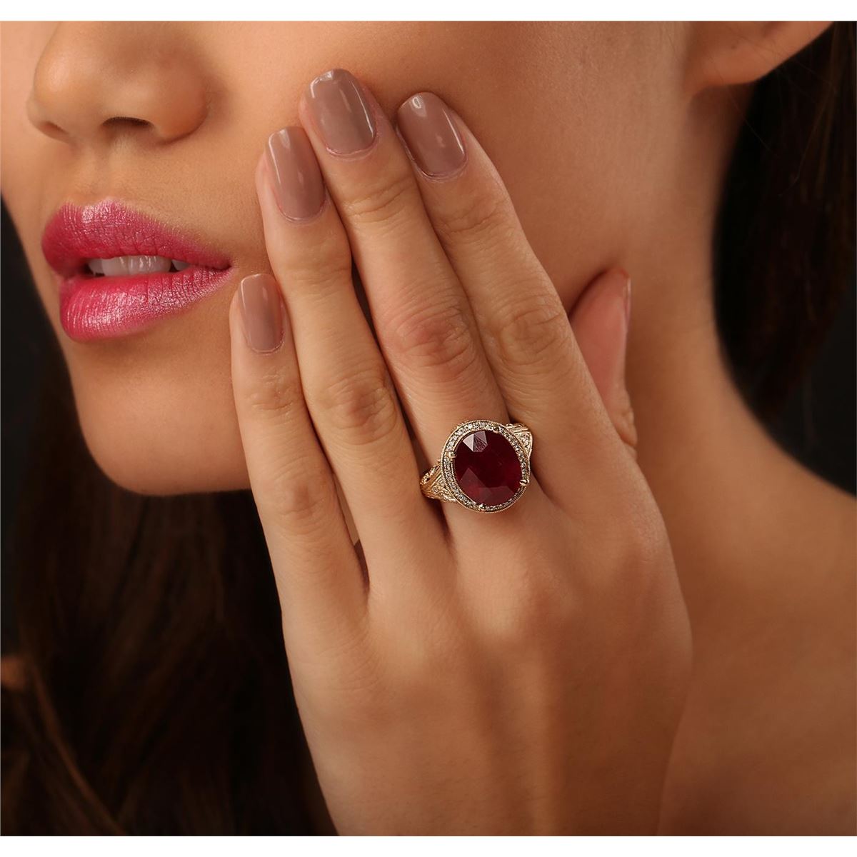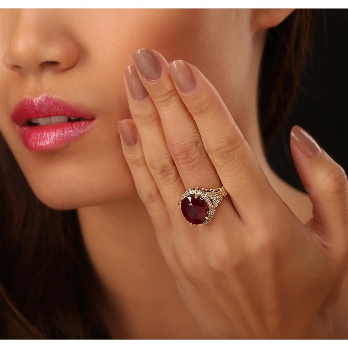 One electronically tested 14KT yellow gold ladies cast ruby and diamond ring. The featured ruby is set within a diamond bezel supported by elaborate diamond accented shoulders, completed by a two and one-half millimeter wide band. Bright polish finish with milgrain detailing throughout. Trademark is PMI. Identified with markings of "14K". Condition is new, good workmanship. Containing: One prong set oval mixed cut natural ruby, measuring 13.30 x 11.10 x 7.00mm, 10%. bulge factor, approximate weight of 9.17ct., clarity is heavily included, type II, dark, very slightly brownish, slightly purplish red color, (GIA slpR 7/3), cut is good. Transmitting light somewhat diffusely, transparent to translucent. Naturally occurring internal & external characteristics are present. Indications of laboratory high temperature heat treatment, with glass & flux additives. Graded in the setting. Ruby has a low tolerance to rhodium plating, repolishing the surface, & ultrasonic cleaning. Forty-Six bead set round brilliant cut diamonds, measuring 1.10 - 1.00 x 0.63mm (depth est.) approximate total weight of 46 Stones = 0.29ct. Graded in the setting. Clarity: SI-1 to I-1. Color: G - I. Total Weight of Colored Stones 9.17ct. Total Weight of Diamonds 0.29ct. Total Weight of Ring 8.27 grams. AIG Appraised at $4,235.00.