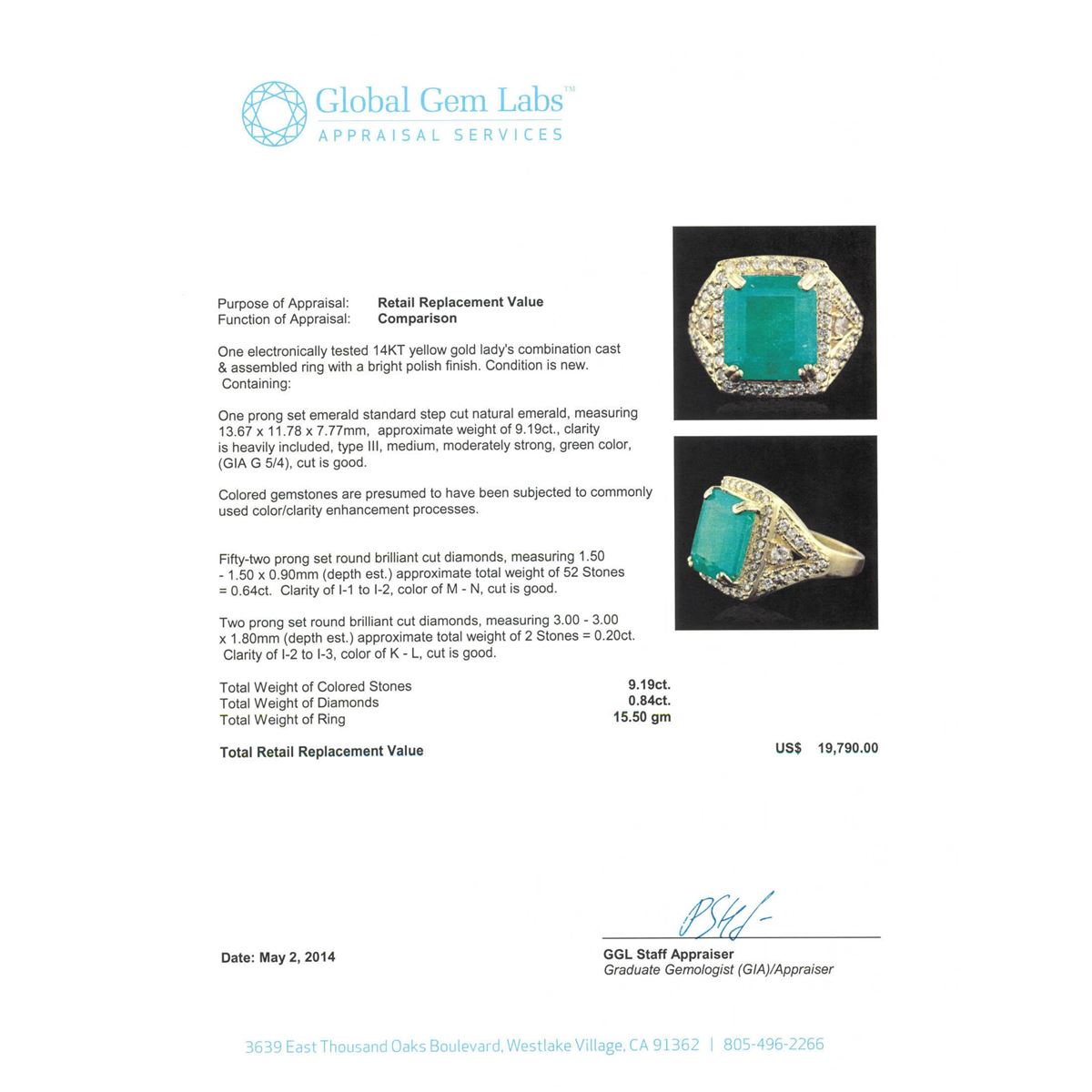 One electronically tested 14KT yellow gold Ladies combination cast & assembled ring with a bright polish finish. Condition is new. Containing: One prong set emerald standard step cut natural emerald, measuring 13.67 x 11.78 x 7.77mm, approximate weight of 9.19ct., clarity is heavily included, type III, medium, moderately strong, green color, (GIA G 5/4), cut is good. Colored gemstones are presumed to have been subjected to commonly used color/clarity enhancement processes. Fifty-Two prong set round brilliant cut diamonds, measuring 1.50 - 1.50 x 0.90mm (depth est.) approximate. Total Weight of 52 Stones = 0.64ct. Clarity: I-1 to I-2. Color: M - N, Cut is Good. Two prong set round brilliant cut diamonds, measuring 3.00 - 3.00 x 1.80mm (depth est.) approximate. Total Weight of 2 Stones = 0.20ct. Clarity: I-2 to I-3. Color: K - L, Cut is Good. Total Weight of Colored Stones 9.19ct. Total Weight of Diamonds 0.84ct. Total Weight of Ring 15.50 grams. GGL Appraised at $19,790.00.