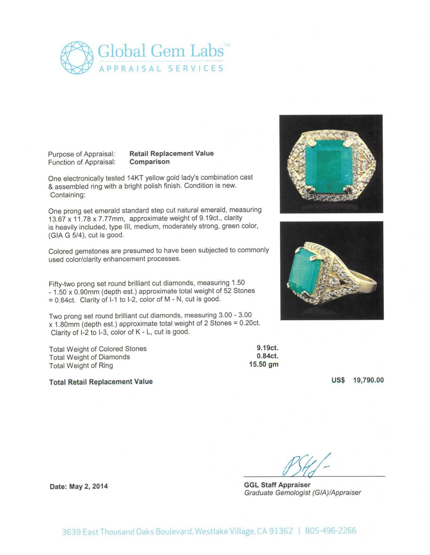 One electronically tested 14KT yellow gold Ladies combination cast & assembled ring with a bright polish finish. Condition is new. Containing: One prong set emerald standard step cut natural emerald, measuring 13.67 x 11.78 x 7.77mm, approximate weight of 9.19ct., clarity is heavily included, type III, medium, moderately strong, green color, (GIA G 5/4), cut is good. Colored gemstones are presumed to have been subjected to commonly used color/clarity enhancement processes. Fifty-Two prong set round brilliant cut diamonds, measuring 1.50 - 1.50 x 0.90mm (depth est.) approximate. Total Weight of 52 Stones = 0.64ct. Clarity: I-1 to I-2. Color: M - N, Cut is Good. Two prong set round brilliant cut diamonds, measuring 3.00 - 3.00 x 1.80mm (depth est.) approximate. Total Weight of 2 Stones = 0.20 ct. Clarity: I-2 to I-3. Color: K - L, Cut is Good. Total Weight of Colored Stones 9.19ct. Total Weight of Diamonds 0.84ct. Total Weight of Ring 15.50 grams. GGL Appraised.