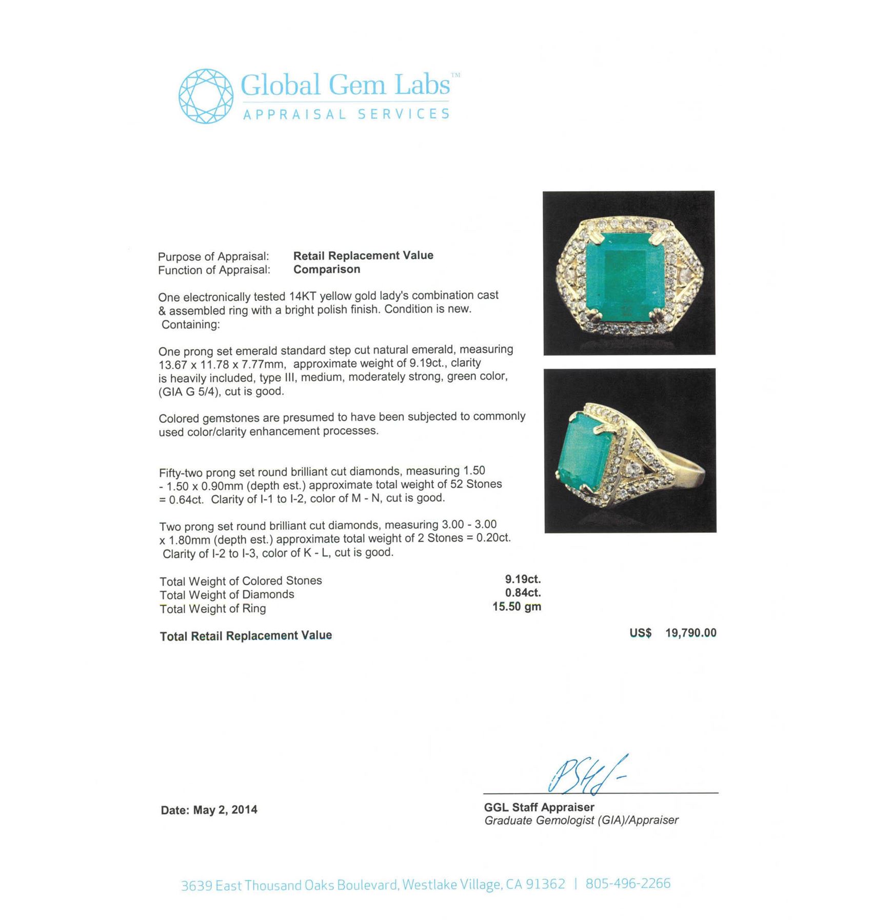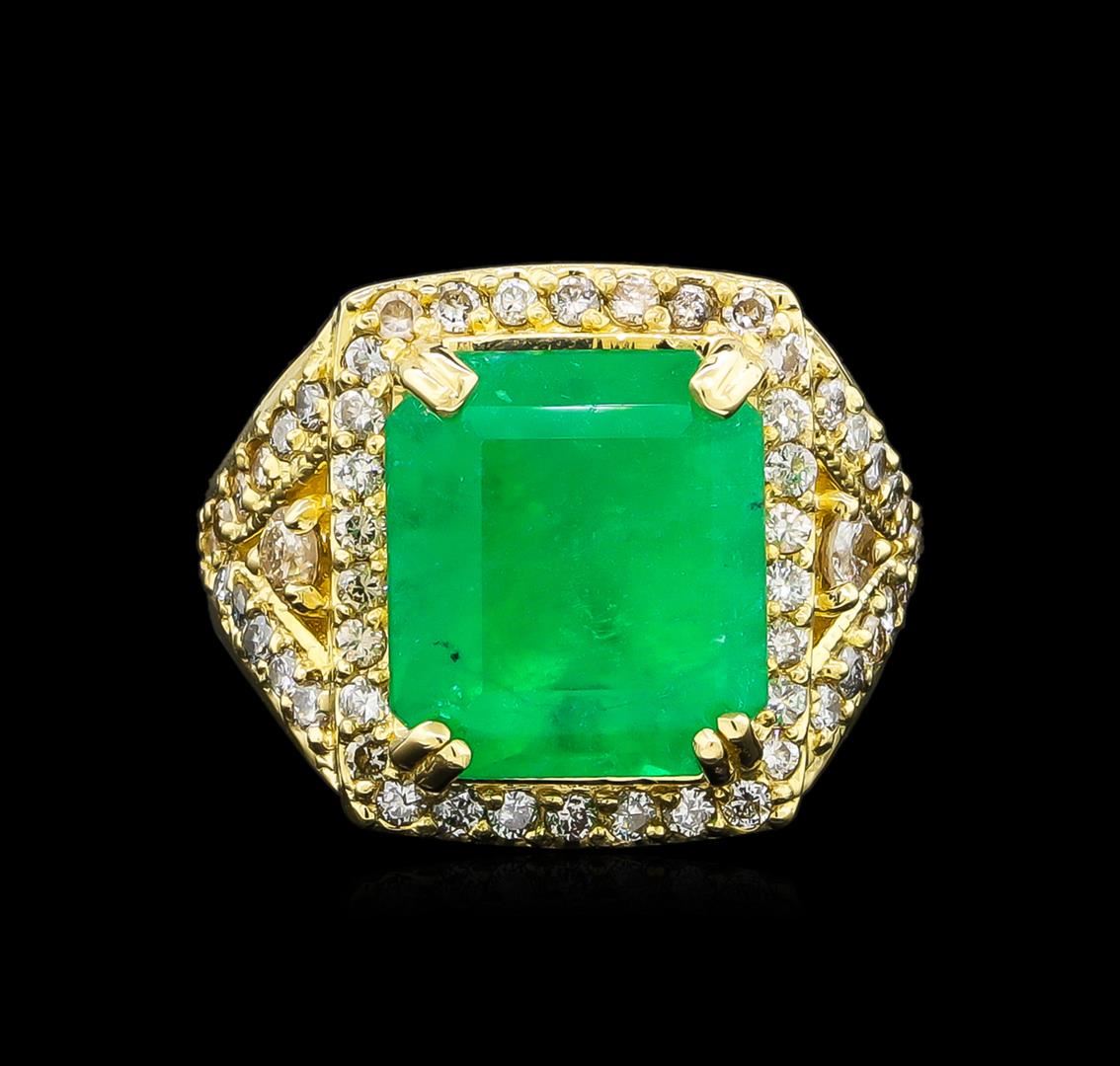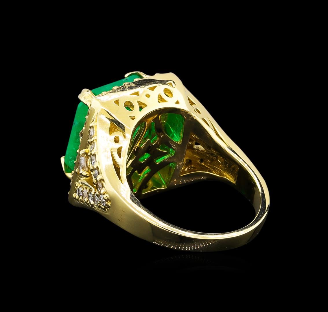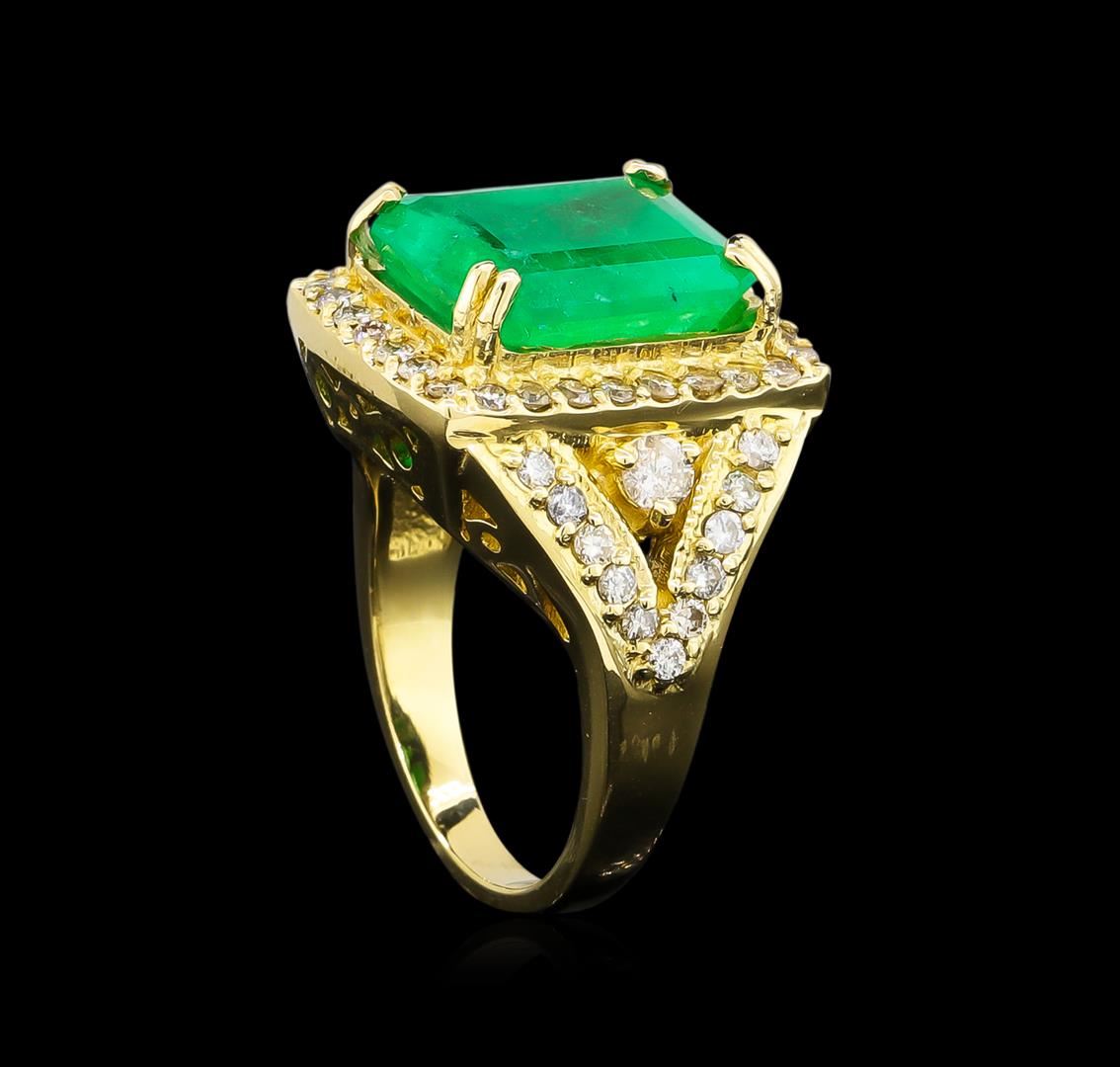 One electronically tested 14KT yellow gold Ladies combination cast & assembled ring with a bright polish finish. Condition is new. Containing: One prong set emerald standard step cut natural emerald, measuring 13.67 x 11.78 x 7.77mm, approximate weight of 9.19ct., clarity is heavily included, type III, medium, moderately strong, green color, (GIA G 5/4), cut is good. Colored gemstones are presumed to have been subjected to commonly used color/clarity enhancement processes. Fifty-Two prong set round brilliant cut diamonds, measuring 1.50 - 1.50 x 0.90mm (depth est.) approximate. Total Weight of 52 Stones = 0.64ct. Clarity: I-1 to I-2. Color: M - N, Cut is Good. Two prong set round brilliant cut diamonds, measuring 3.00 - 3.00 x 1.80mm (depth est.) approximate. Total Weight of 2 Stones = 0.20 ct. Clarity: I-2 to I-3. Color: K - L, Cut is Good. Total Weight of Colored Stones 9.19ct. Total Weight of Diamonds 0.84ct. Total Weight of Ring 15.50 grams. GGL Appraised.