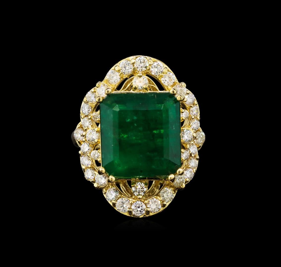 One electronically tested 14KT yellow gold ladies cast emerald and diamond ring with a bright polish finish. Identified with markings of "14K". Condition is new. Containing: One prong set emerald standard step cut natural emerald, measuring 12.70 x 12.00. x 8.31mm, approximate weight of 9.30ct., clarity is heavily included, type III, medium dark, strong, green color, (GIA G 6/5), cut is good. Twenty-One prong set round brilliant cut diamonds, measuring 2.10 - 2.10 x 1.26mm (depth est.) approximate total weight of 21 Stones = 0.71ct. Clarity: SI-1 to SI-2. Color: I - J, Cut is Good. Colored gemstones are presumed to have been subjected to commonly used enhancement processes. All diamonds and colored gemstones are graded in the mounting, unless otherwise stated. Total Weight of Colored Stones 9.30ct. Total Weight of Diamonds 0.71ct. Total Weight of Ring 10.60 grams. GGL Appraised at $6,270.00.