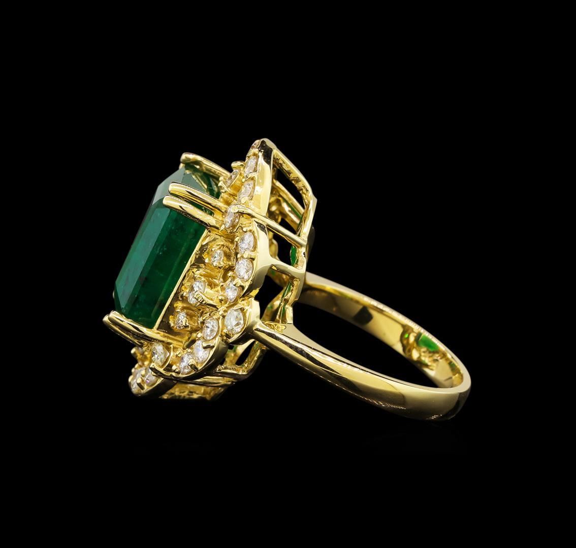 One electronically tested 14KT yellow gold ladies cast emerald and diamond ring with a bright polish finish. Identified with markings of "14K". Condition is new. Containing: One prong set emerald standard step cut natural emerald, measuring 12.70 x 12.00. x 8.31mm, approximate weight of 9.30ct., clarity is heavily included, type III, medium dark, strong, green color, (GIA G 6/5), cut is good. Twenty-One prong set round brilliant cut diamonds, measuring 2.10 - 2.10 x 1.26mm (depth est.) approximate total weight of 21 Stones = 0.71ct. Clarity: SI-1 to SI-2. Color: I - J, Cut is Good. Colored gemstones are presumed to have been subjected to commonly used enhancement processes. All diamonds and colored gemstones are graded in the mounting, unless otherwise stated. Total Weight of Colored Stones 9.30ct. Total Weight of Diamonds 0.71ct. Total Weight of Ring 10.60 grams. GGL Appraised.