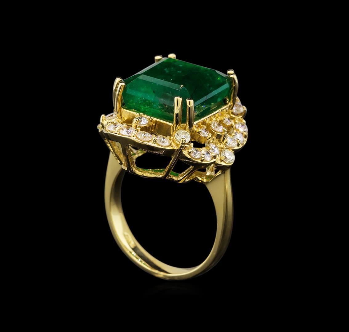 One electronically tested 14KT yellow gold ladies cast emerald and diamond ring with a bright polish finish. Identified with markings of "14K". Condition is new. Containing: One prong set emerald standard step cut natural emerald, measuring 12.70 x 12.00. x 8.31mm, approximate weight of 9.30ct., clarity is heavily included, type III, medium dark, strong, green color, (GIA G 6/5), cut is good. Twenty-One prong set round brilliant cut diamonds, measuring 2.10 - 2.10 x 1.26mm (depth est.) approximate total weight of 21 Stones = 0.71ct. Clarity: SI-1 to SI-2. Color: I - J, Cut is Good. Colored gemstones are presumed to have been subjected to commonly used enhancement processes. All diamonds and colored gemstones are graded in the mounting, unless otherwise stated. Total Weight of Colored Stones 9.30ct. Total Weight of Diamonds 0.71ct. Total Weight of Ring 10.60 grams. GGL Appraised.