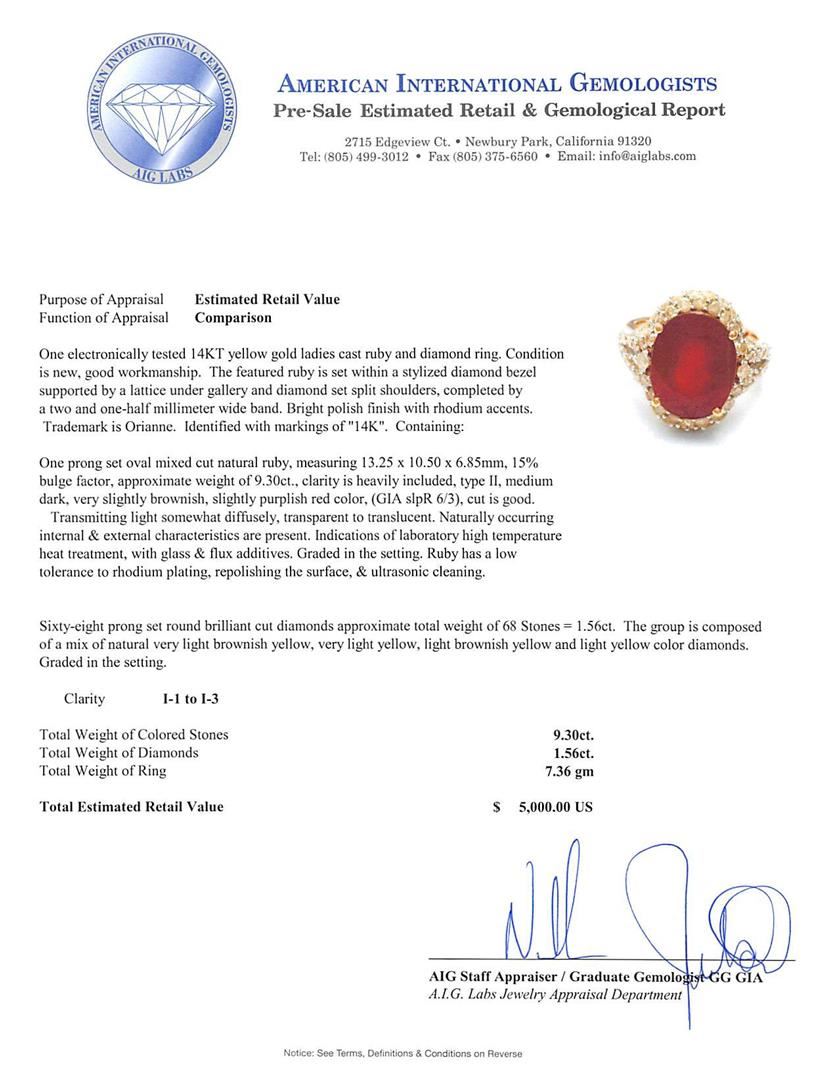 One electronically tested 14KT yellow gold ladies cast ruby and diamond ring. The featured ruby is set within a stylized diamond bezel supported by a lattice under gallery and diamond set split shoulders, completed by a two and one-half millimeter wide band. Bright polish finish with rhodium accents. Trademark is Orianne. Identified with markings of "14K". Condition is new, good workmanship. Containing: One prong set oval mixed cut natural ruby, measuring 13.25 x 10.50 x 6.85mm, 15%. bulge factor, approximate weight of 9.30ct., clarity is heavily included, type II, medium dark, very slightly brownish, slightly purplish red color, (GIA slpR 6/3), cut is good. Transmitting light somewhat diffusely, transparent to translucent. Naturally occurring internal & external characteristics are present. Indications of laboratory high temperature heat treatment, with glass & flux additives. Graded in the setting. Ruby has a low tolerance to rhodium plating, repolishing the surface, & ultrasonic cleaning. Sixty-Eight prong set round brilliant cut diamonds approximate total weight of 68 Stones = 1.56ct. The group is composed of a mix of natural very light brownish yellow, very light yellow, light brownish yellow and light yellow color diamonds. Graded in the setting. Clarity: I-1 to I-3. Total Weight of Colored Stones 9.30ct. Total Weight of Diamonds 1.56ct. Total Weight of Ring 7.36gm. AIG Appraised at $5,000.00.