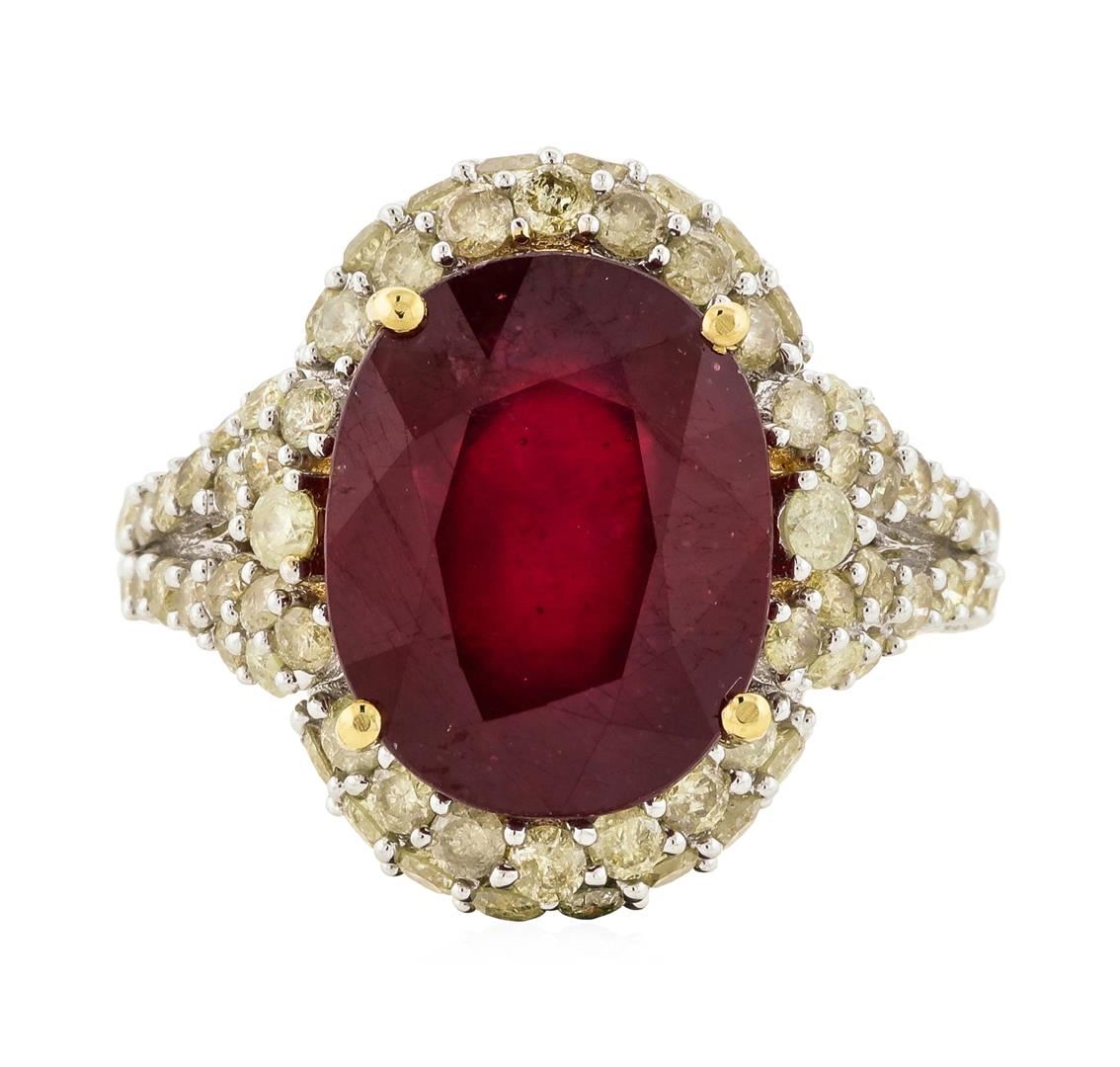 One electronically tested 14KT yellow gold ladies cast ruby and diamond ring. The featured ruby is set within a stylized diamond bezel supported by a lattice under gallery and diamond set split shoulders, completed by a two and one-half millimeter wide band. Bright polish finish with rhodium accents. Trademark is Orianne. Identified with markings of "14K". Condition is new, good workmanship. Containing: One prong set oval mixed cut natural ruby, measuring 13.25 x 10.50 x 6.85mm, 15%. bulge factor, approximate weight of 9.30ct., clarity is heavily included, type II, medium dark, very slightly brownish, slightly purplish red color, (GIA slpR 6/3), cut is good. Transmitting light somewhat diffusely, transparent to translucent. Naturally occurring internal & external characteristics are present. Indications of laboratory high temperature heat treatment, with glass & flux additives. Graded in the setting. Ruby has a low tolerance to rhodium plating, repolishing the surface, & ultrasonic cleaning. Sixty-Eight prong set round brilliant cut diamonds approximate total weight of 68 Stones = 1.56ct. The group is composed of a mix of natural very light brownish yellow, very light yellow, light brownish yellow and light yellow color diamonds. Graded in the setting. Clarity: I-1 to I-3. Total Weight of Colored Stones 9.30ct. Total Weight of Diamonds 1.56ct. Total Weight of Ring 7.36gm. AIG Appraised.