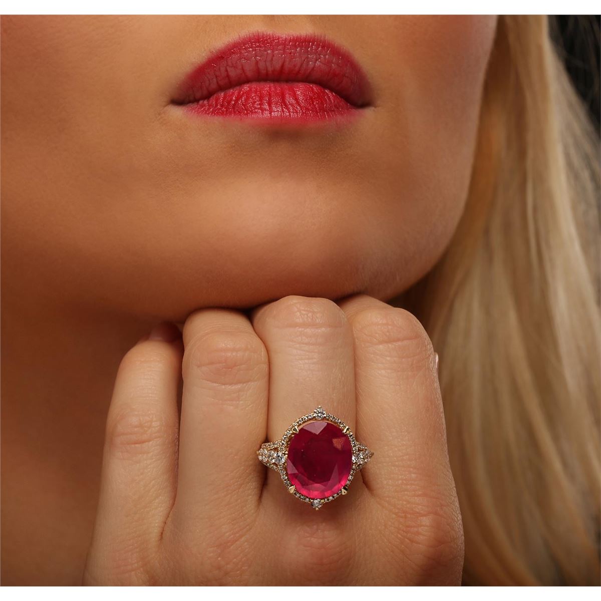 One electronically tested 14KT yellow gold ladies combination cast & assembled ring with a bright polish finish. Condition is new. Identified with markings of "14K". Containing: One prong set oval modified brilliant cut natural ruby, measuring 15.00 x 12.92 x 6.00mm, approximate weight of 9.35ct., clarity is heavily included, type II, medium, moderately strong, strongly purplish red color, (GIA stpR 5/4), cut is good. Ten prong set round brilliant cut diamonds, measuring 2.80 - 2.00 x 1.44mm (depth est.) approximate total weight of 10 Stones = 0.51ct. Clarity: SI-2 to I-1. Color: I - J, Cut is Good. Seventy-Two prong set round brilliant cut diamonds, measuring 1.00 - 1.00 x 0.60mm (depth est.) approximate total weight of 72 Stones = 0.26ct. Clarity: I-1 to I-2. Color: J - K, Cut is Good. Colored gemstones are presumed to have been subjected to commonly used enhancement processes. All diamonds and colored gemstones are graded in the mounting, unless otherwise stated. Total Weight of Colored Stones 9.35ct. Total Weight of Diamonds 0.77ct. Total Weight of Ring 8.60 grams. GGL Appraised at $8,310.00.