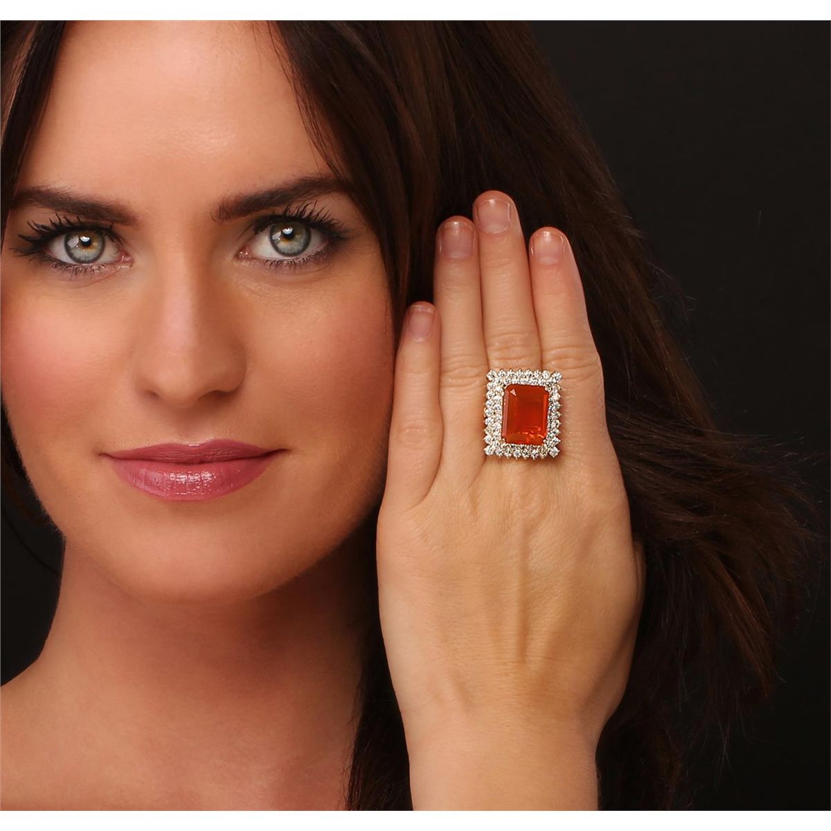 One electronically tested 14KT yellow gold ladies combination cast & assembled ring with a bright polish finish. Identified with markings of "K14". Condition is new. Containing: One fire opal that is cut in a rectangular shape and is prong set, measuring 17.20 mm long x 13.00 mm wide, and 7.80 mm thick and the approximate weight is 9.37 carats. The opal has a bright orange color; good cut; no inclusions; consistent in its brightness and pattern; and is not directional. Fifty-Six prong set round brilliant cut diamonds, measuring 2.50 - 2.30 x 1.44mm (depth est.) approximate total weight of 56 Stones = 2.83ct. Clarity: SI-1 to SI-2. Color: M - N, Cut is Good. Colored gemstones are presumed to have been subjected to commonly used enhancement processes. All diamonds and colored gemstones are graded in the mounting, unless otherwise stated. Total Weight of Diamonds 2.83ct. Total Weight of Opals 9.37ct. Total Weight of Ring 14.30 grams. GGL Appraised at $14,300.00.