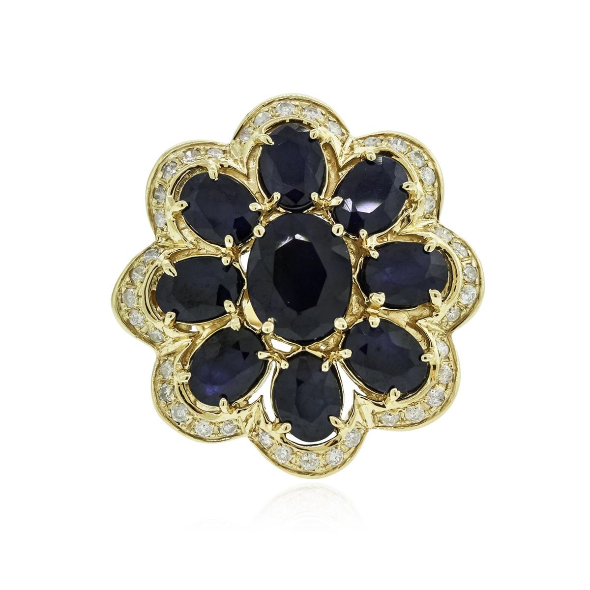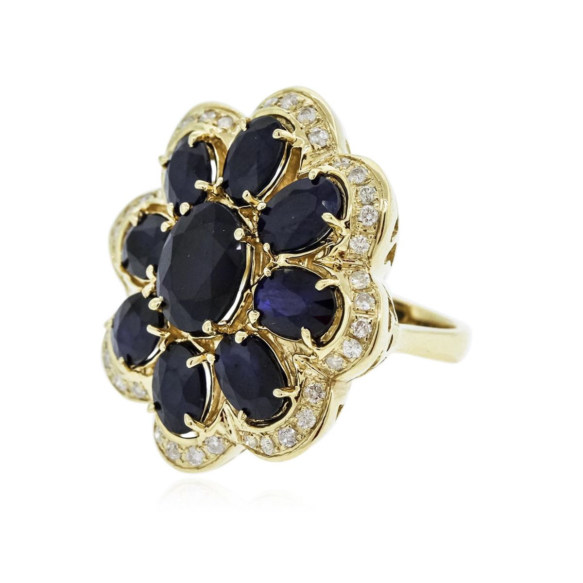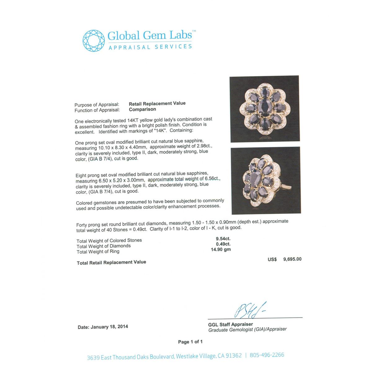 One electronically tested 14KT yellow gold Ladies combination cast & assembled fashion ring with a bright polish finish. Identified with markings of "14K". Condition is excellent. Containing: One prong set oval modified brilliant cut natural blue sapphire, measuring 10.10 x 8.30 x 4.40mm, approximate weight of 2.98ct., clarity is severely included, type II, dark, moderately strong, blue color, (GIA B 7/4), cut is good. Eight prong set oval modified brilliant cut natural blue sapphires, measuring 6.50 x 5.20 x 3.00mm, approximate total weight of 6.56ct., clarity is severely included, type II, dark, moderately strong, blue color, (GIA B 7/4), cut is good. Colored gemstones are presumed to have been subjected to commonly used and possible undetectable color/clarity enhancement processes. Forty prong set round brilliant cut diamonds, measuring 1.50 - 1.50 x 0.90mm (depth est.) approximate total weight of 40 Stones = 0.49ct. Clarity of I-1 to I-2, Color of I - K, Cut is Good. Total Weight of Colored Stones 9.54ct. Total Weight of Diamonds 0.49ct. Total Weight of Ring 14.90gm. GGL Appraised at $9,695.00.