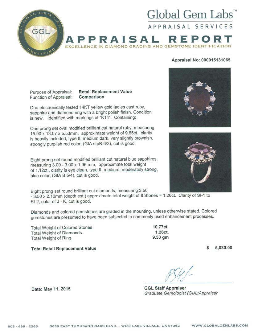 One electronically tested 14KT yellow gold ladies cast ruby, sapphire and diamond ring with a bright polish finish. Identified with markings of "K14". Condition is new. Containing: One prong set oval modified brilliant cut natural ruby, measuring 15.90 x GGL Appraised at $5,030.00.