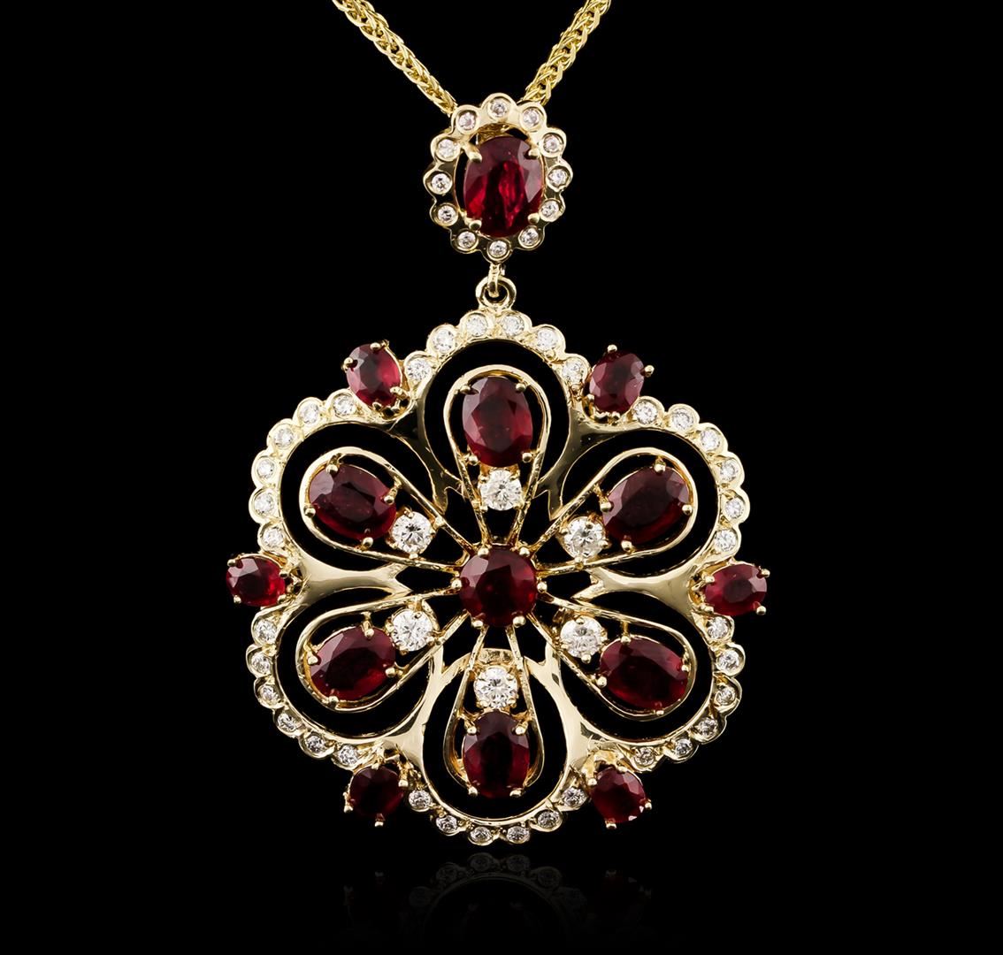 One electronically tested 14KT yellow gold ladies cast ruby and diamond pendant & chain 20.0" long, with a lobster claw clasp with a bright polish finish. Identified with markings of "14K". Condition is new. Containing: One prong set oval modified brilliant cut natural ruby, measuring 8.00 x 6.00 x 3.90mm, approximate weight of 1.59ct., clarity is heavily included, medium dark, moderately strong, strongly purplish red color, (GIA stpR 6/4), cut is good. Six prong set oval modified brilliant cut natural rubies, measuring 7.00 x 5.00 x 3.25mm, approximate total weight of 5.82ct., clarity is heavily included, medium dark, moderately strong, strongly purplish red color, (GIA stpR 6/4), cut is good. Six prong set oval modified brilliant cut natural rubies, measuring 5.00 x 3.00 x 1.95mm, approximate total weight of 1.50ct., clarity is heavily included, type II, medium dark, moderately strong, strongly purplish red color, (GIA stpR 6/4), cut is good. One prong set round modified brilliant cut natural ruby, measuring 5.60 - 5.60 x 3.64 mm, approximate weight of 0.91ct., clarity is moderately included, type II, medium dark, moderately strong, strongly purplish red color, (GIA stpR 6/4), cut is good. Six prong set round brilliant cut diamonds, measuring 3.10 - 3.10 x 1.86mm (depth est.) approximate total weight of 6 Stones = 0.65ct. Clarity: SI-1 to SI-2. Color: J - K, Cut is Good. Forty-Eight prong set round brilliant cut diamonds, measuring 1.30 - 1.30 x 0.78mm (depth est.) approximate total weight of 48 Stones = 0.38ct. Clarity: SI-1 to SI-2. Color: J - K, Cut is Good. Colored gemstones are presumed to have been subjected to commonly used enhancement processes. All diamonds and colored gemstones are graded in the mounting, unless otherwise stated. Total Weight of Colored Stones 9.82ct. Total Weight of Diamonds 1.04ct. Total Weight of Pendant & Chain 17.50 grams. GGL Appraised at $5,430.00.