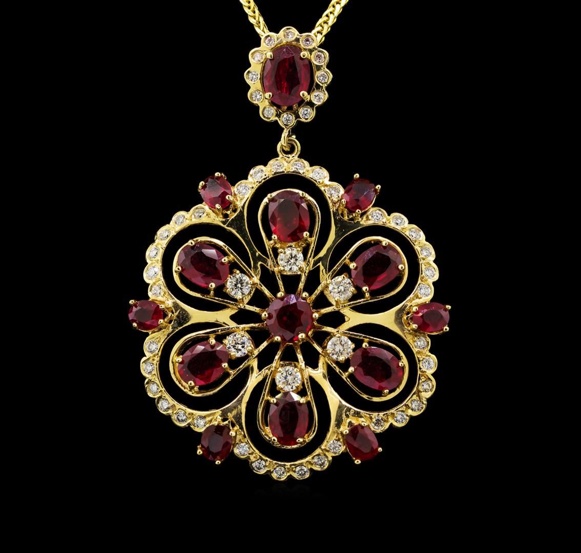 One electronically tested 14KT yellow gold ladies cast ruby and diamond pendant & chain 20.0" long, with a lobster claw clasp with a bright polish finish. Identified with markings of "14K". Condition is new. Containing: One prong set oval modified brilliant cut natural ruby, measuring 8.00 x 6.00 x 3.90mm, approximate weight of 1.59ct., clarity is heavily included, medium dark, moderately strong, strongly purplish red color, (GIA stpR 6/4), cut is good. Six prong set oval modified brilliant cut natural rubies, measuring 7.00 x 5.00 x 3.25mm, approximate total weight of 5.82ct., clarity is heavily included, medium dark, moderately strong, strongly purplish red color, (GIA stpR 6/4), cut is good. Six prong set oval modified brilliant cut natural rubies, measuring 5.00 x 3.00 x 1.95mm, approximate total weight of 1.50ct., clarity is heavily included, type II, medium dark, moderately strong, strongly purplish red color, (GIA stpR 6/4), cut is good. One prong set round modified brilliant cut natural ruby, measuring 5.60 - 5.60 x 3.64 mm, approximate weight of 0.91ct., clarity is moderately included, type II, medium dark, moderately strong, strongly purplish red color, (GIA stpR 6/4), cut is good. Six prong set round brilliant cut diamonds, measuring 3.10 - 3.10 x 1.86mm (depth est.) approximate total weight of 6 Stones = 0.65ct. Clarity: SI-1 to SI-2. Color: J - K, Cut is Good. Forty-Eight prong set round brilliant cut diamonds, measuring 1.30 - 1.30 x 0.78mm (depth est.) approximate total weight of 48 Stones = 0.38ct. Clarity: SI-1 to SI-2. Color: J - K, Cut is Good. Colored gemstones are presumed to have been subjected to commonly used enhancement processes. All diamonds and colored gemstones are graded in the mounting, unless otherwise stated. Total Weight of Colored Stones 9.82ct. Total Weight of Diamonds 1.04ct. Total Weight of Pendant & Chain 17.50 grams. GGL Appraised at $5,430.00.