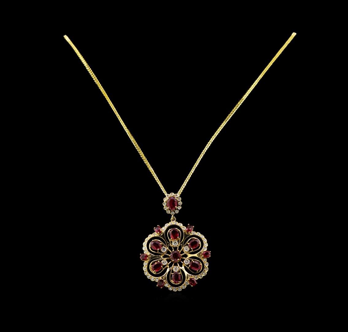 One electronically tested 14KT yellow gold ladies cast ruby and diamond pendant & chain 20.0" long, with a lobster claw clasp with a bright polish finish. Identified with markings of "14K". Condition is new. Containing: One prong set oval modified brilliant cut natural ruby, measuring 8.00 x 6.00 x 3.90mm, approximate weight of 1.59ct., clarity is heavily included, medium dark, moderately strong, strongly purplish red color, (GIA stpR 6/4), cut is good. Six prong set oval modified brilliant cut natural rubies, measuring 7.00 x 5.00 x 3.25mm, approximate total weight of 5.82ct., clarity is heavily included, medium dark, moderately strong, strongly purplish red color, (GIA stpR 6/4), cut is good. Six prong set oval modified brilliant cut natural rubies, measuring 5.00 x 3.00 x 1.95mm, approximate total weight of 1.50ct., clarity is heavily included, type II, medium dark, moderately strong, strongly purplish red color, (GIA stpR 6/4), cut is good. One prong set round modified brilliant cut natural ruby, measuring 5.60 - 5.60 x 3.64 mm, approximate weight of 0.91ct., clarity is moderately included, type II, medium dark, moderately strong, strongly purplish red color, (GIA stpR 6/4), cut is good. Six prong set round brilliant cut diamonds, measuring 3.10 - 3.10 x 1.86mm (depth est.) approximate total weight of 6 Stones = 0.65ct. Clarity: SI-1 to SI-2. Color: J - K, Cut is Good. Forty-Eight prong set round brilliant cut diamonds, measuring 1.30 - 1.30 x 0.78mm (depth est.) approximate total weight of 48 Stones = 0.38ct. Clarity: SI-1 to SI-2. Color: J - K, Cut is Good. Colored gemstones are presumed to have been subjected to commonly used enhancement processes. All diamonds and colored gemstones are graded in the mounting, unless otherwise stated. Total Weight of Colored Stones 9.82ct. Total Weight of Diamonds 1.04ct. Total Weight of Pendant & Chain 17.50 grams. GGL Appraised at $5,430.00.