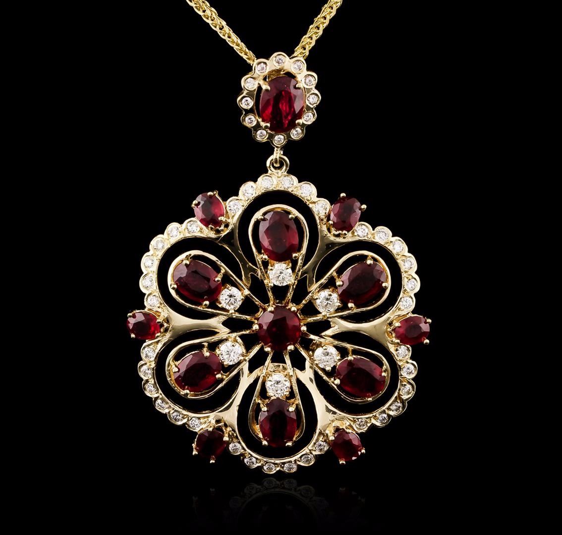 One electronically tested 14KT yellow gold ladies cast ruby and diamond pendant & chain 20.0" long, with a lobster claw clasp with a bright polish finish. Identified with markings of "14K". Condition is new. Containing: One prong set oval modified brilliant cut natural ruby, measuring 8.00 x 6.00 x 3.90mm, approximate weight of 1.59ct., clarity is heavily included, medium dark, moderately strong, strongly purplish red color, (GIA stpR 6/4), cut is good. Six prong set oval modified brilliant cut natural rubies, measuring 7.00 x 5.00 x 3.25mm, approximate total weight of 5.82ct., clarity is heavily included, medium dark, moderately strong, strongly purplish red color, (GIA stpR 6/4), cut is good. Six prong set oval modified brilliant cut natural rubies, measuring 5.00 x 3.00 x 1.95mm, approximate total weight of 1.50ct., clarity is heavily included, type II, medium dark, moderately strong, strongly purplish red color, (GIA stpR 6/4), cut is good. One prong set round modified brilliant cut natural ruby, measuring 5.60 - 5.60 x 3.64 mm, approximate weight of 0.91ct., clarity is moderately included, type II, medium dark, moderately strong, strongly purplish red color, (GIA stpR 6/4), cut is good. Six prong set round brilliant cut diamonds, measuring 3.10 - 3.10 x 1.86mm (depth est.) approximate total weight of 6 Stones = 0.65ct. Clarity: SI-1 to SI-2. Color: J - K, Cut is Good. Forty-Eight prong set round brilliant cut diamonds, measuring 1.30 - 1.30 x 0.78mm (depth est.) approximate total weight of 48 Stones = 0.38ct. Clarity: SI-1 to SI-2. Color: J - K, Cut is Good. Colored gemstones are presumed to have been subjected to commonly used enhancement processes. All diamonds and colored gemstones are graded in the mounting, unless otherwise stated. Total Weight of Colored Stones 9.82ct. Total Weight of Diamonds 1.04ct. Total Weight of Pendant & Chain 17.50 grams. GGL Appraised at $5,430.00.