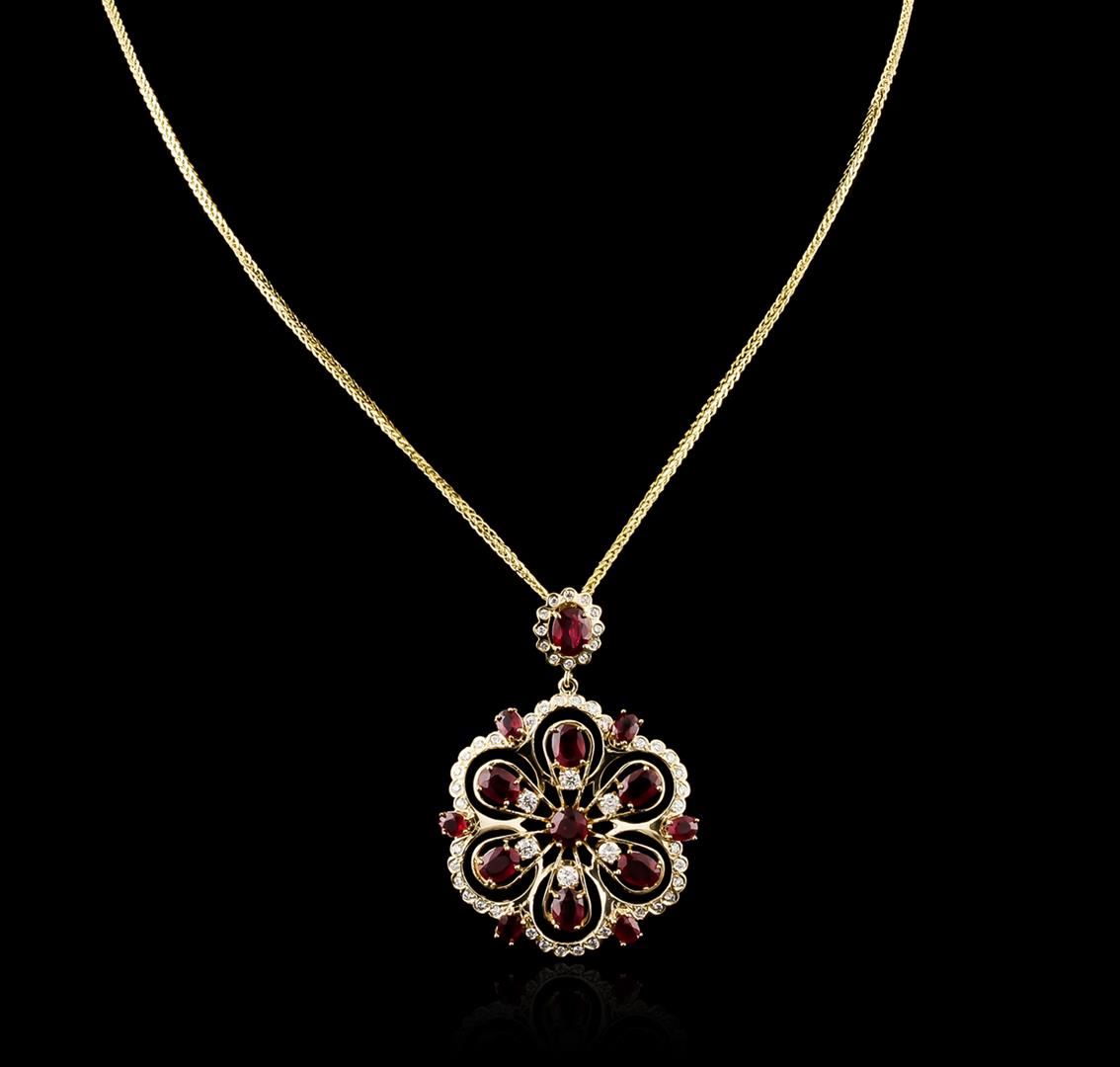 One electronically tested 14KT yellow gold ladies cast ruby and diamond pendant & chain 20.0" long, with a lobster claw clasp with a bright polish finish. Identified with markings of "14K". Condition is new. Containing: One prong set oval modified brilliant cut natural ruby, measuring 8.00 x 6.00 x 3.90mm, approximate weight of 1.59ct., clarity is heavily included, medium dark, moderately strong, strongly purplish red color, (GIA stpR 6/4), cut is good. Six prong set oval modified brilliant cut natural rubies, measuring 7.00 x 5.00 x 3.25mm, approximate total weight of 5.82ct., clarity is heavily included, medium dark, moderately strong, strongly purplish red color, (GIA stpR 6/4), cut is good. Six prong set oval modified brilliant cut natural rubies, measuring 5.00 x 3.00 x 1.95mm, approximate total weight of 1.50ct., clarity is heavily included, type II, medium dark, moderately strong, strongly purplish red color, (GIA stpR 6/4), cut is good. One prong set round modified brilliant cut natural ruby, measuring 5.60 - 5.60 x 3.64 mm, approximate weight of 0.91ct., clarity is moderately included, type II, medium dark, moderately strong, strongly purplish red color, (GIA stpR 6/4), cut is good. Six prong set round brilliant cut diamonds, measuring 3.10 - 3.10 x 1.86mm (depth est.) approximate total weight of 6 Stones = 0.65ct. Clarity: SI-1 to SI-2. Color: J - K, Cut is Good. Forty-Eight prong set round brilliant cut diamonds, measuring 1.30 - 1.30 x 0.78mm (depth est.) approximate total weight of 48 Stones = 0.38ct. Clarity: SI-1 to SI-2. Color: J - K, Cut is Good. Colored gemstones are presumed to have been subjected to commonly used enhancement processes. All diamonds and colored gemstones are graded in the mounting, unless otherwise stated. Total Weight of Colored Stones 9.82ct. Total Weight of Diamonds 1.04ct. Total Weight of Pendant & Chain 17.50 grams. GGL Appraised at $5,430.00.