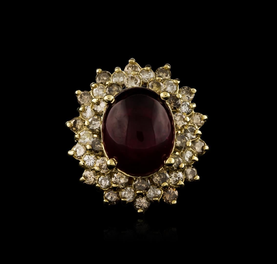One electronically tested 14KT yellow gold ladies cast ruby and diamond ring with a bright polish finish. Identified with markings of "14K". Condition is new. Containing: One prong set oval cabochon cut natural ruby, measuring 13.50 x 11.00 x 6.20mm, approximate weight of 9.94ct., clarity is heavily included, type II, medium dark, moderately strong, strongly purplish red color, (GIA stpR 6/4), cut is good. Forty-Four prong set round brilliant cut diamonds, measuring 2.50 - 2.50 x 1.50mm (depth est.) approximate total weight of 44 Stones = 2.51ct. Clarity: SI-1 to I-1, Cut is Good. Colored gemstones are presumed to have been subjected to commonly used enhancement processes, All diamonds and colored gemstones are graded in the mounting, unless otherwise stated. Total Weight of Colored Stones 9.94ct. Total Weight of Diamonds 2.51ct. Total Weight of Ring 9.50 grams. GGL Appraised at $5,360.00.