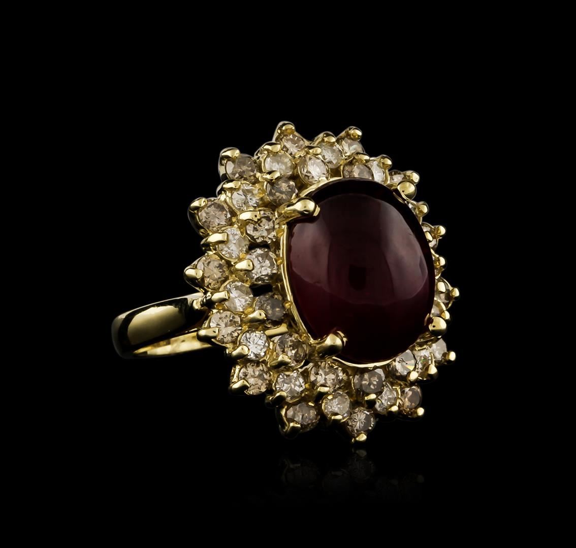 One electronically tested 14KT yellow gold ladies cast ruby and diamond ring with a bright polish finish. Identified with markings of "14K". Condition is new. Containing: One prong set oval cabochon cut natural ruby, measuring 13.50 x 11.00 x 6.20mm, approximate weight of 9.94ct., clarity is heavily included, type II, medium dark, moderately strong, strongly purplish red color, (GIA stpR 6/4), cut is good. Forty-Four prong set round brilliant cut diamonds, measuring 2.50 - 2.50 x 1.50mm (depth est.) approximate total weight of 44 Stones = 2.51ct. Clarity: SI-1 to I-1, Cut is Good. Colored gemstones are presumed to have been subjected to commonly used enhancement processes, All diamonds and colored gemstones are graded in the mounting, unless otherwise stated. Total Weight of Colored Stones 9.94ct. Total Weight of Diamonds 2.51ct. Total Weight of Ring 9.50 grams. GGL Appraised at $5,360.00.