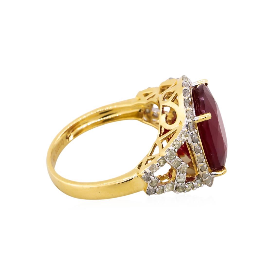 One electronically tested 14KT yellow gold ladies cast ruby and diamond ring. The featured ruby is set within a diamond bezel supported by an elaborate lattice under gallery and stylized diamond set shoulders, completed by a two millimeter wide band. Bright polish finish with rhodium accents. Trademark is Orianne. Identified with markings of "14K". Condition is new, good workmanship. Containing: One prong set oval mixed cut natural ruby approximate weight of 9.99ct., clarity is heavily included, type II, medium dark, very slightly brownish, slightly purplish red color, (GIA slpR 6/3), cut is good. Transmitting light somewhat diffusely, transparent to translucent. Naturally occurring internal & external characteristics are present. Indications of laboratory high temperature heat treatment, with glass & flux additives. Graded in the setting. Ruby has a low tolerance to rhodium plating, repolishing the surface, & ultrasonic cleaning.Sixty prong set round brilliant cut diamonds approximate. Total Weight of 60 Stones = 0.87ct. Graded in the setting. Clarity: I-1 to I-3. Color: I - K. Total Weight of Colored Stones 9.99ct. Total Weight of Diamonds 0.87ct. Total Weight of Ring 5.91gm. AIG Appraised at $4,195.00.