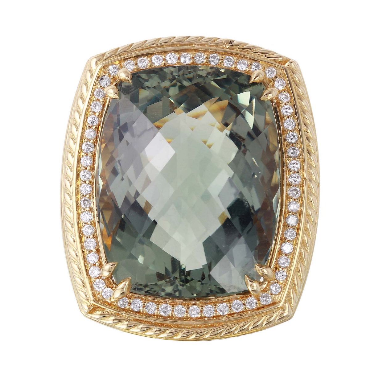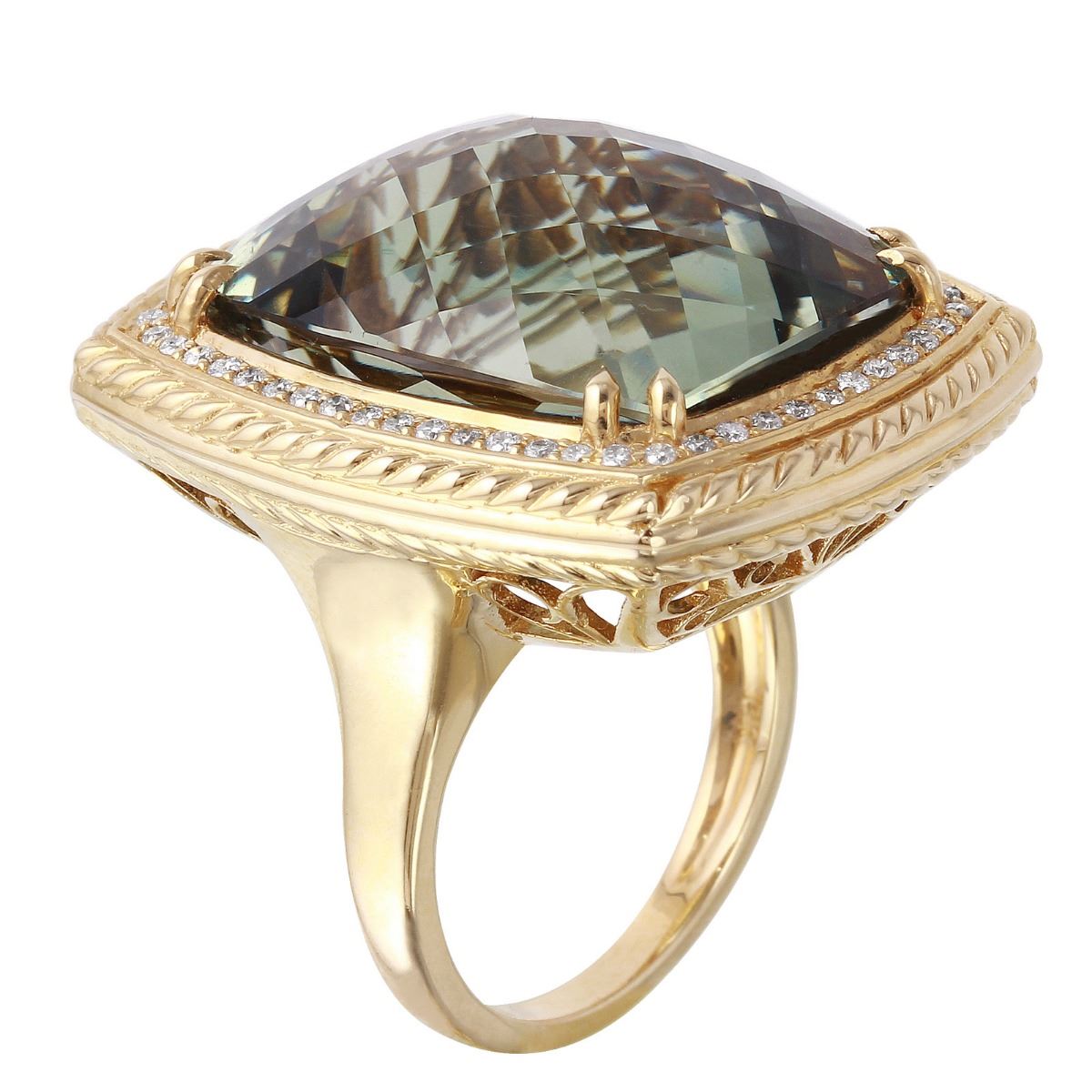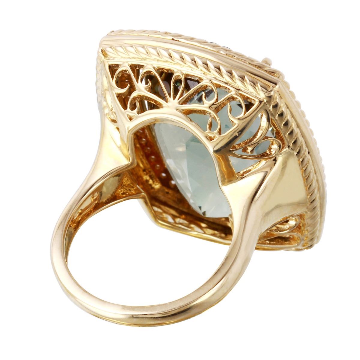 One stamped & tested 14KT yellow gold ladies custom wax & cast green amethyst and diamond ring with a bright polish finish. Size 6. Identified with markings of "14K". Condition is new. Containing: One prong set checkerboard modified mixed cut natural greened amethyst, measuring 32.00 x 27.50 x 14.00mm, approximate weight of 33.05ct., clarity is eye clean, medium light, moderately strong, green color, cut is excellent. Fifty-Six prong set round brilliant cut diamonds, measuring 1.20 - 1.20 x 0.72mm (depth est.) approximate total weight of 56 Stones = 0.36ct. Clarity: VS-1 to VS-2. Color: F, Cut is Very Good. Approximate Total Weight of Colored Stones 33.05ct. Approximate Total Weight of Diamonds 0.36ct. Total Weight of Ring 17.90gm. The descriptions listed should not be construed as an appraisal. The detail is provided as a guideline for color, clarity, weights and measurements to the best of our ability. We welcome inspections. WE SHIP WORLDWIDE!